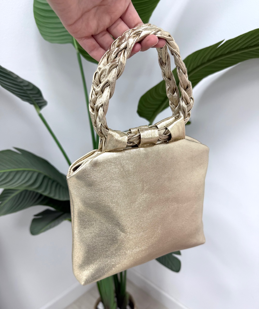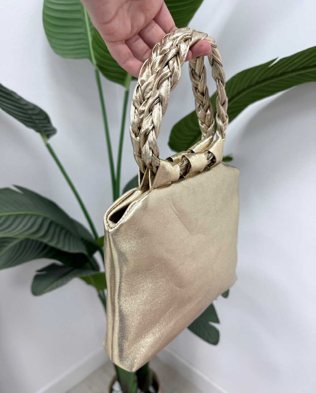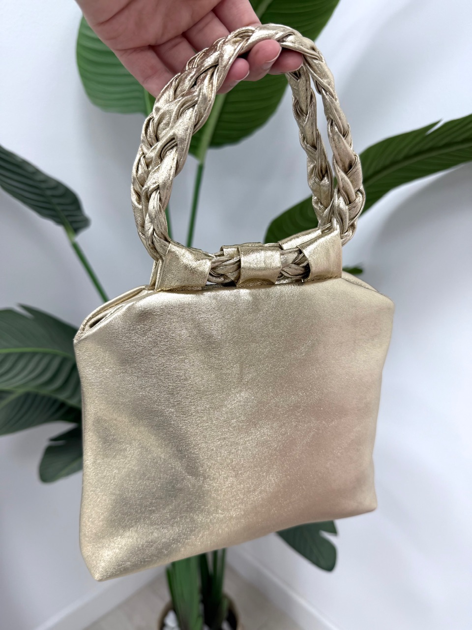 Bolso en tono dorado metálico con acabado brillante. Incluye asa larga dorada para colgar.