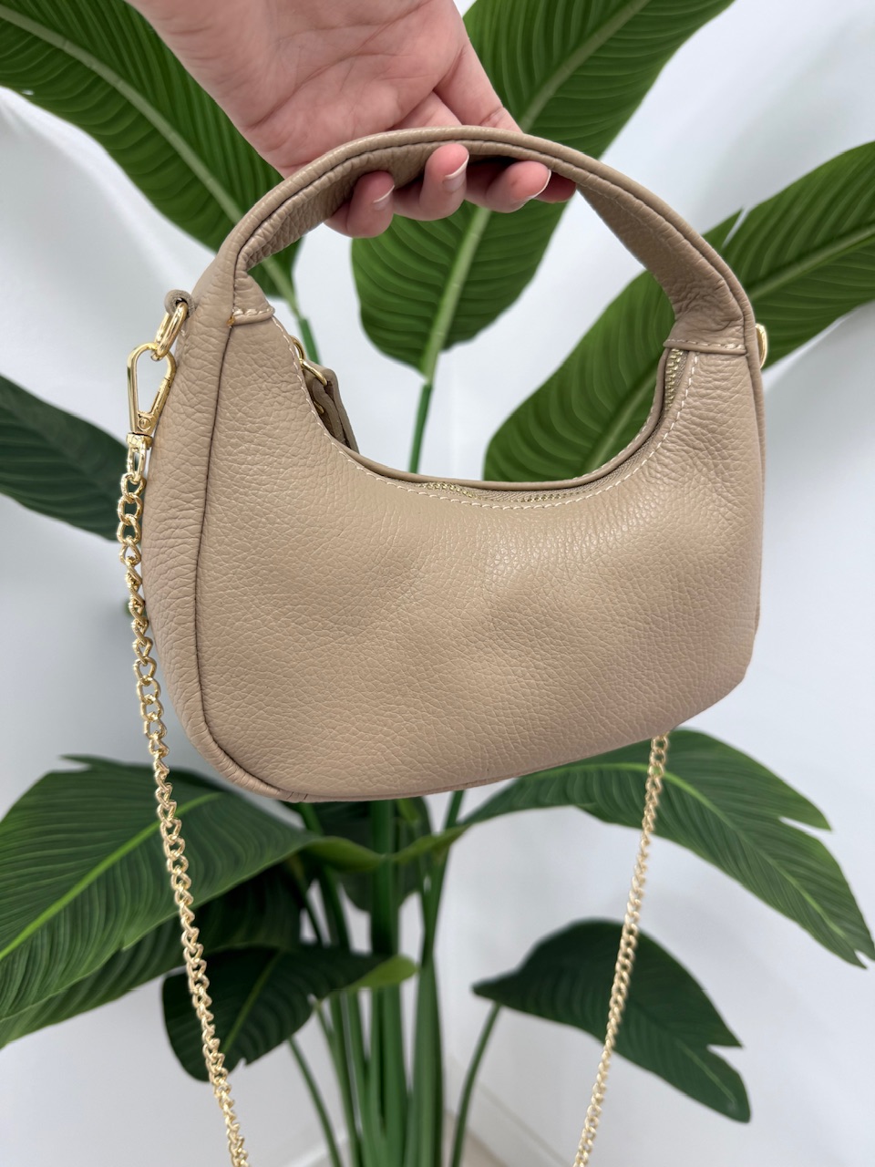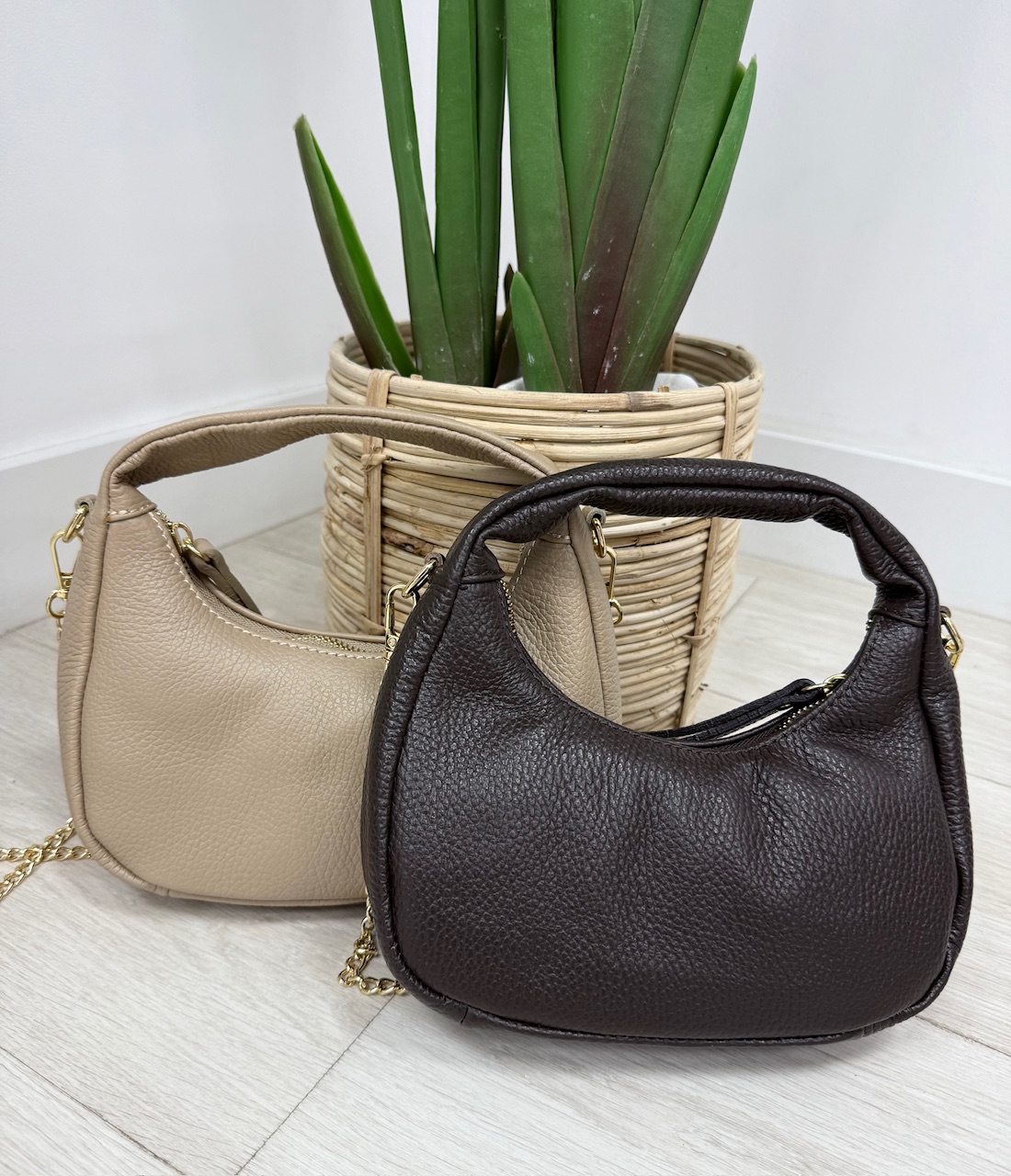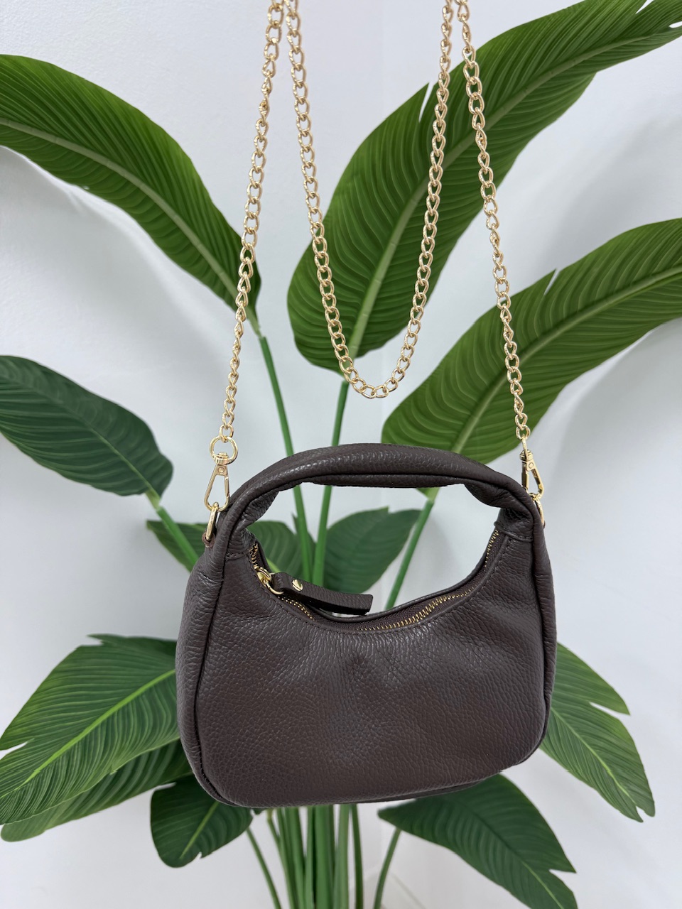 Elegante bolso de hombro confeccionado en polipiel color chocolate y beige, con asa superior y correa de cadena dorada desmontable.