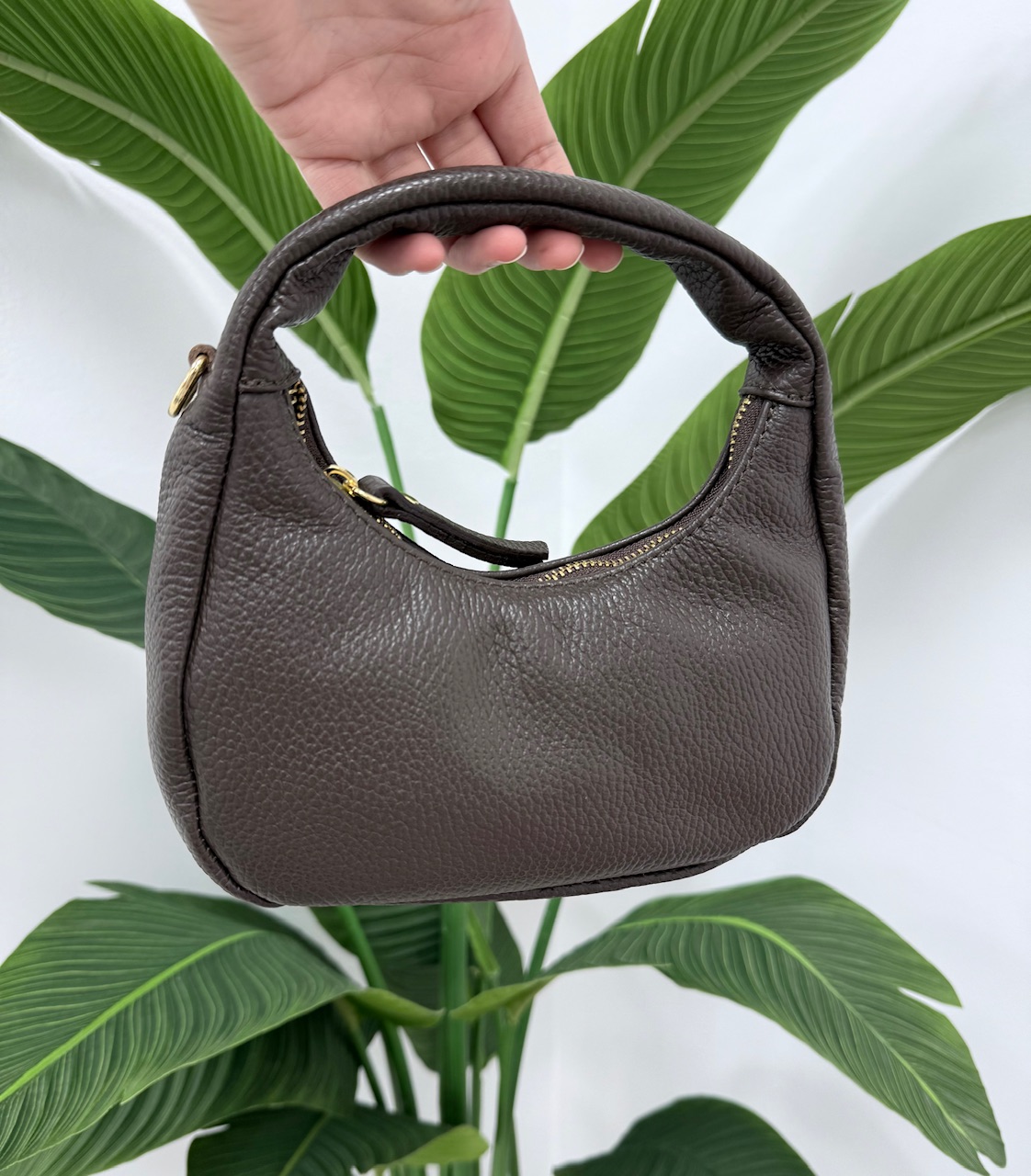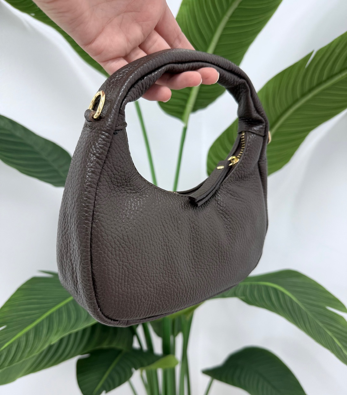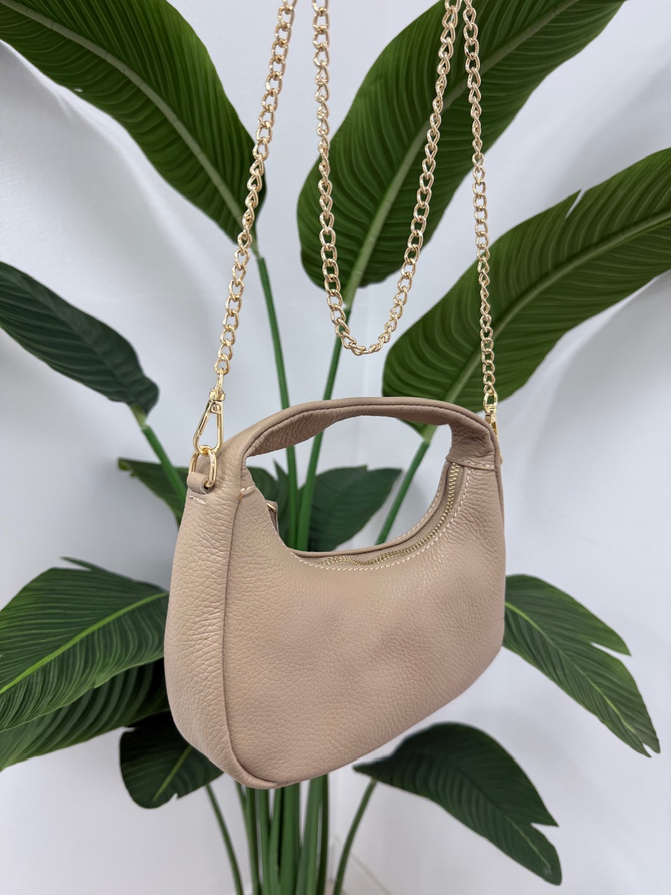 Elegante bolso de hombro confeccionado en polipiel color chocolate y beige, con asa superior y correa de cadena dorada desmontable.