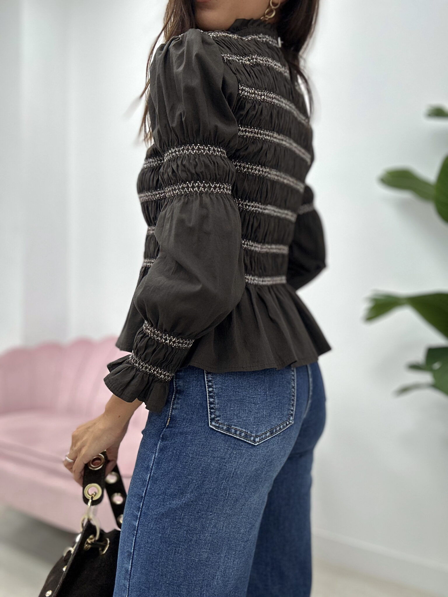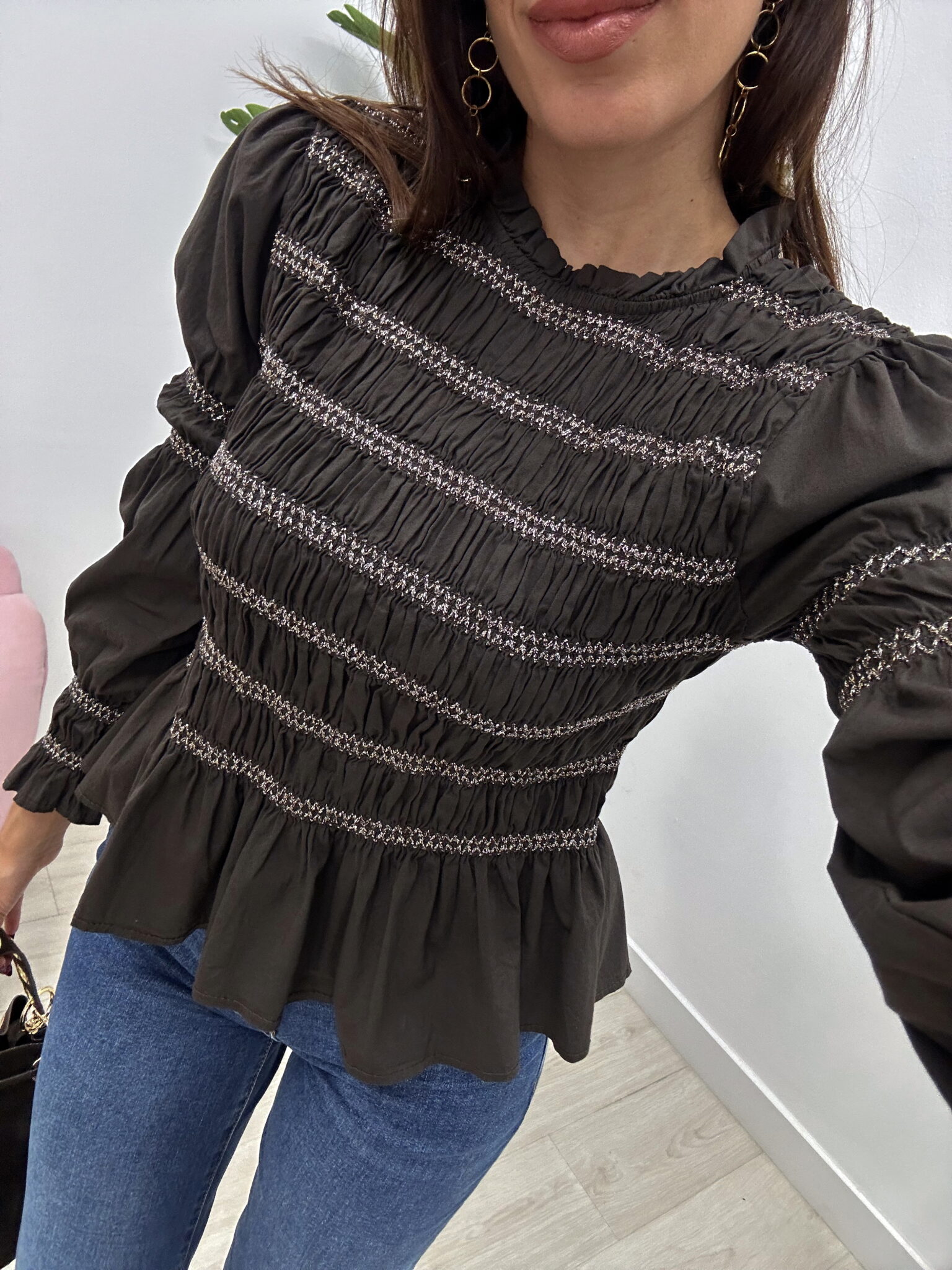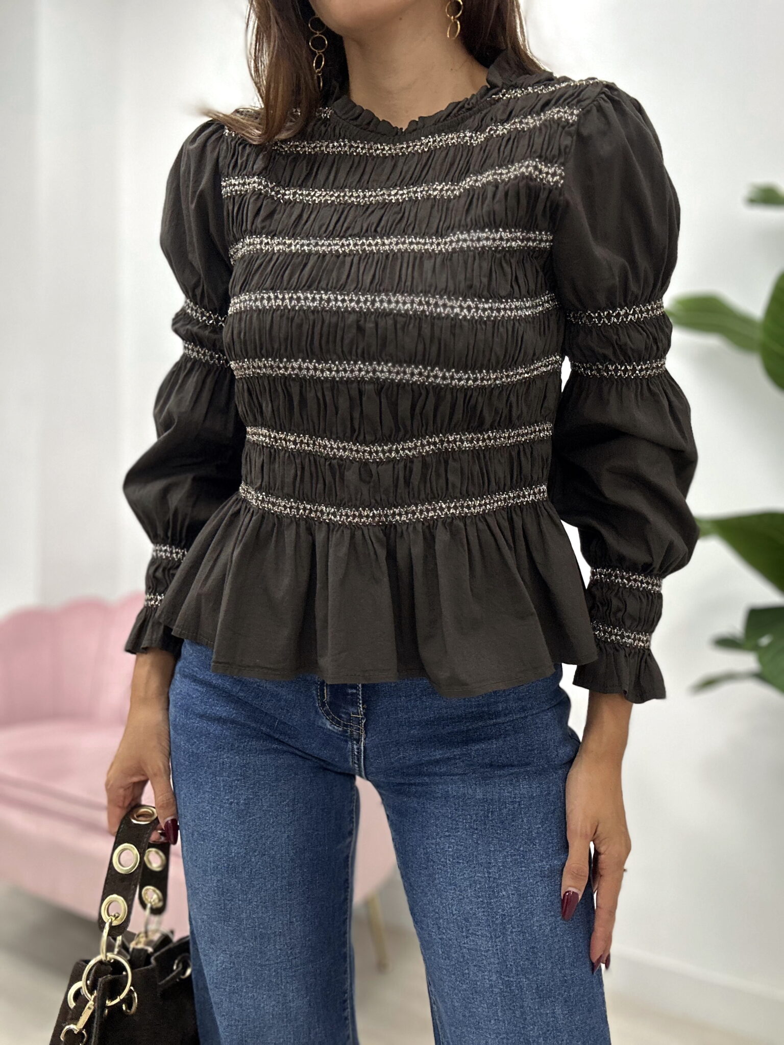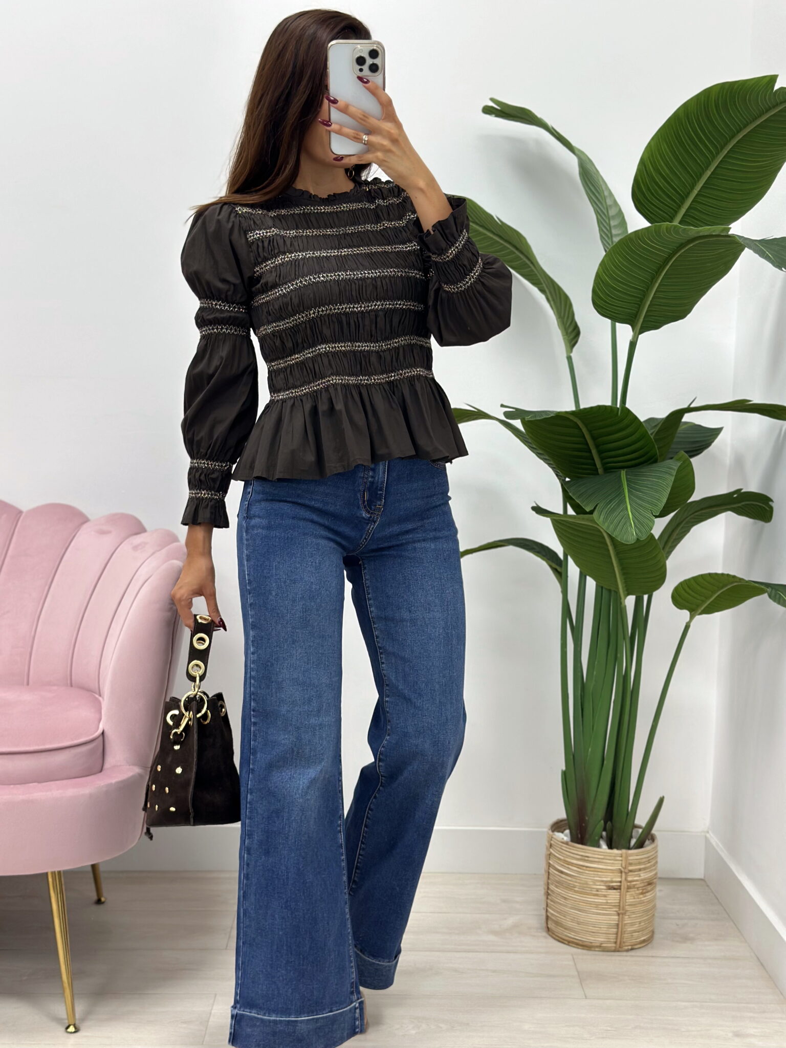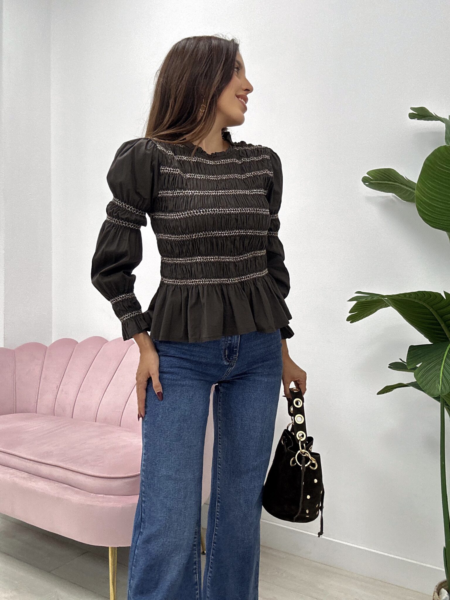 Blusa de manga larga en color marrón, con un diseño elegante que presenta detalles de smock en el torso y un peplum(volante) ligero en la parte inferior. Perfecta para ocasiones casuales o para un look más sofisticado, combina comodidad y estilo en una prenda versátil. Ideal para complementar con jeans o faldas.