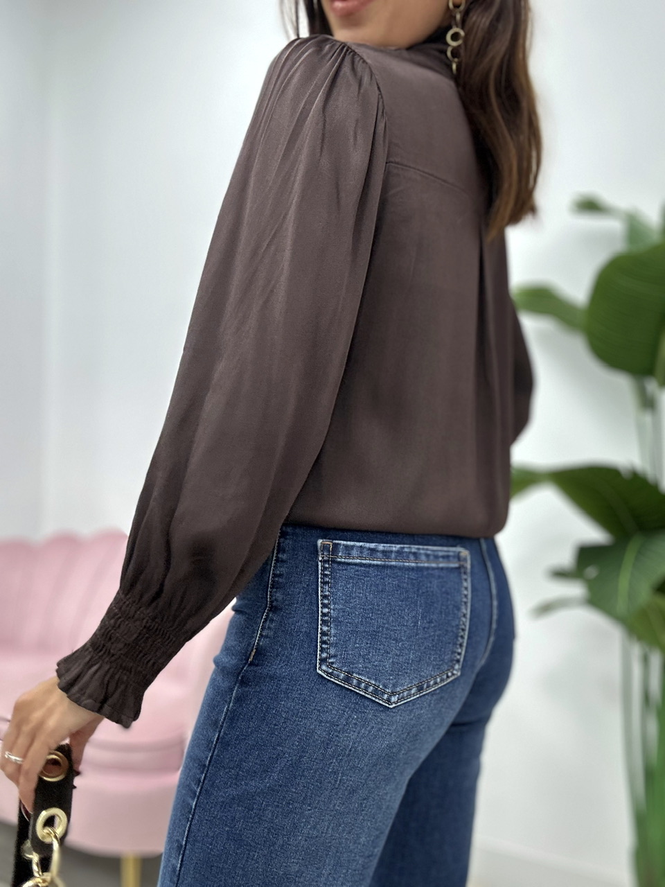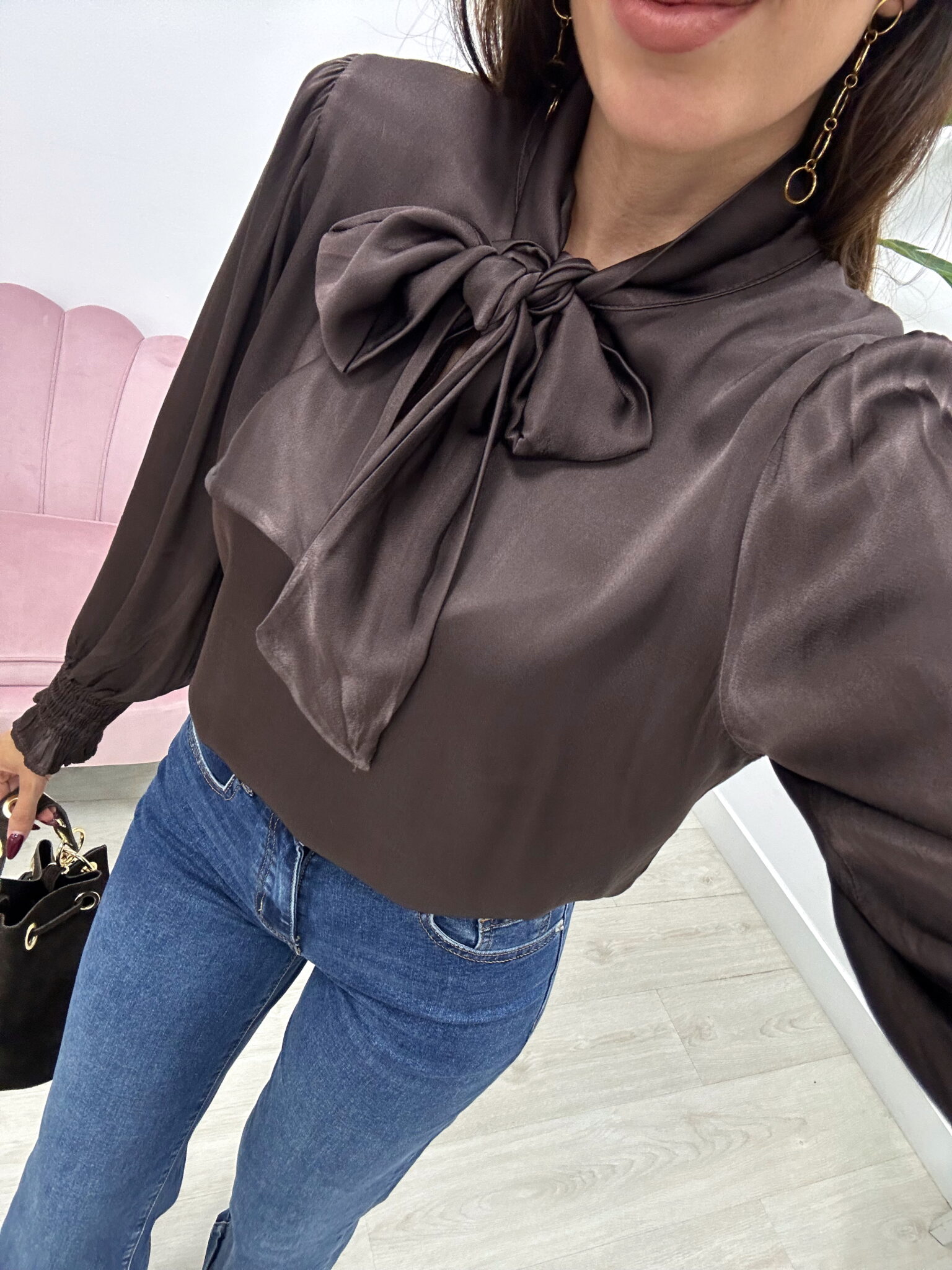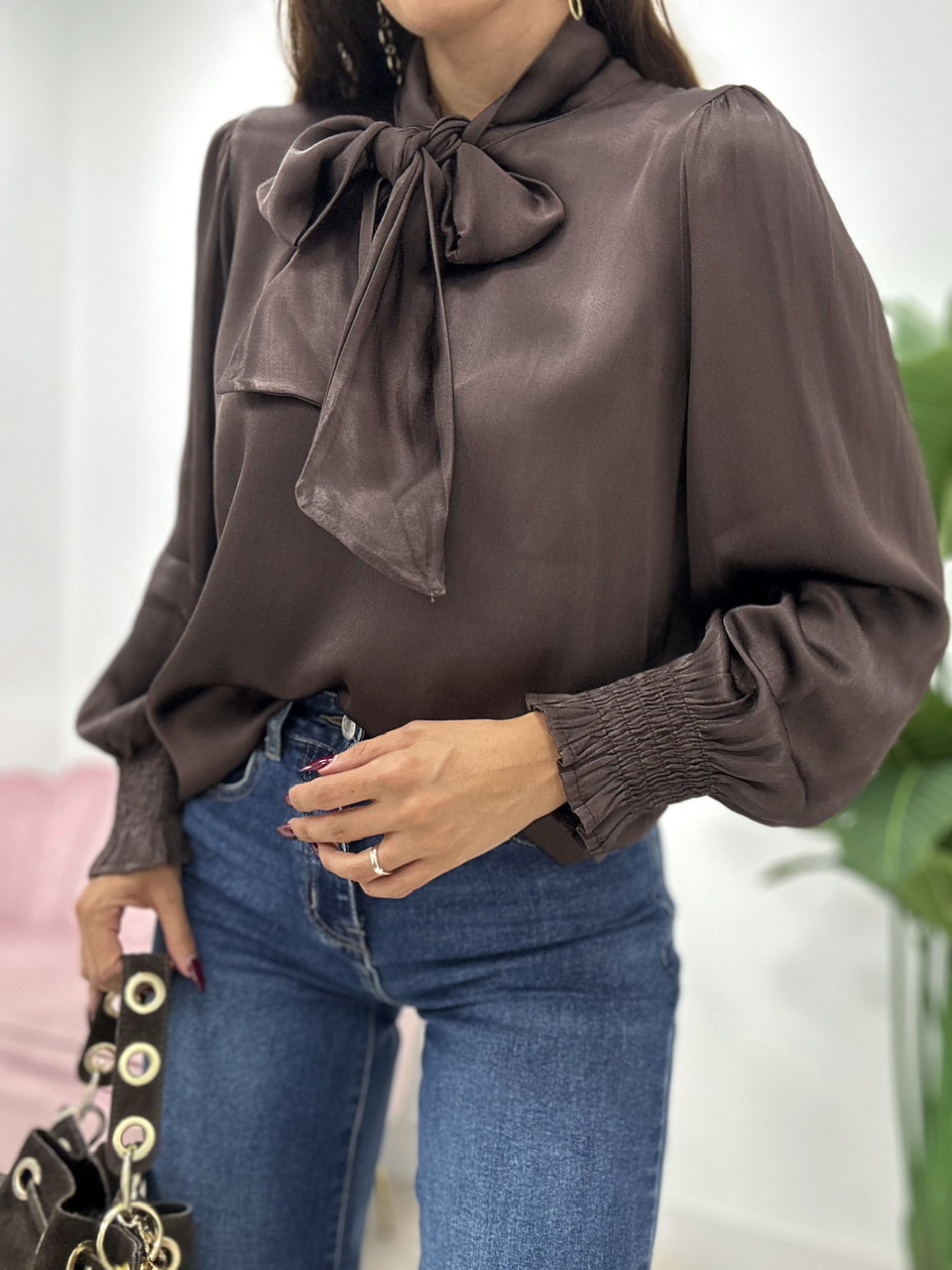 Blusa elegante de satén en un tono marrón, con un delicado lazo en el cuello que añade un toque sofisticado. Sus mangas abullonadas y ajuste cómodo la hacen perfecta tanto para ocasiones formales como para un look más casual. Ideal para combinar con vaqueros o faldas, esta blusa es una pieza versátil que resalta la feminidad y el estilo.