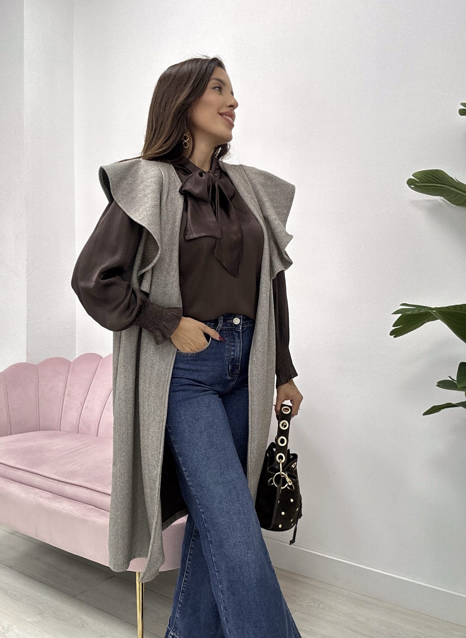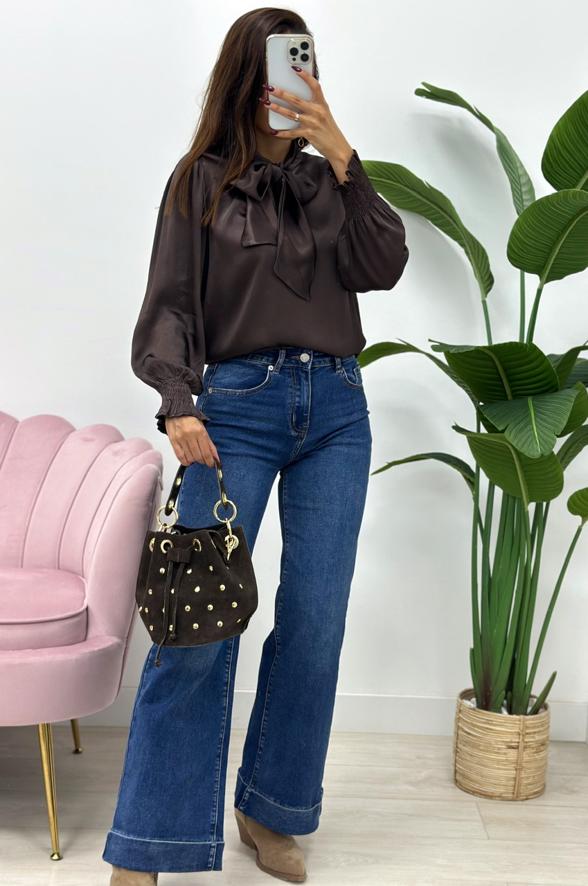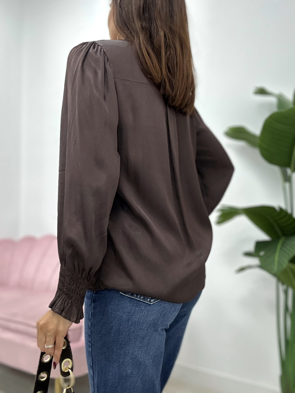 Blusa elegante de satén en un tono marrón, con un delicado lazo en el cuello que añade un toque sofisticado. Sus mangas abullonadas y ajuste cómodo la hacen perfecta tanto para ocasiones formales como para un look más casual. Ideal para combinar con vaqueros o faldas, esta blusa es una pieza versátil que resalta la feminidad y el estilo.