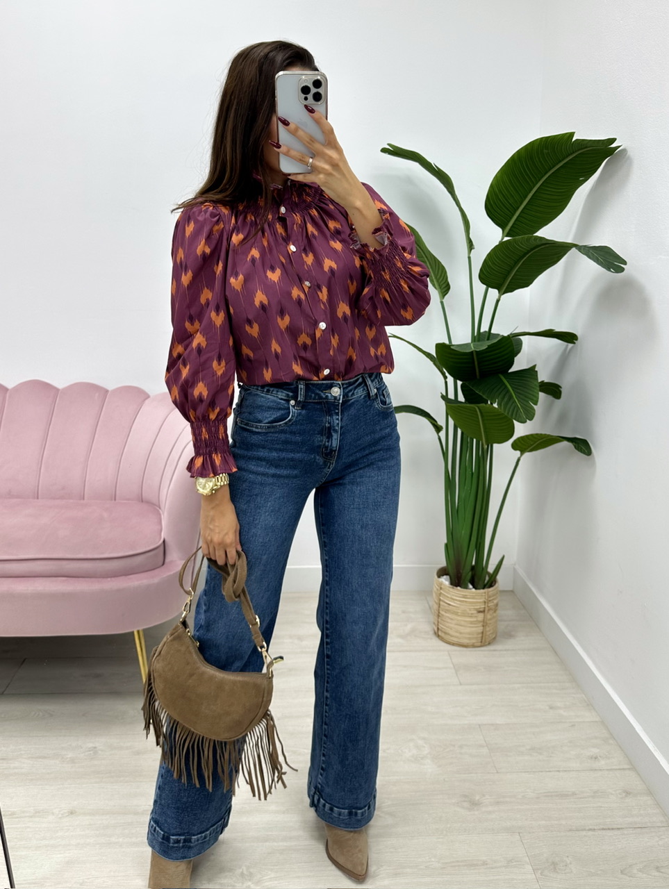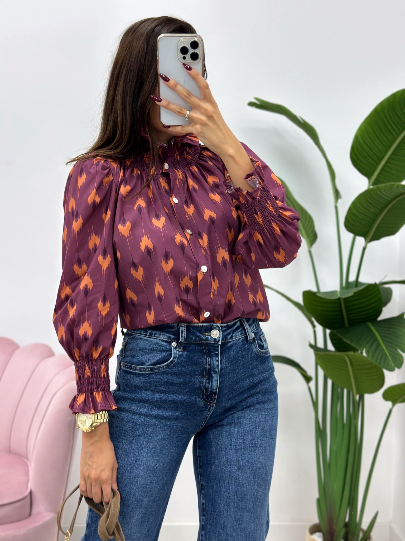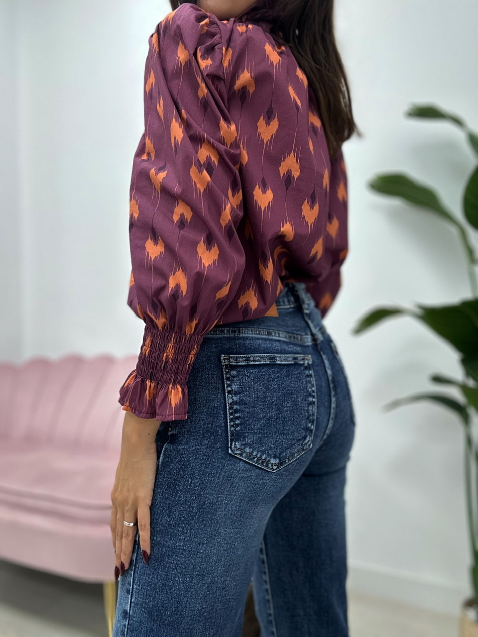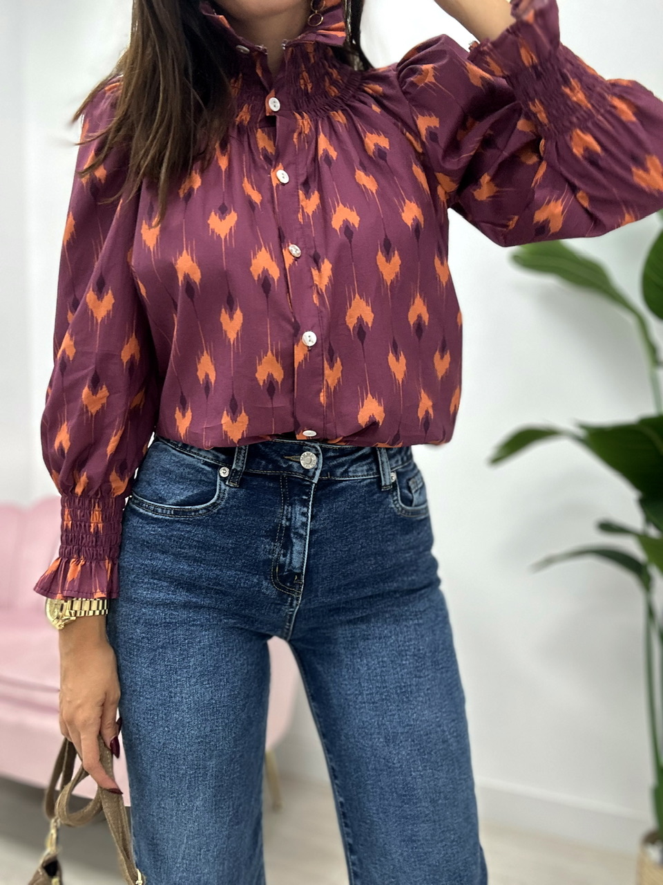Blusa de manga larga con estampado geométrico en tonos morado y naranja. Presenta cuello alto fruncido, puños elásticos con volantes y cierre delantero con botones.