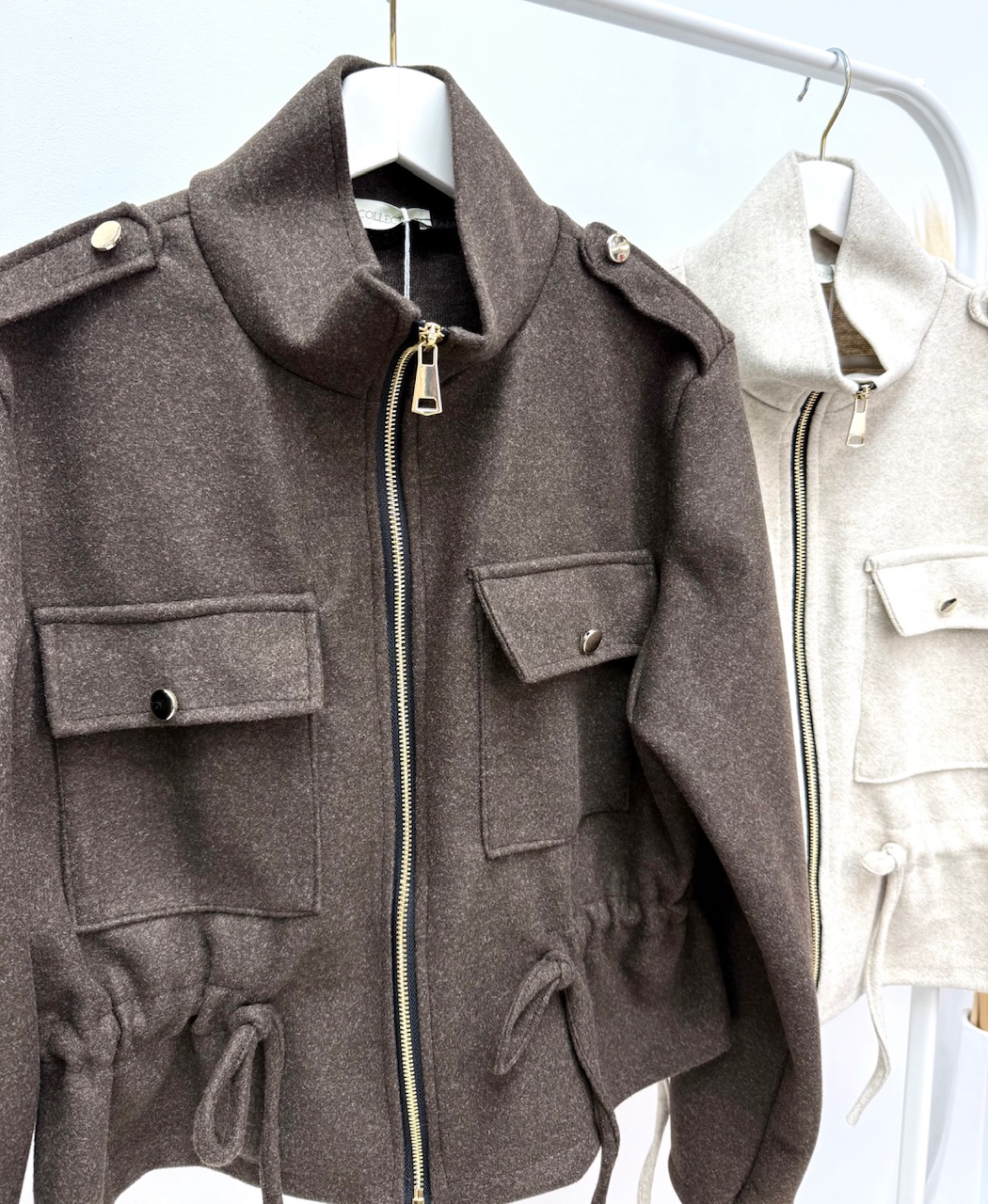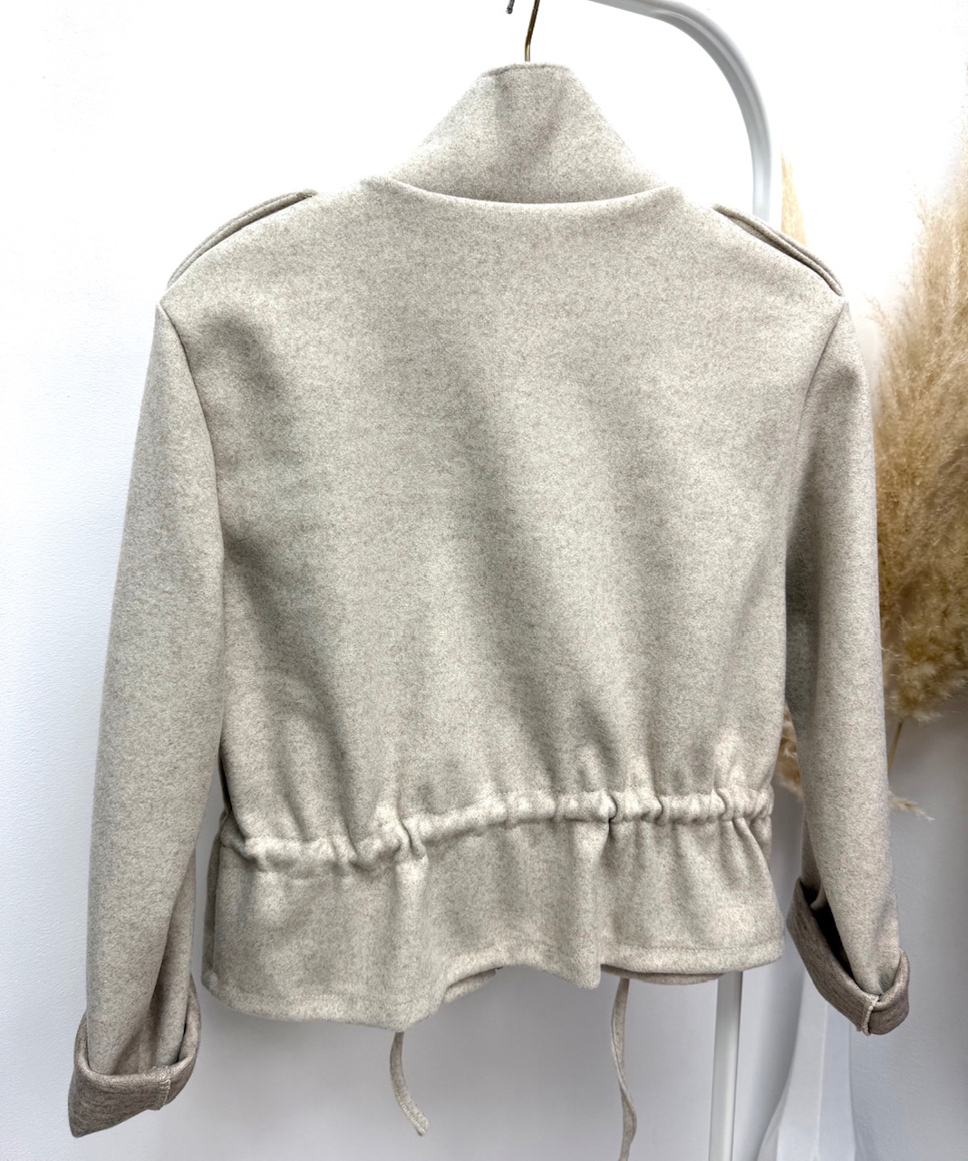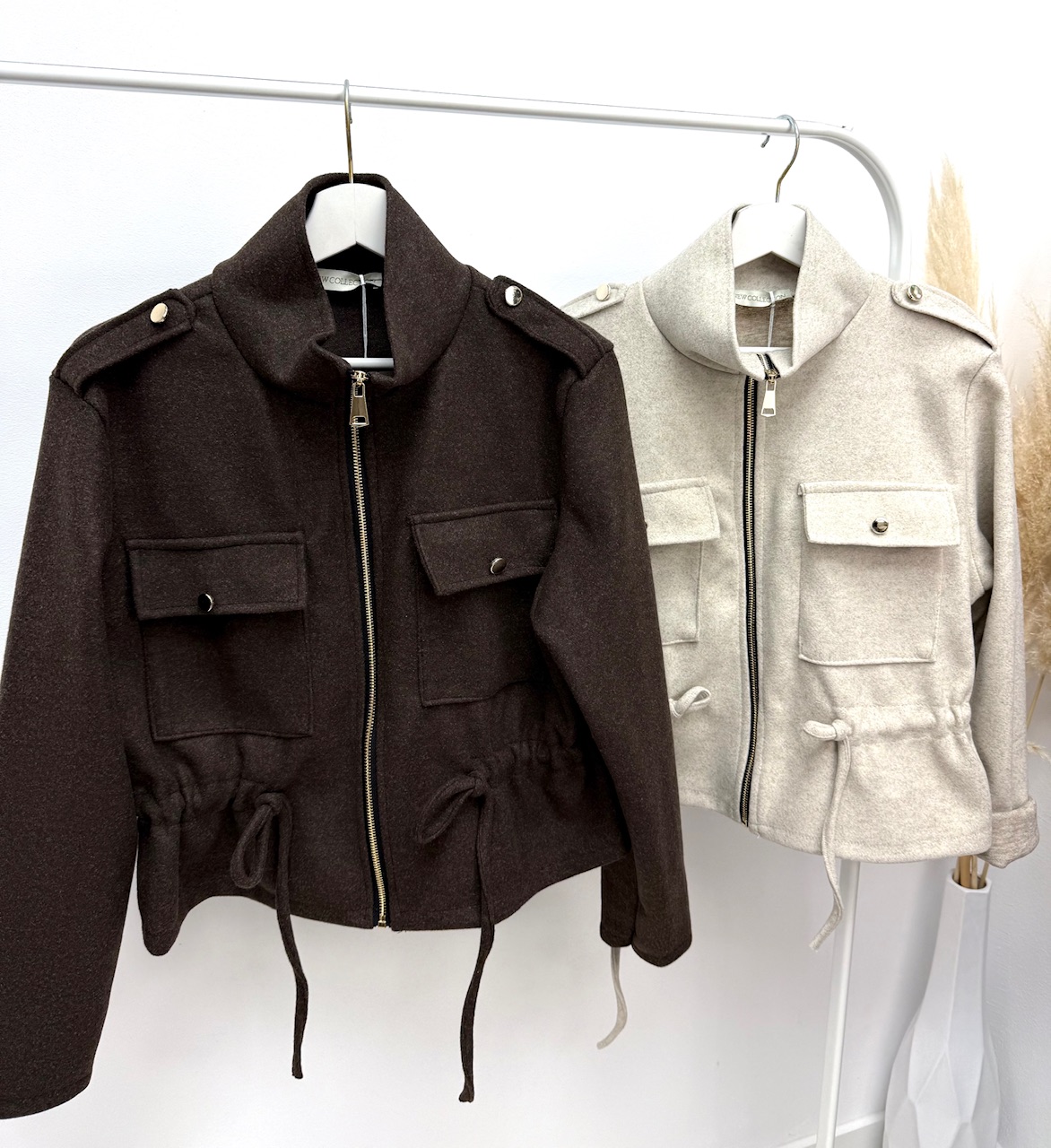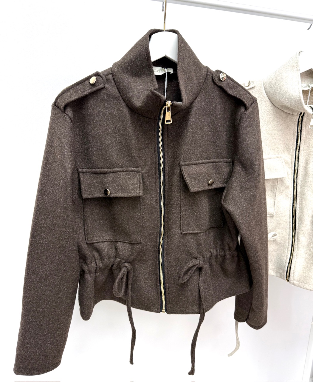 Presenta cuello alto, cierre frontal con cremallera metálica y dos bolsillos frontales con solapa y botón a presión. Incluye detalle de ajuste con cordón en la cintura para estilizar la silueta y hombreras con botón decorativo, que le dan un aire estructurado y moderno. Diseño versátil, elegante y fácil de combinar tanto con looks casuales como más formales.