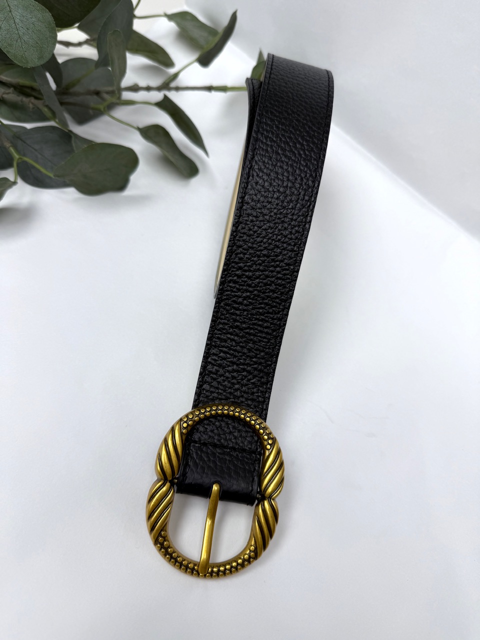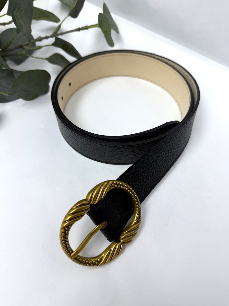 CINTURÓN HEBILLA VINTAGE Cinturón elegante de piel sintética negra con textura, interior en tono beige y hebilla ovalada dorada con diseño vintage. Ideal para dar un toque sofisticado y atemporal a cualquier atuendo. 90cm.