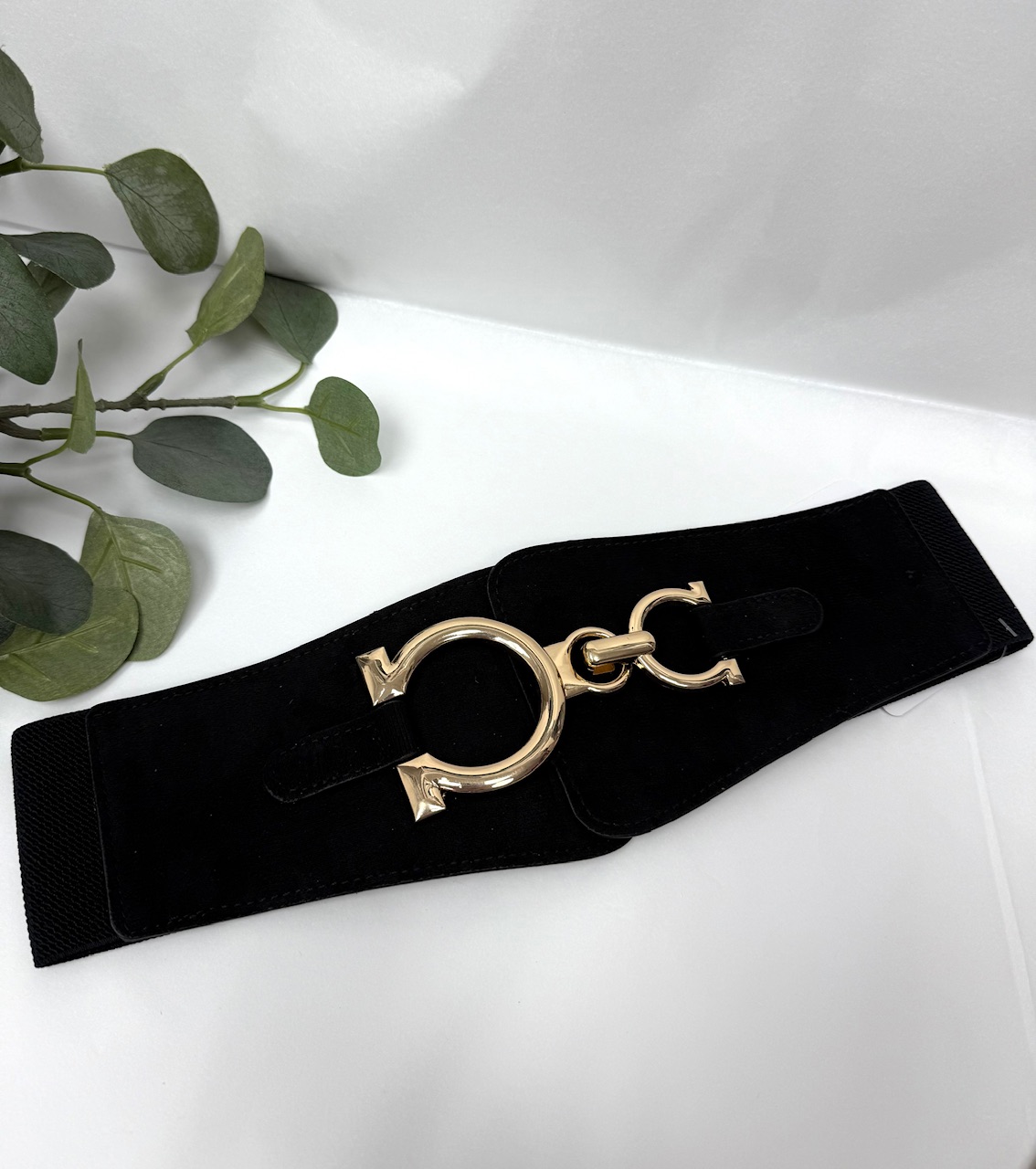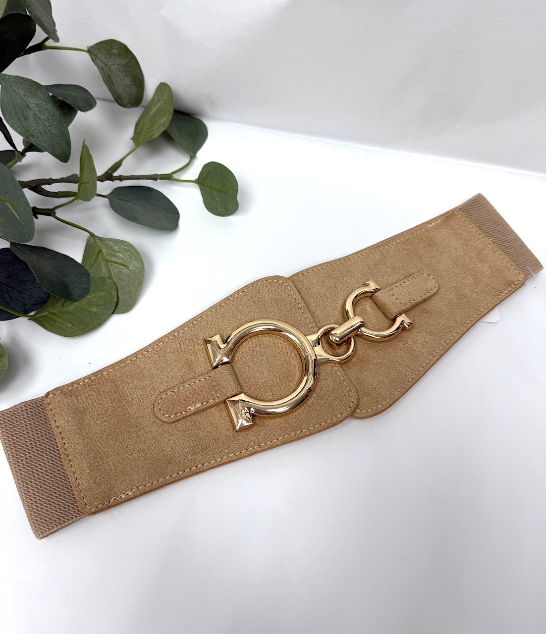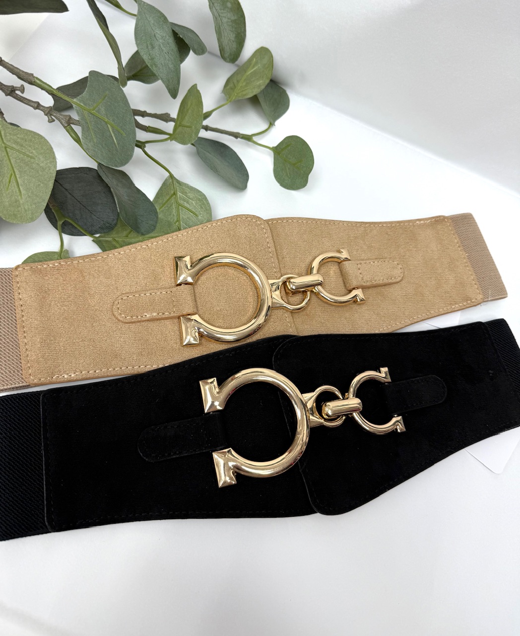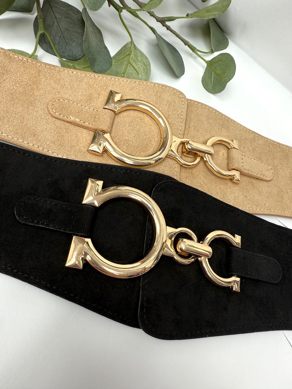 Cinturón ancho tipo faja con hebilla decorativa dorada en forma de aro entrelazado. Tono camel y negro, ambos con diseño elástico en los extremos para un ajuste cómodo.