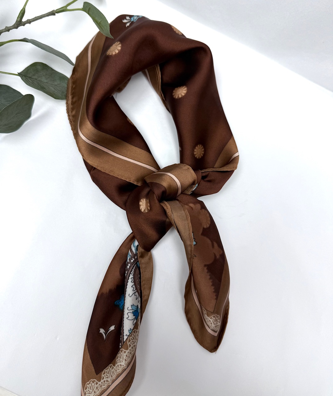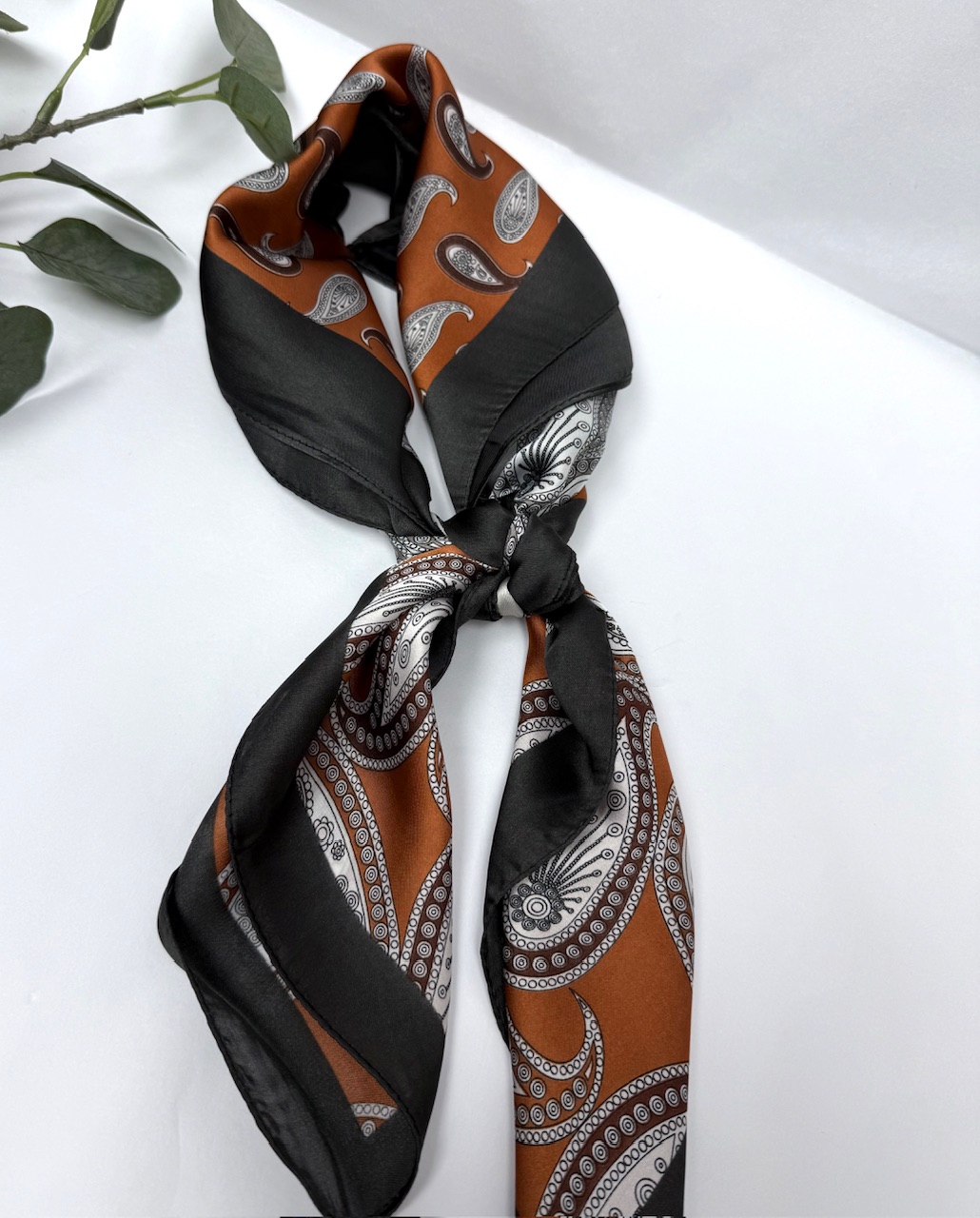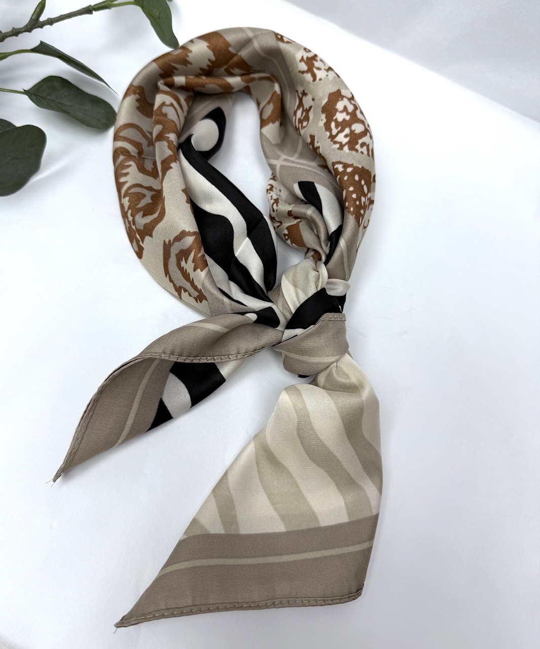 PAÑUELOS TENDENCIA SEDA Elegante pañuelo de seda suave en tonos marrón, negro y beige. Perfecto para usar al cuello, en el cabello o como accesorio de bolso, aportando un toque clásico y sofisticado a cualquier look.