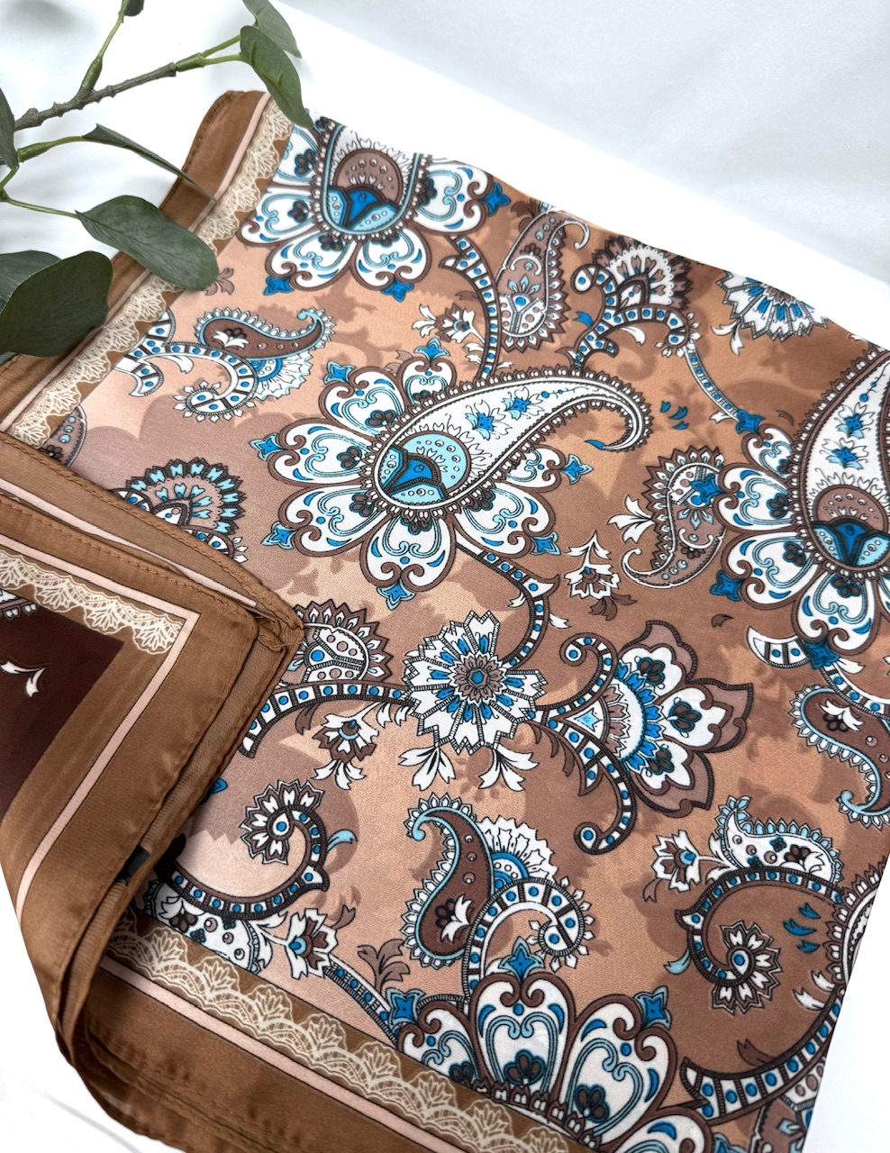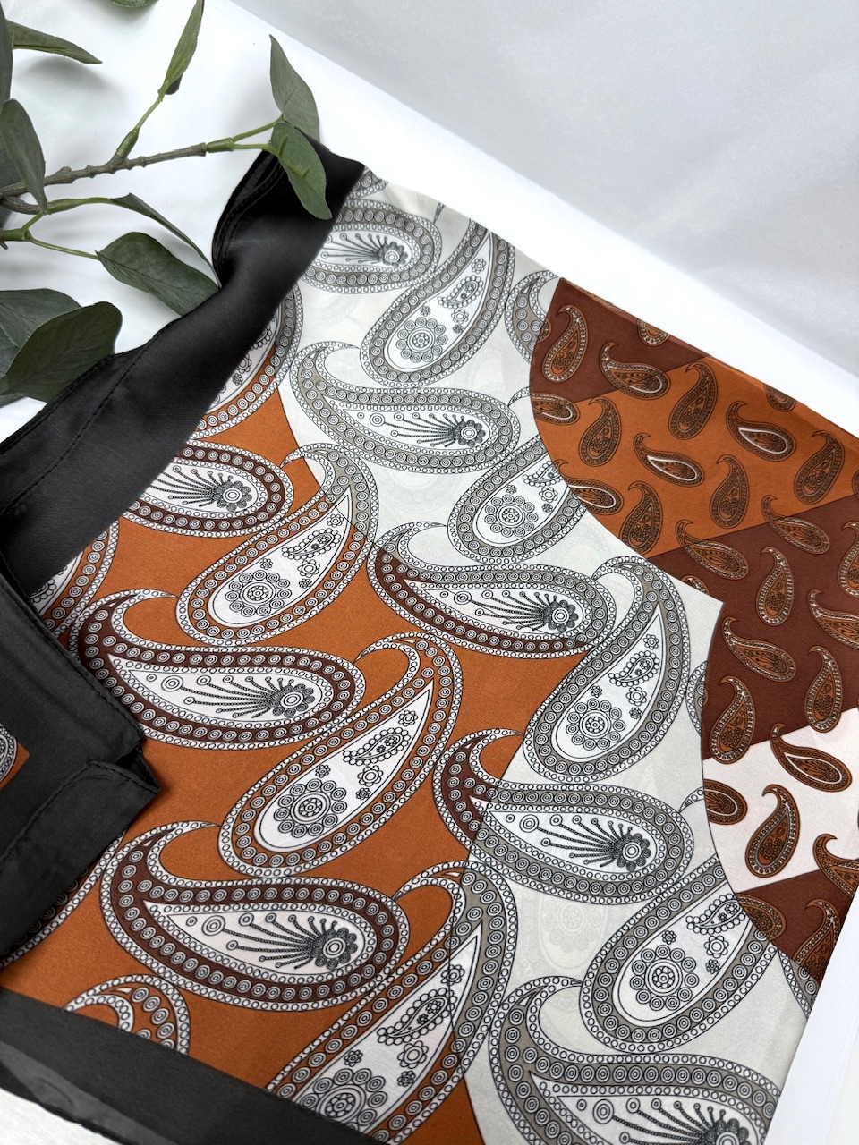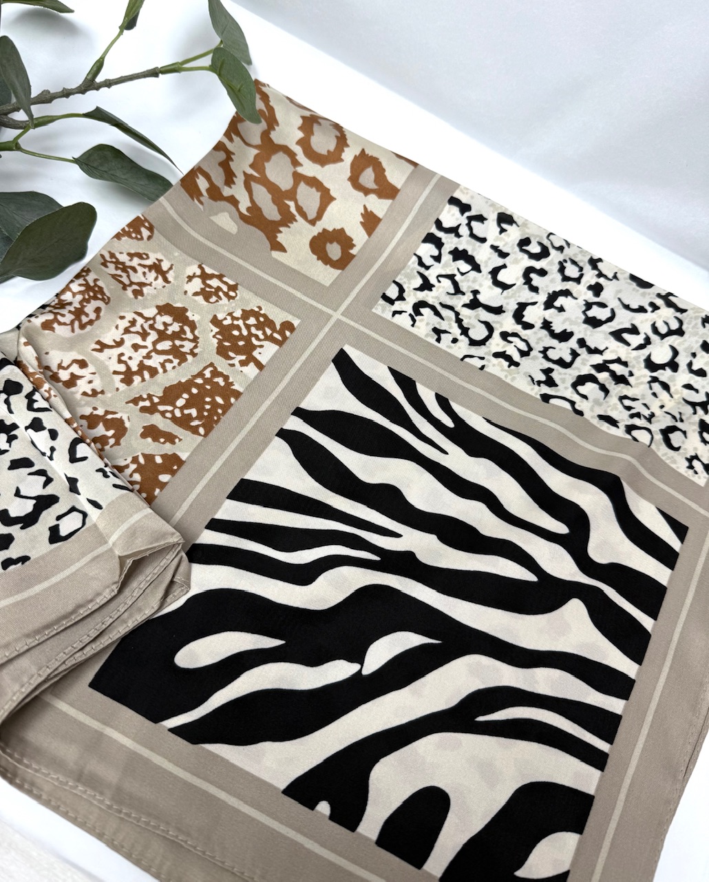 PAÑUELOS TENDENCIA SEDA Elegante pañuelo de seda suave en tonos marrón, negro y beige. Perfecto para usar al cuello, en el cabello o como accesorio de bolso, aportando un toque clásico y sofisticado a cualquier look.