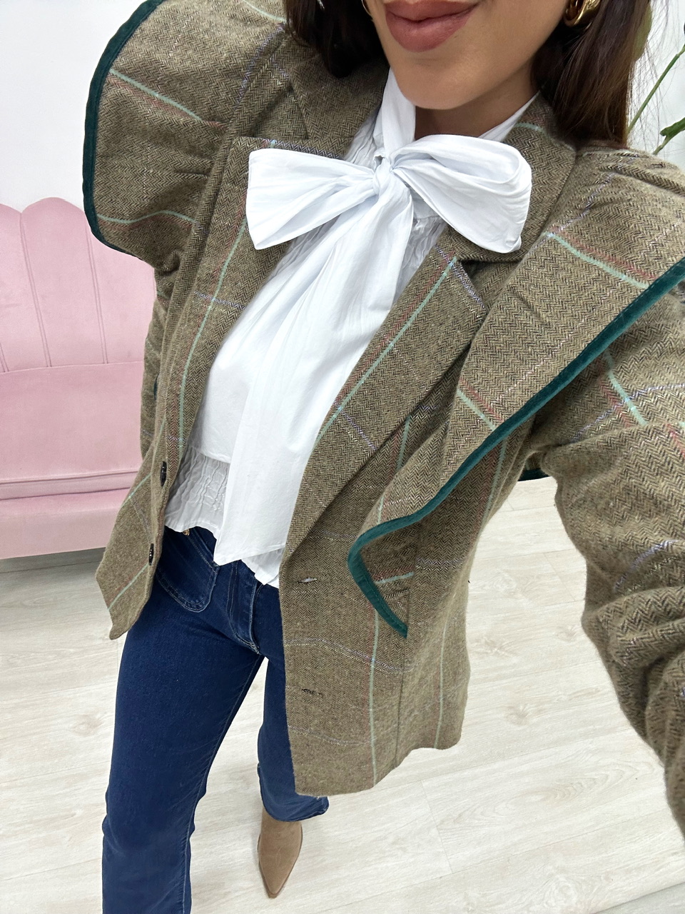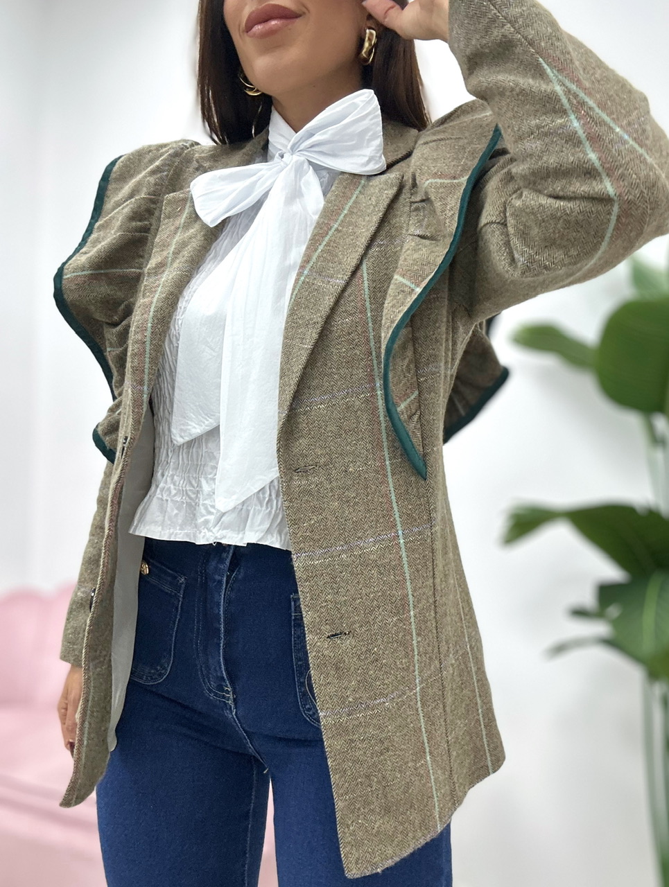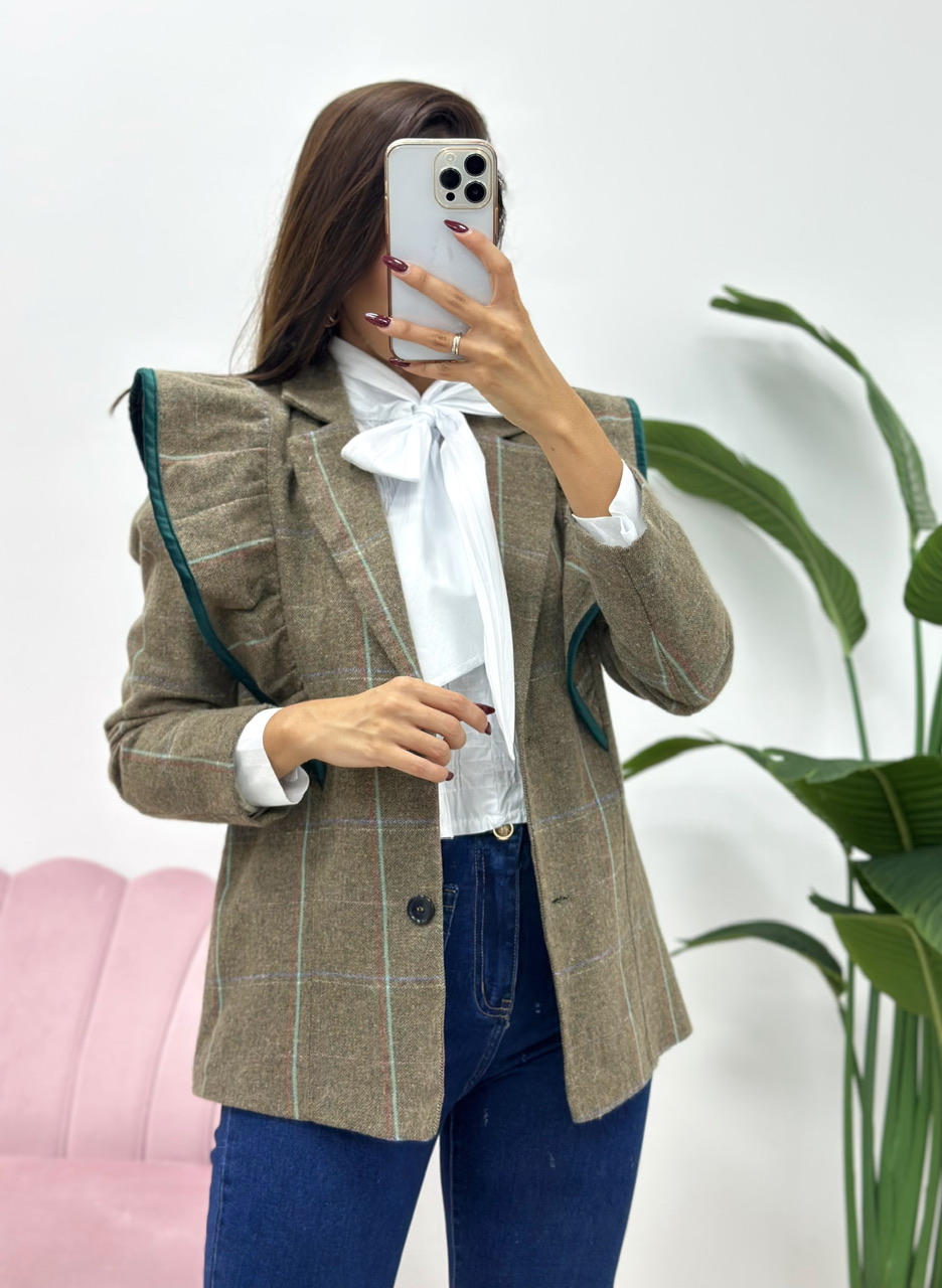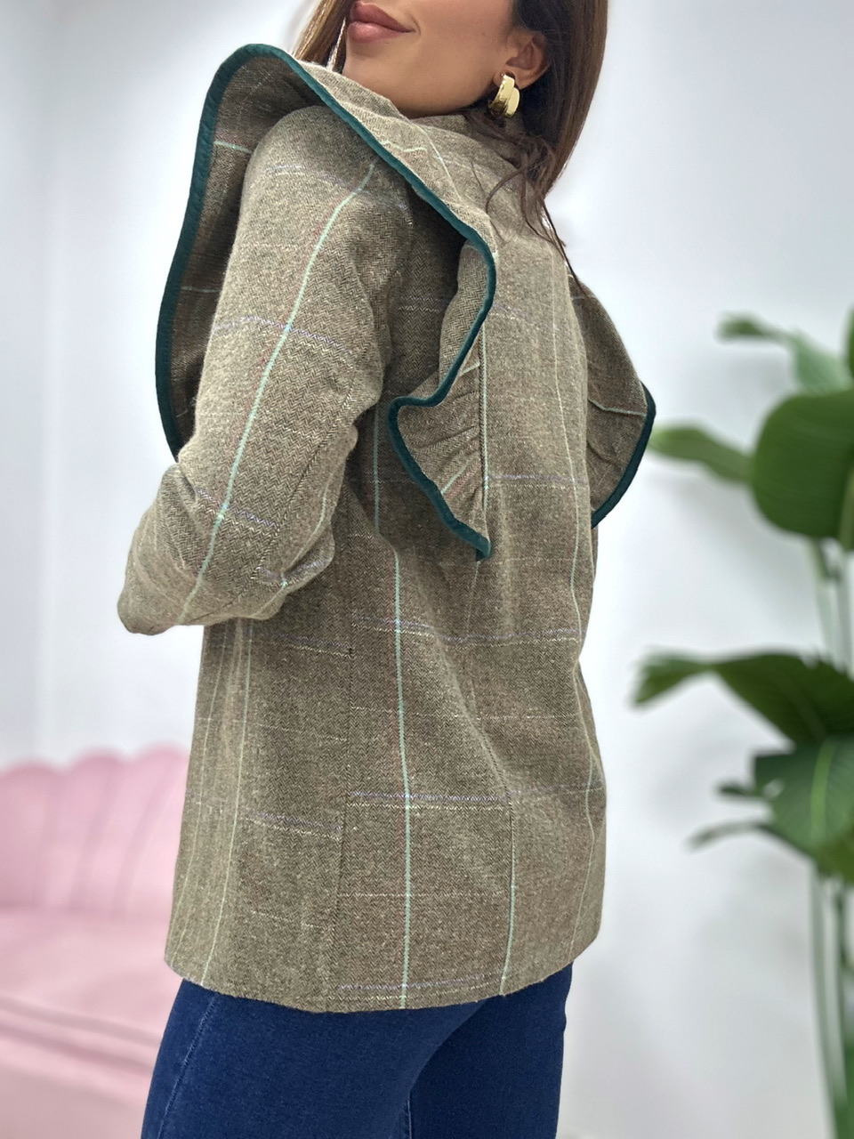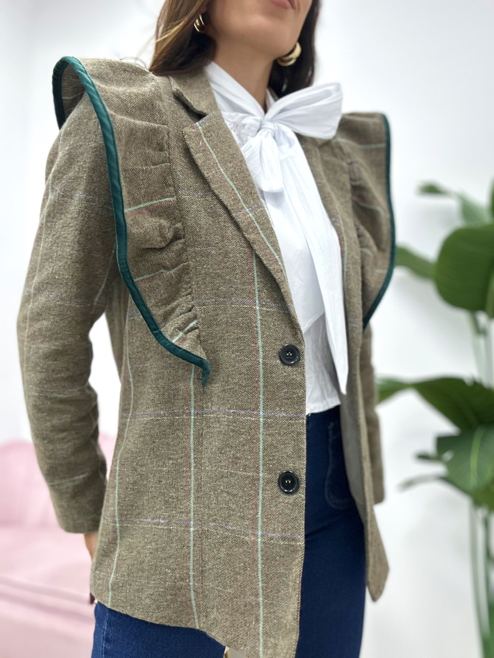 Blazer estilo sastre de tejido tipo tweed con cuadro fino, detalles de volantes con ribete verde en los hombros y botonadura frontal.