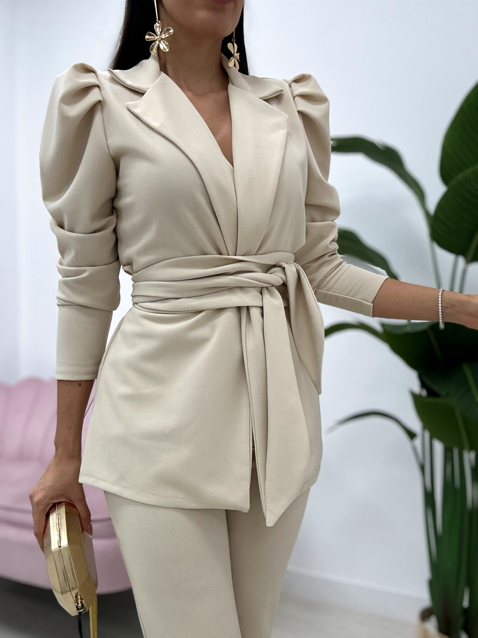 La chaqueta presenta escote en pico, hombros ligeramente estructurados con manga abullonada, y un cinturón del mismo tejido que permite ajustar y realzar la silueta.