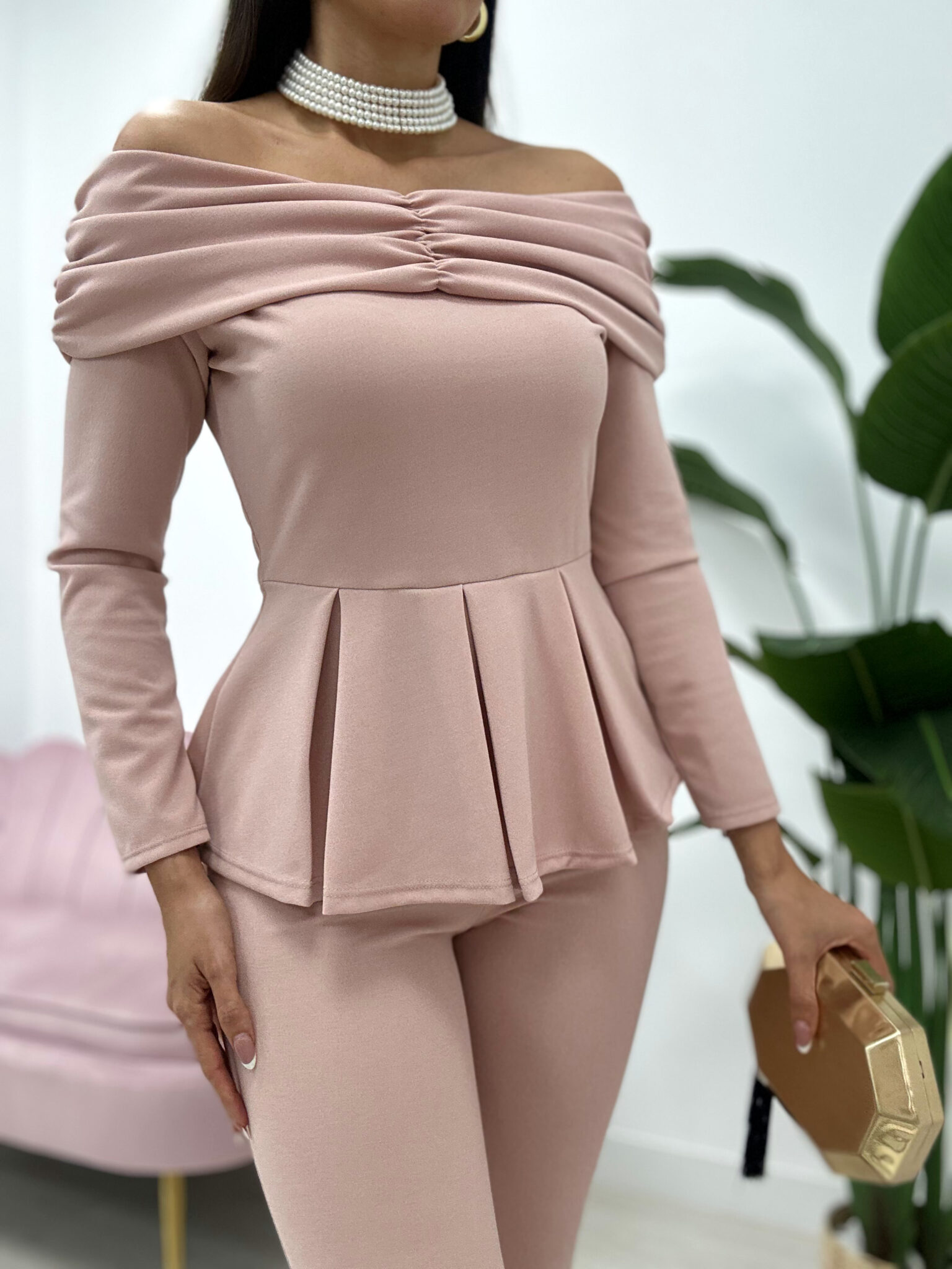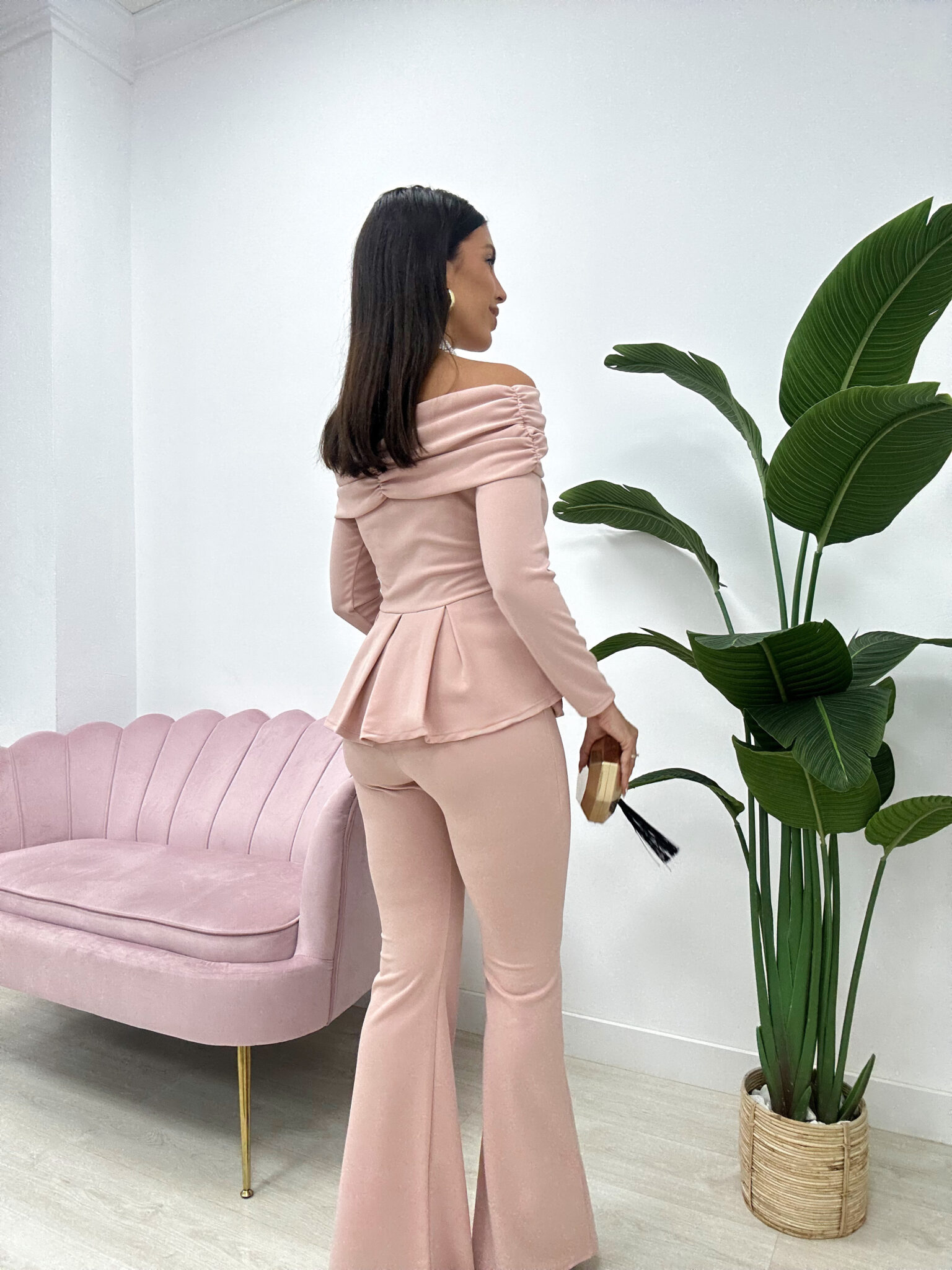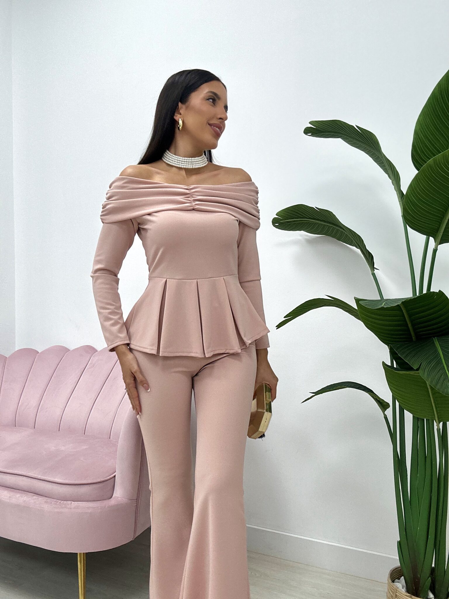 Compuesto por top de escote bardot con hombros descubiertos, mangas largas y volante tipo peplum que estiliza la cintura y aporta un toque femenino y sofisticado.