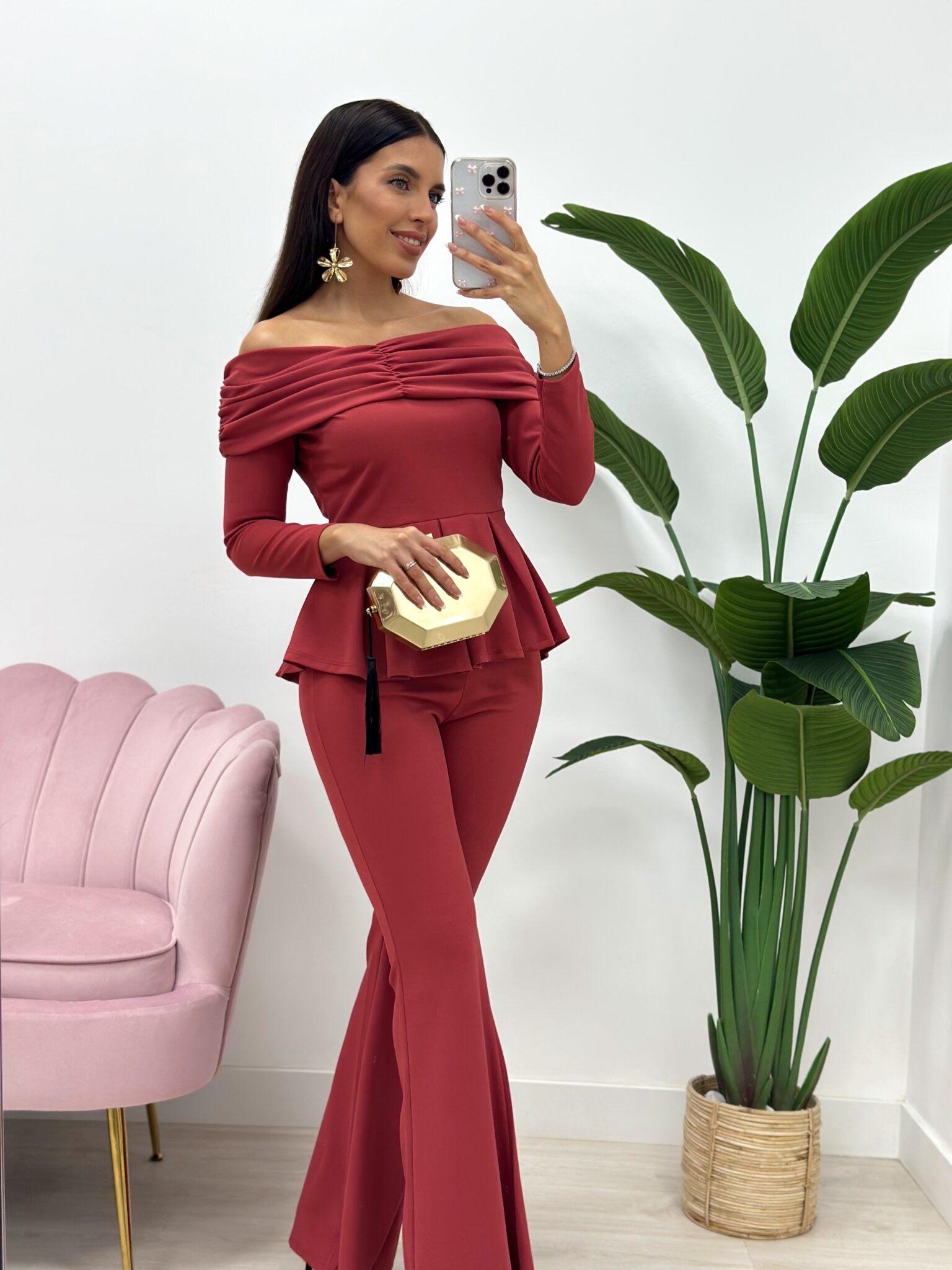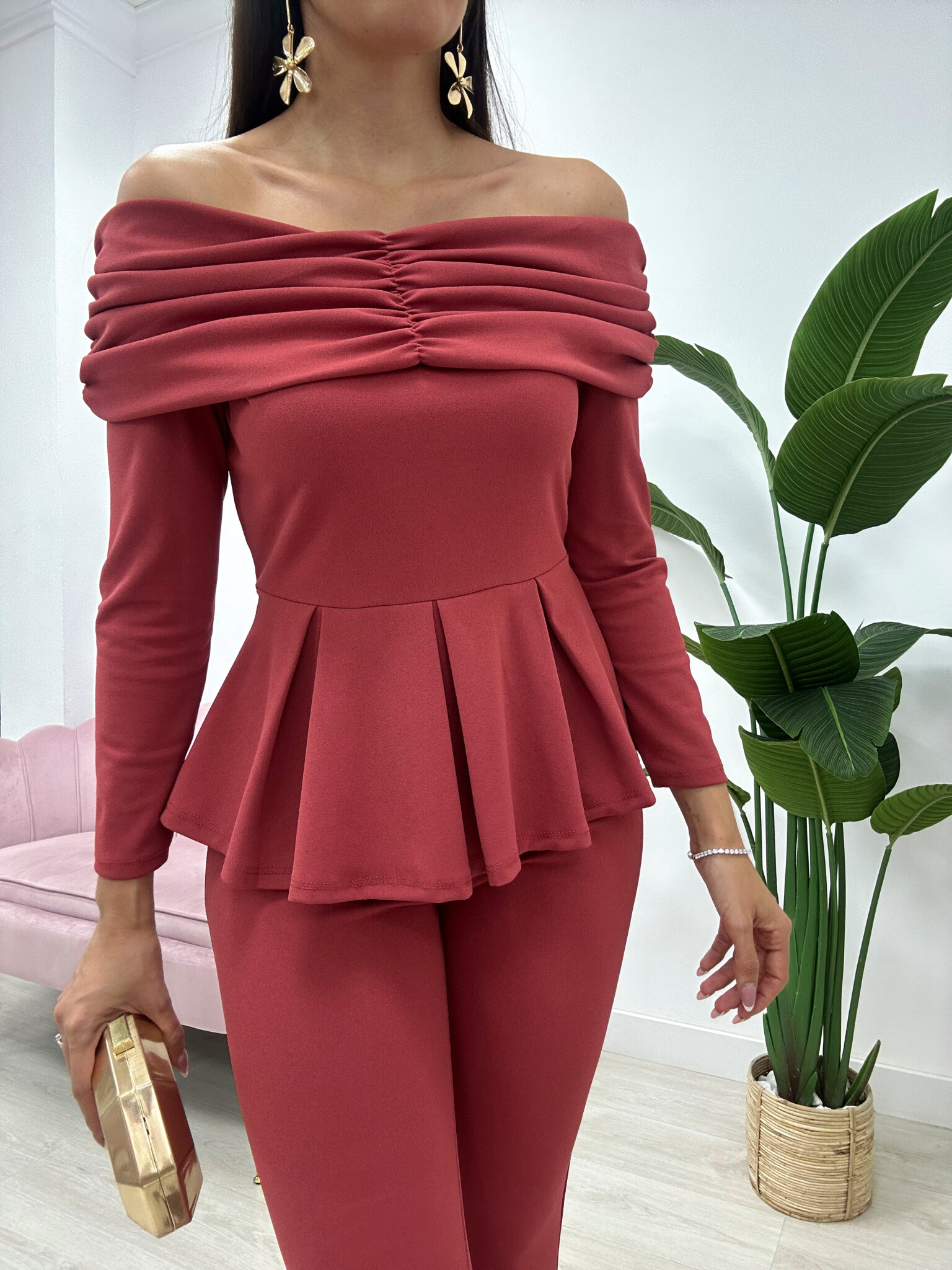 Compuesto por top de escote bardot con hombros descubiertos, mangas largas y volante tipo peplum que estiliza la cintura y aporta un toque femenino y sofisticado.