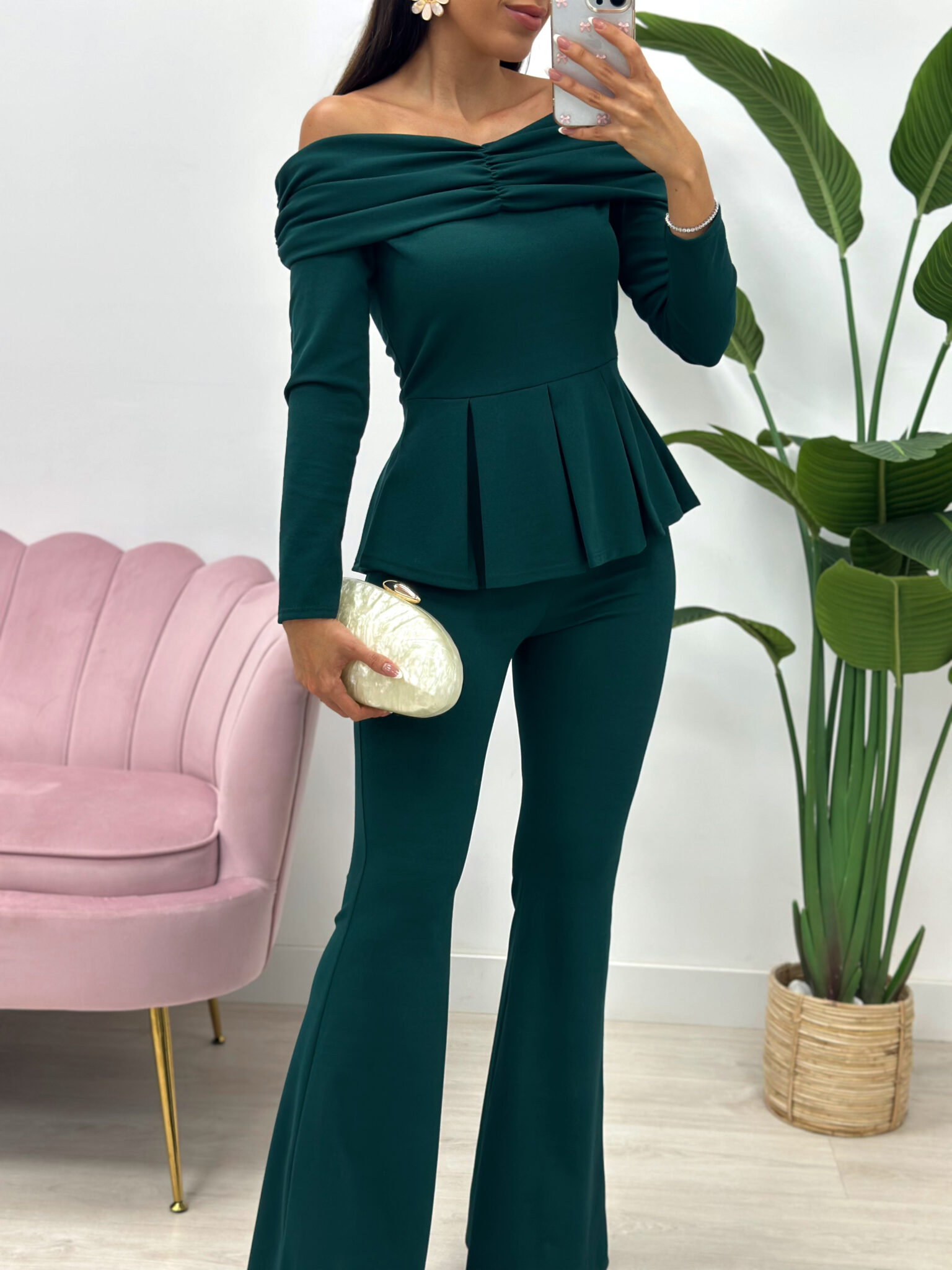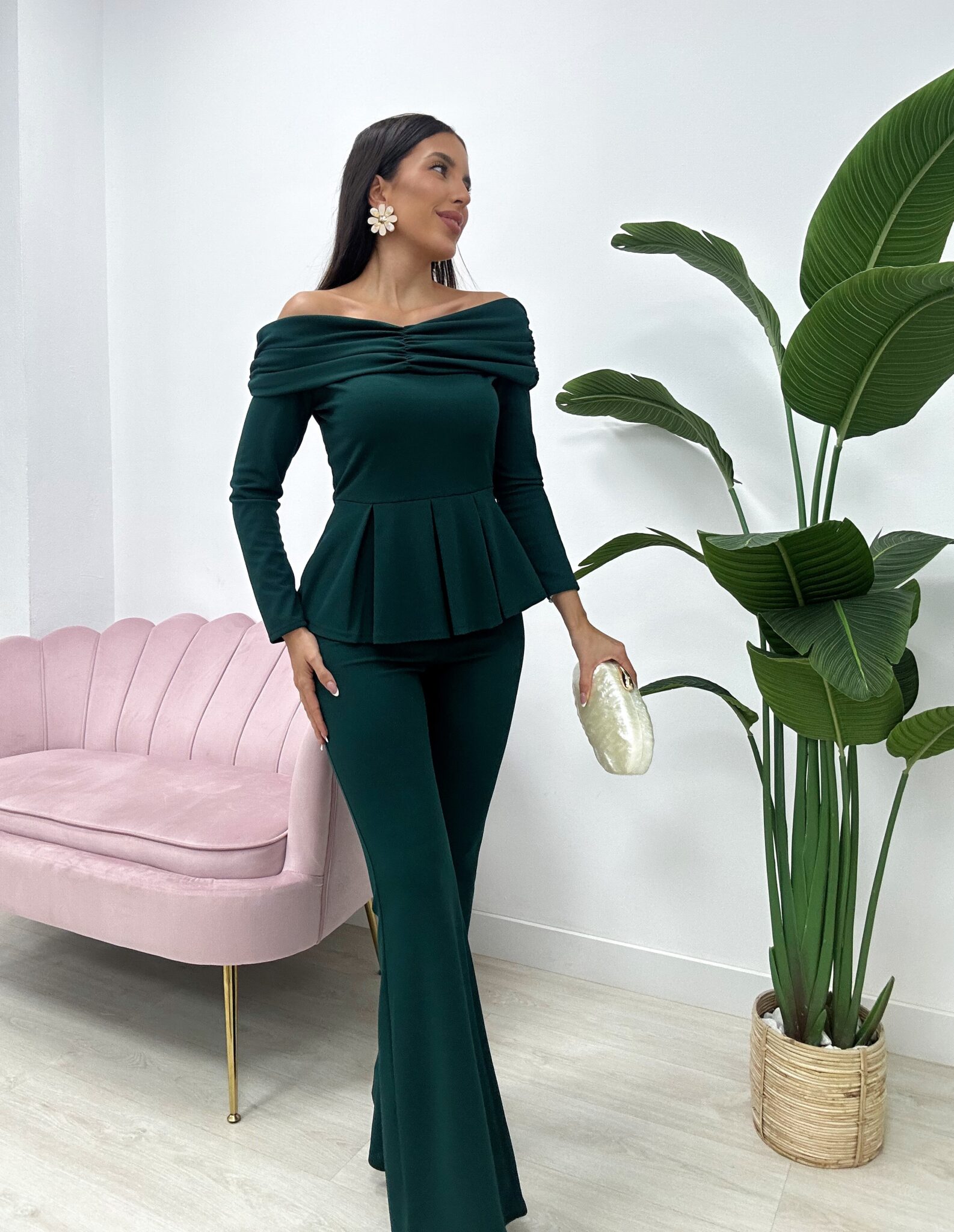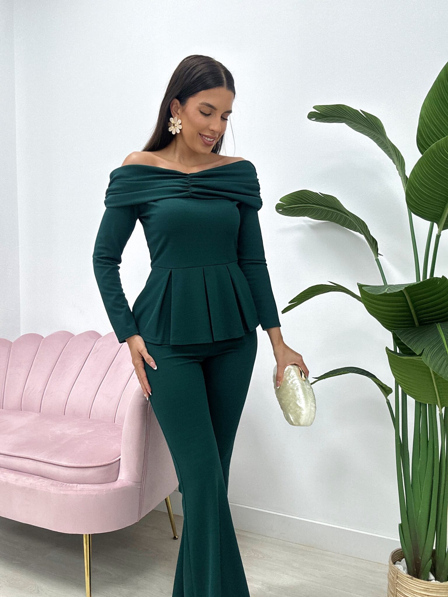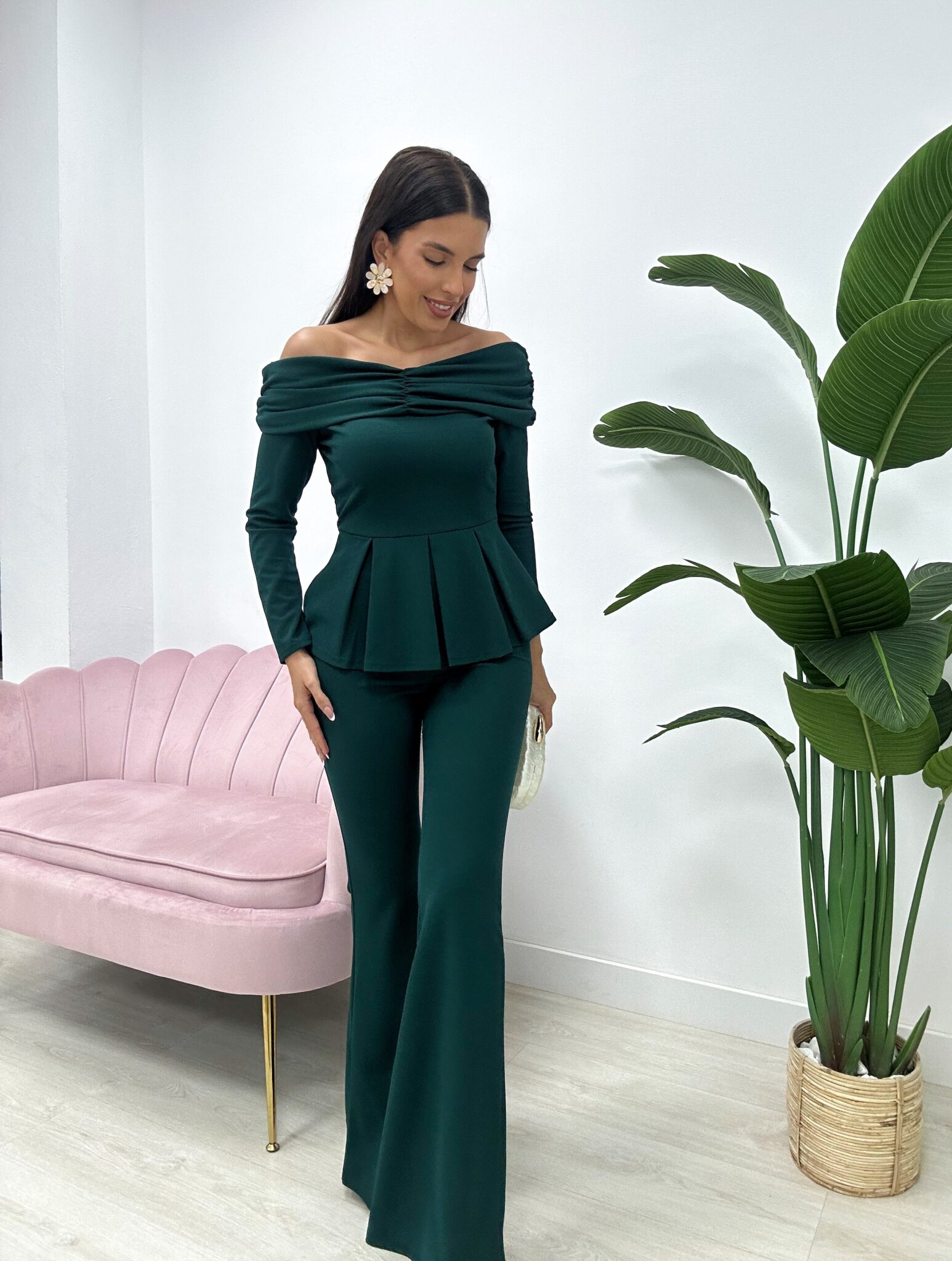 Compuesto por top de escote bardot con hombros descubiertos, mangas largas y volante tipo peplum que estiliza la cintura y aporta un toque femenino y sofisticado.