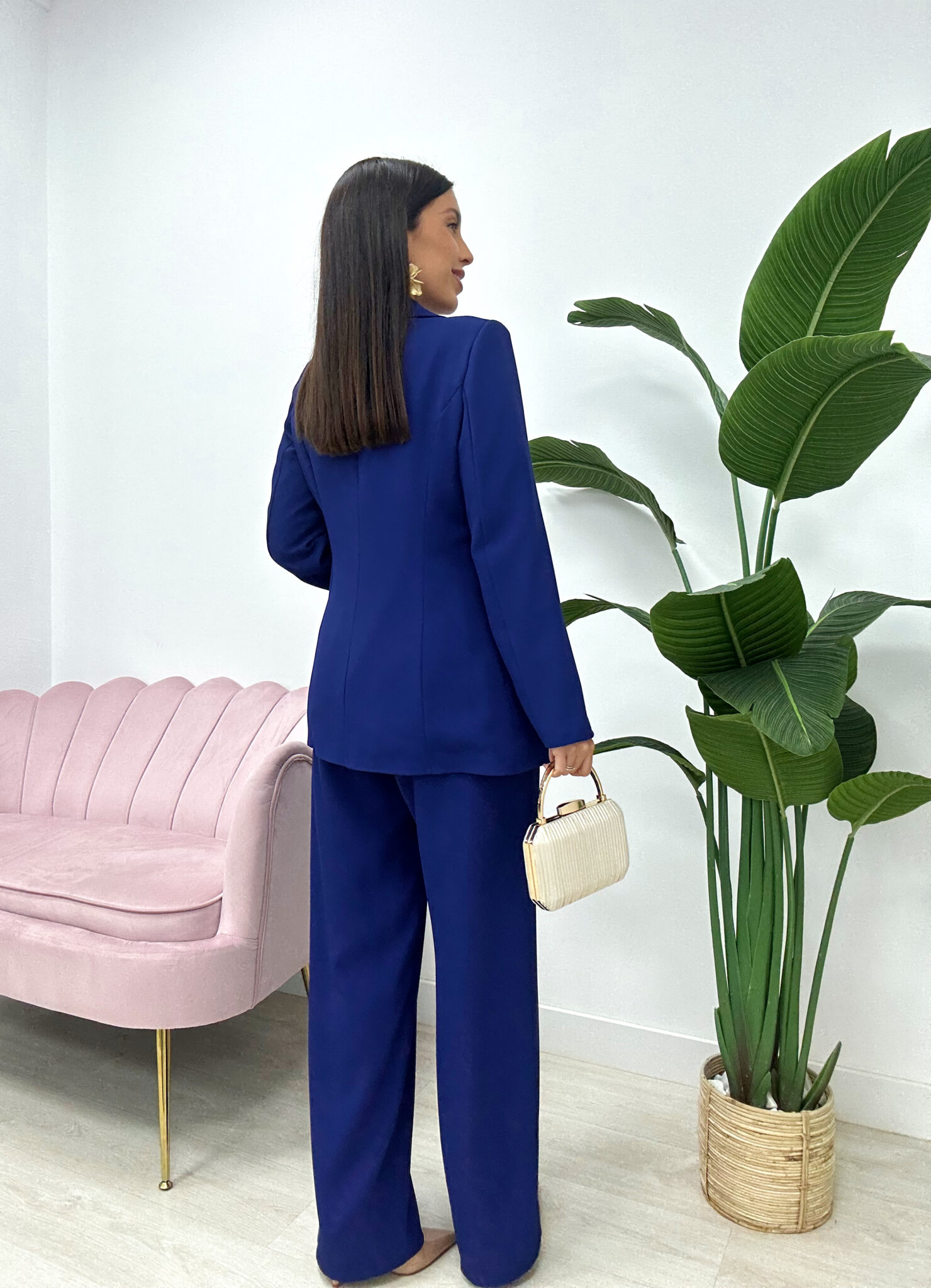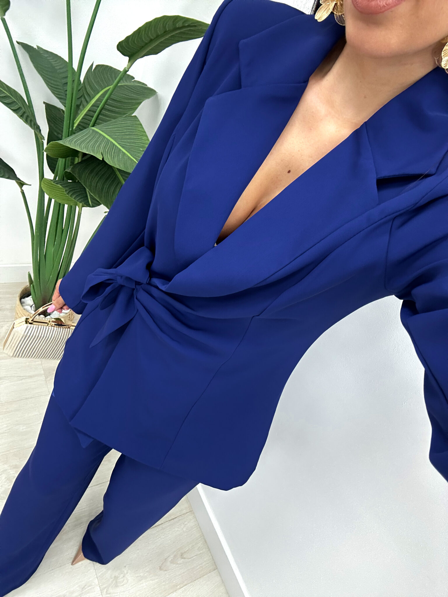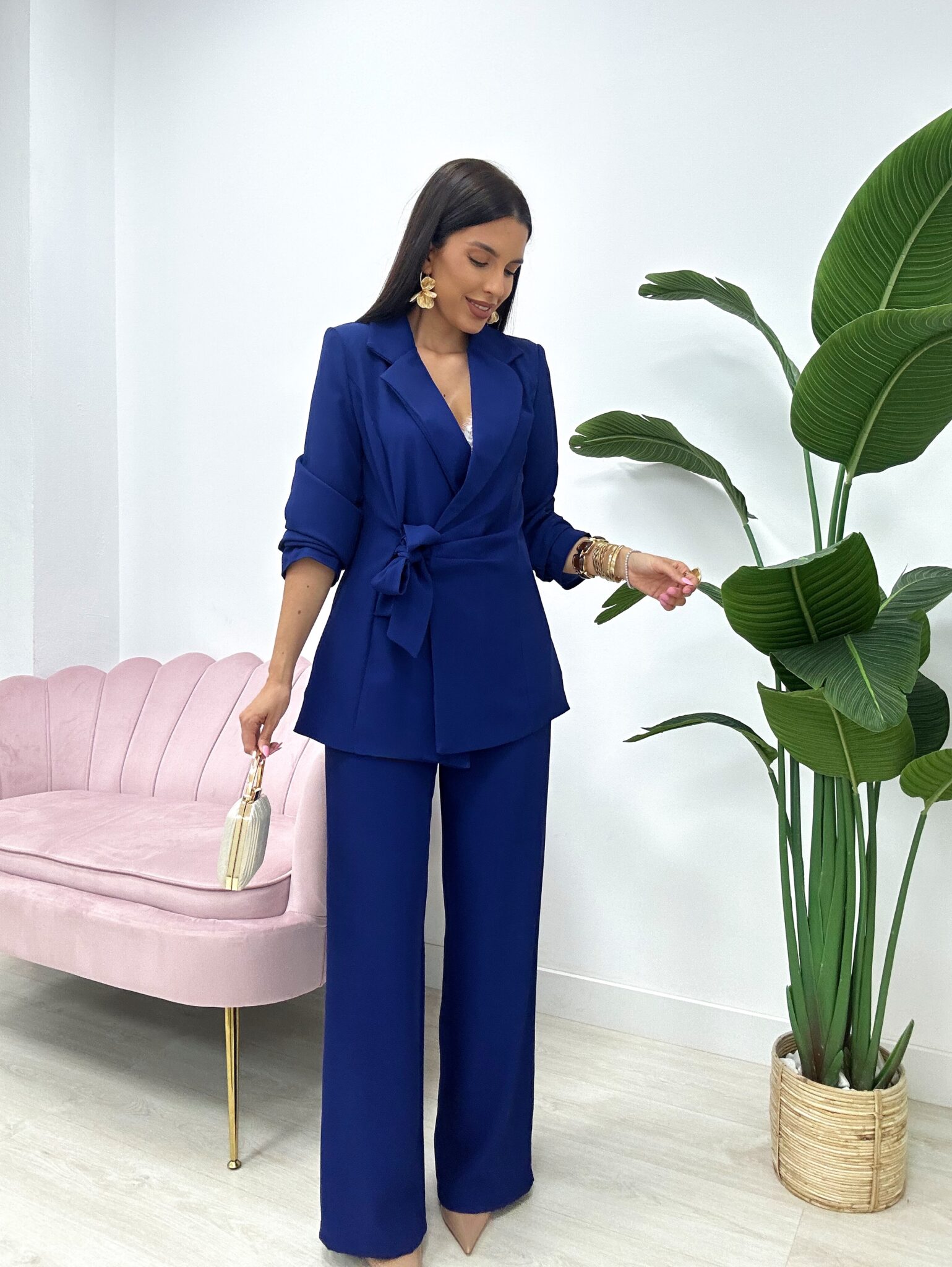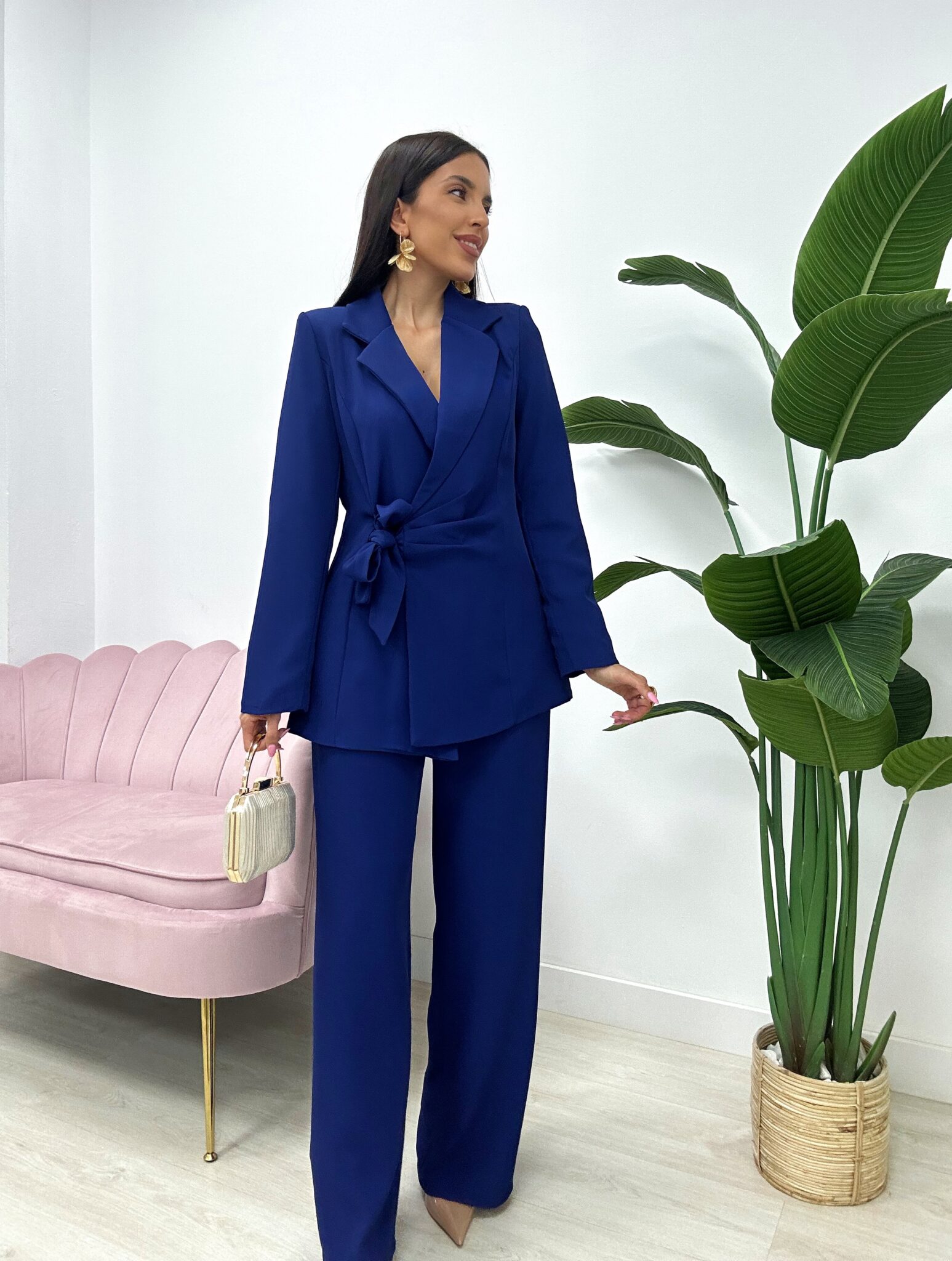 Conjunto elegante de dos piezas confeccionado en tejido fluido que aporta movimiento, comodidad y un acabado sofisticado. La chaqueta tipo blazer incorpora hombreras que estructuran la silueta y solapas clásicas que refuerzan su estilo atemporal. Se ajusta a la cintura mediante un lazo del mismo tejido, permitiendo definir la figura con un toque femenino.