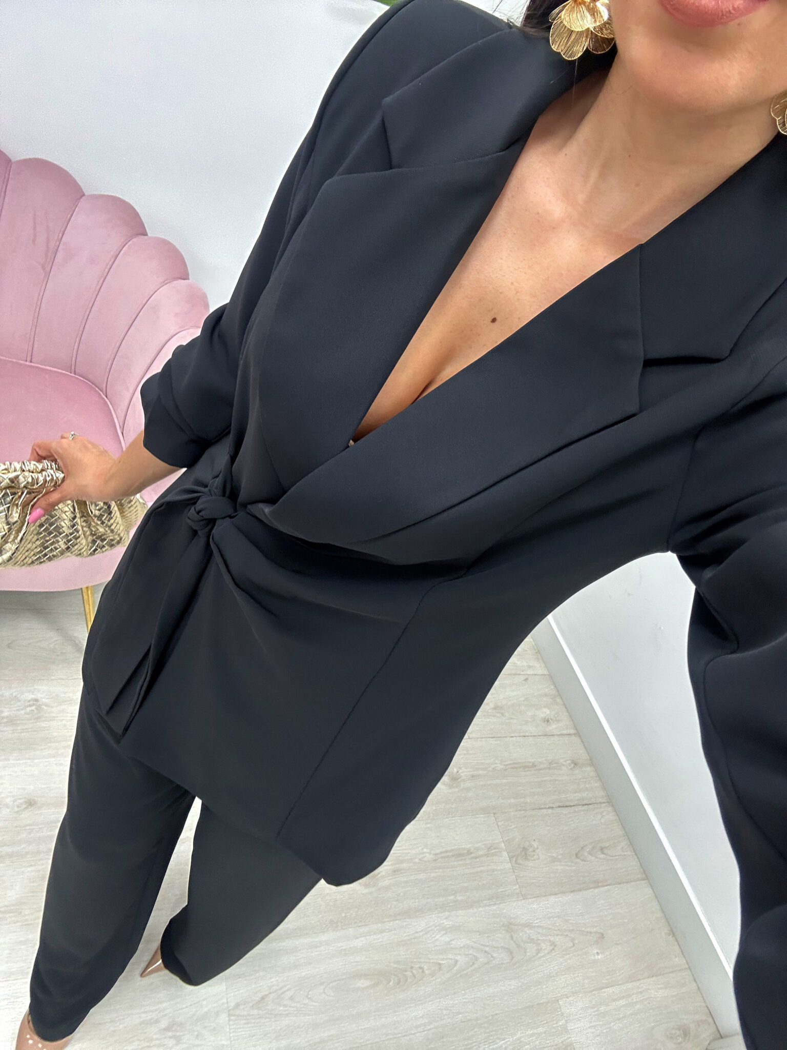 Conjunto elegante de dos piezas confeccionado en tejido fluido que aporta movimiento, comodidad y un acabado sofisticado. La chaqueta tipo blazer incorpora hombreras que estructuran la silueta y solapas clásicas que refuerzan su estilo atemporal. Se ajusta a la cintura mediante un lazo del mismo tejido, permitiendo definir la figura con un toque femenino.