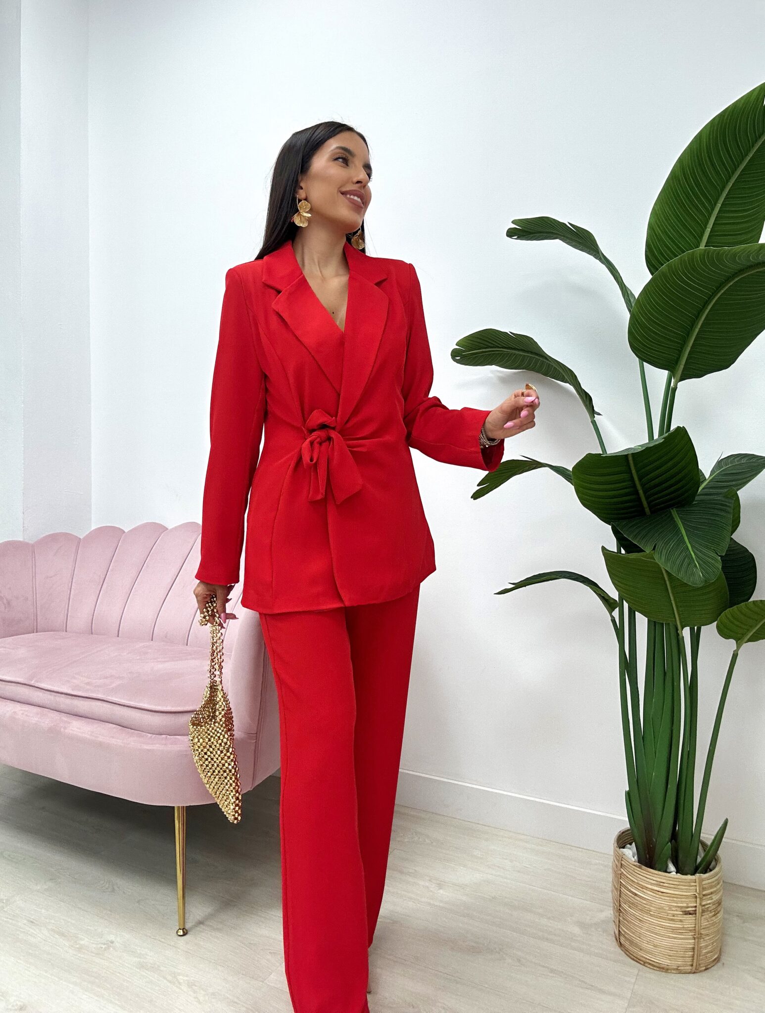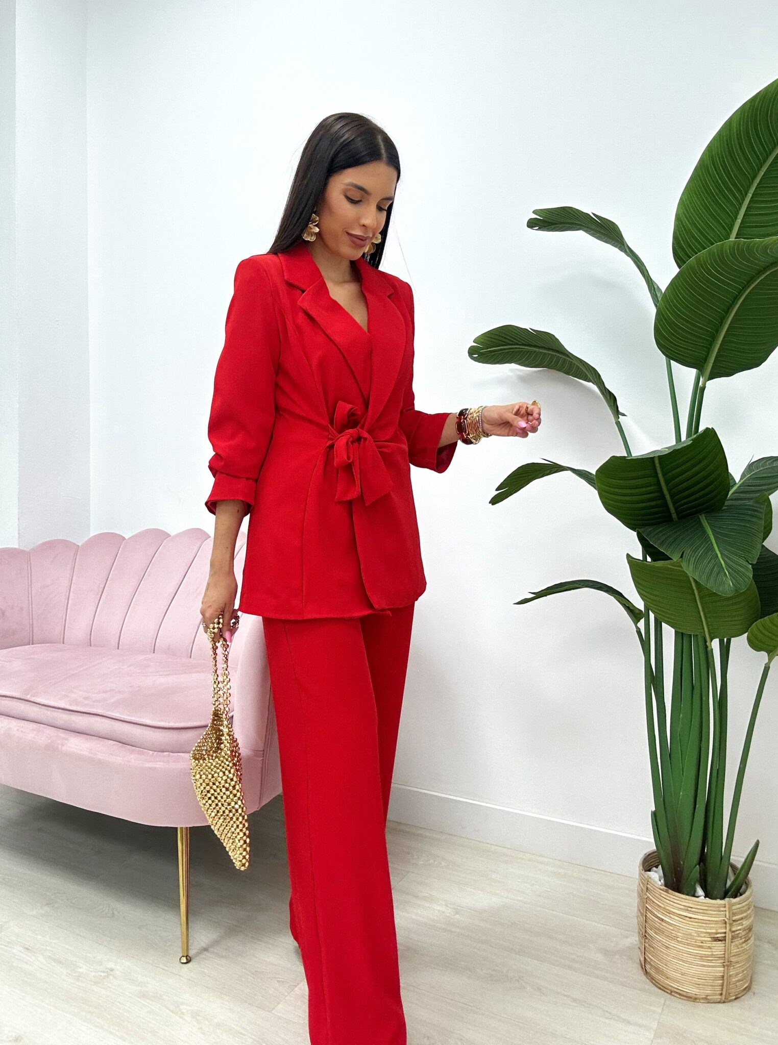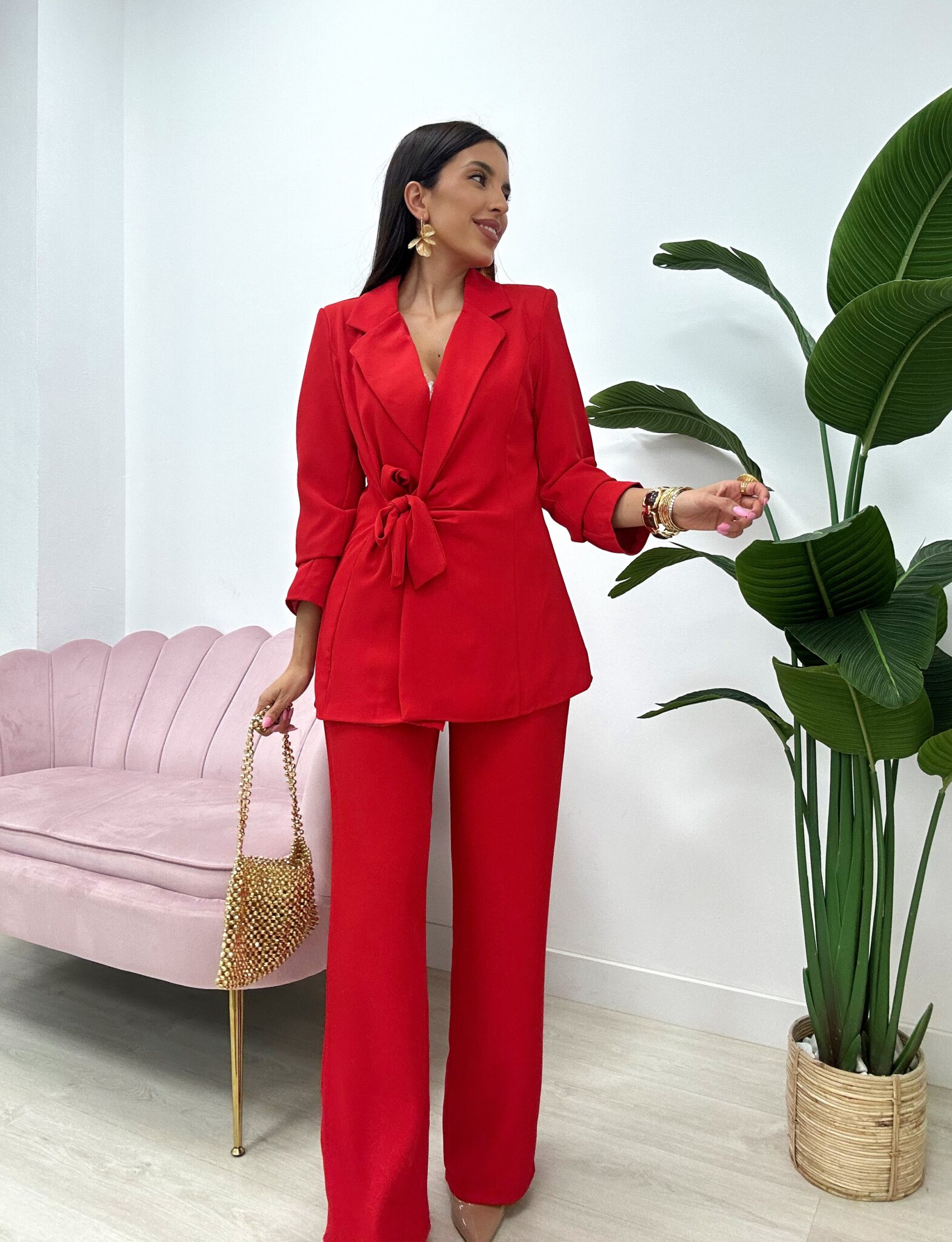 Conjunto elegante de dos piezas confeccionado en tejido fluido que aporta movimiento, comodidad y un acabado sofisticado. La chaqueta tipo blazer incorpora hombreras que estructuran la silueta y solapas clásicas que refuerzan su estilo atemporal. Se ajusta a la cintura mediante un lazo del mismo tejido, permitiendo definir la figura con un toque femenino.