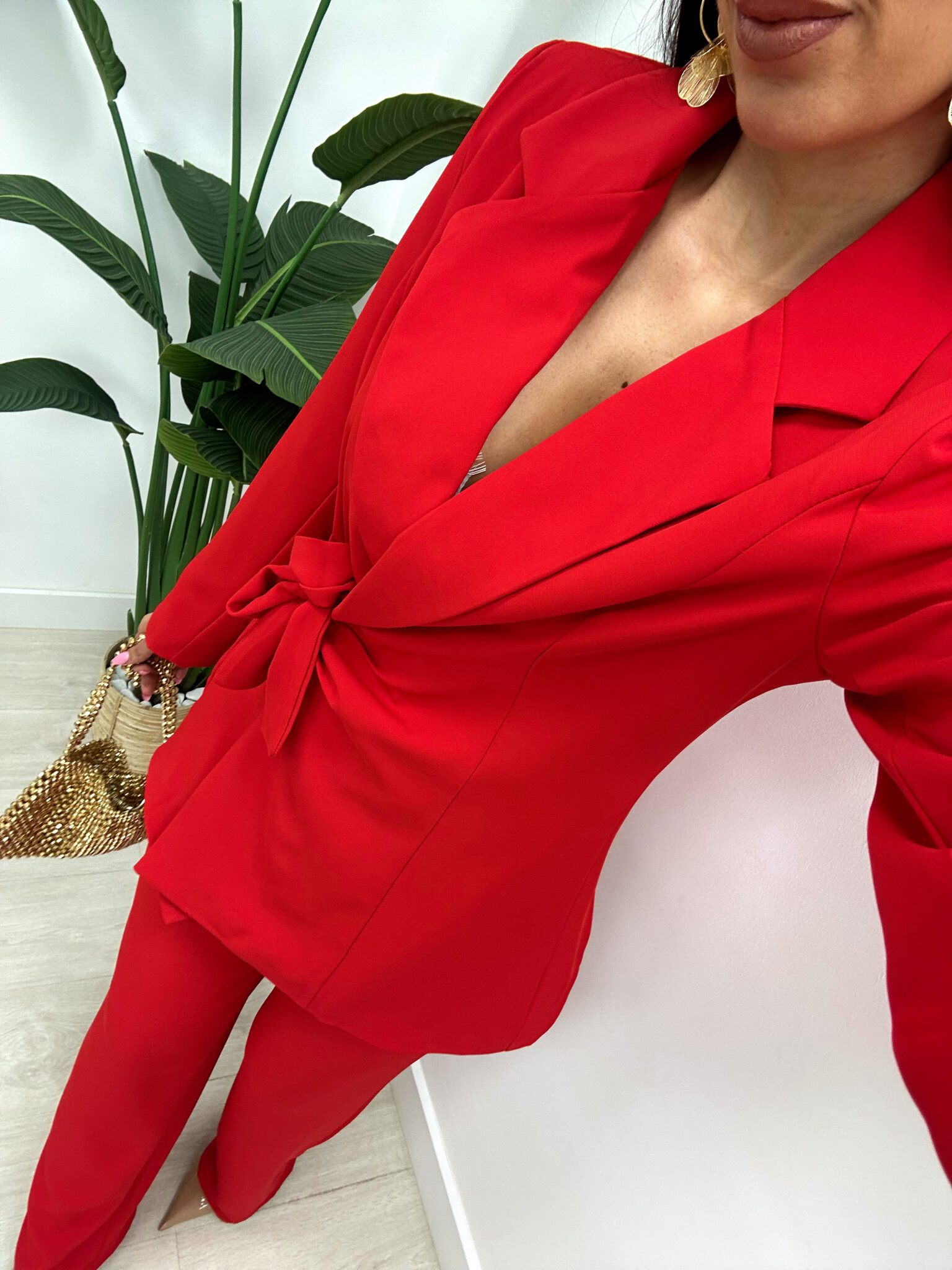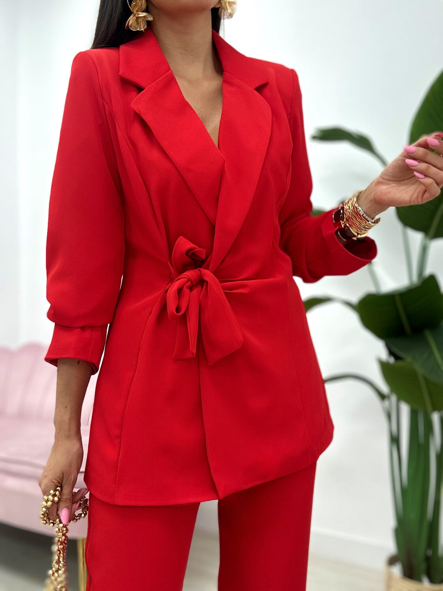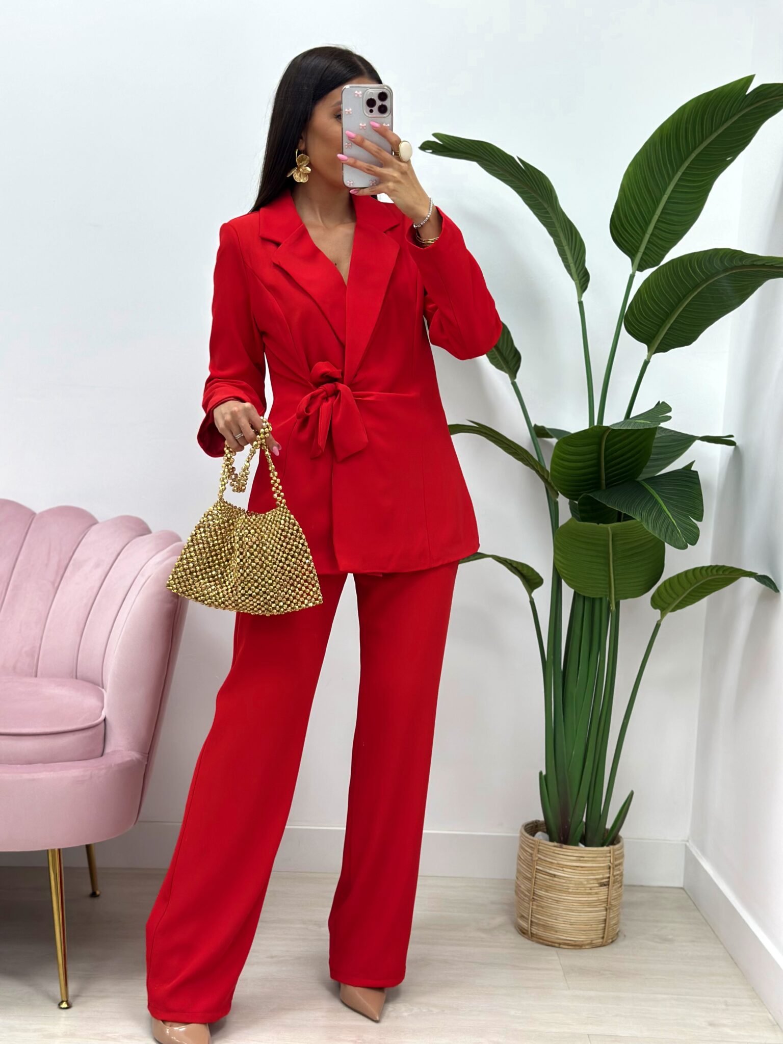 Conjunto elegante de dos piezas confeccionado en tejido fluido que aporta movimiento, comodidad y un acabado sofisticado. La chaqueta tipo blazer incorpora hombreras que estructuran la silueta y solapas clásicas que refuerzan su estilo atemporal. Se ajusta a la cintura mediante un lazo del mismo tejido, permitiendo definir la figura con un toque femenino.