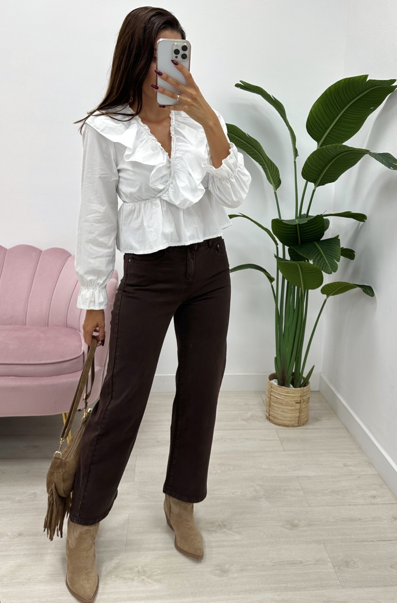 Pantalón denim color marrón oscuro, corte recto y tiro alto. Ideal para looks casuales o elegantes.