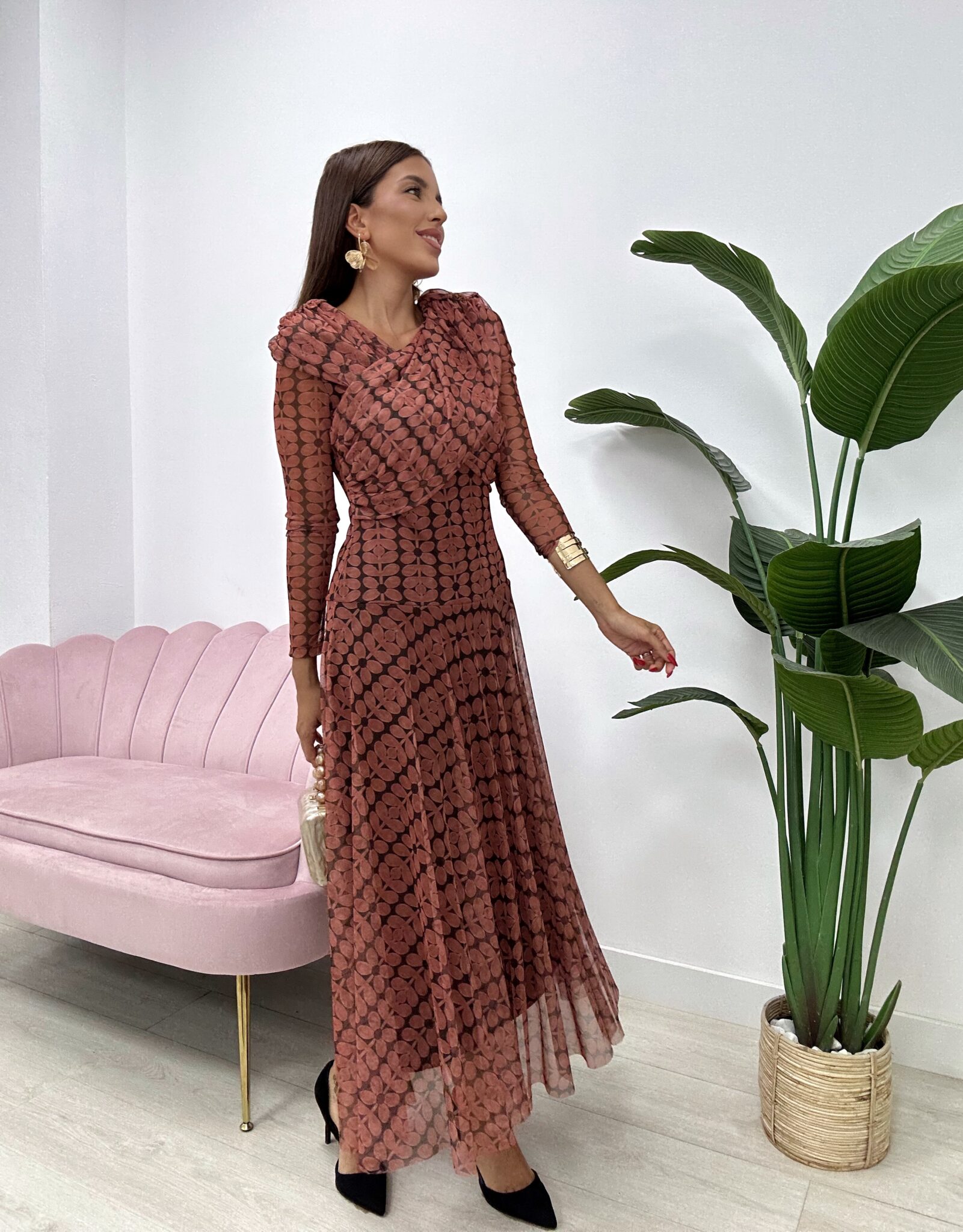 Está confeccionado en tejido tul con mucha caída y lleva forro interior. Es un vestido de corte midi, el escote cruzado sobrepuesto le da un toque diferente muy elegante combinado con las mangas semitransparentes.