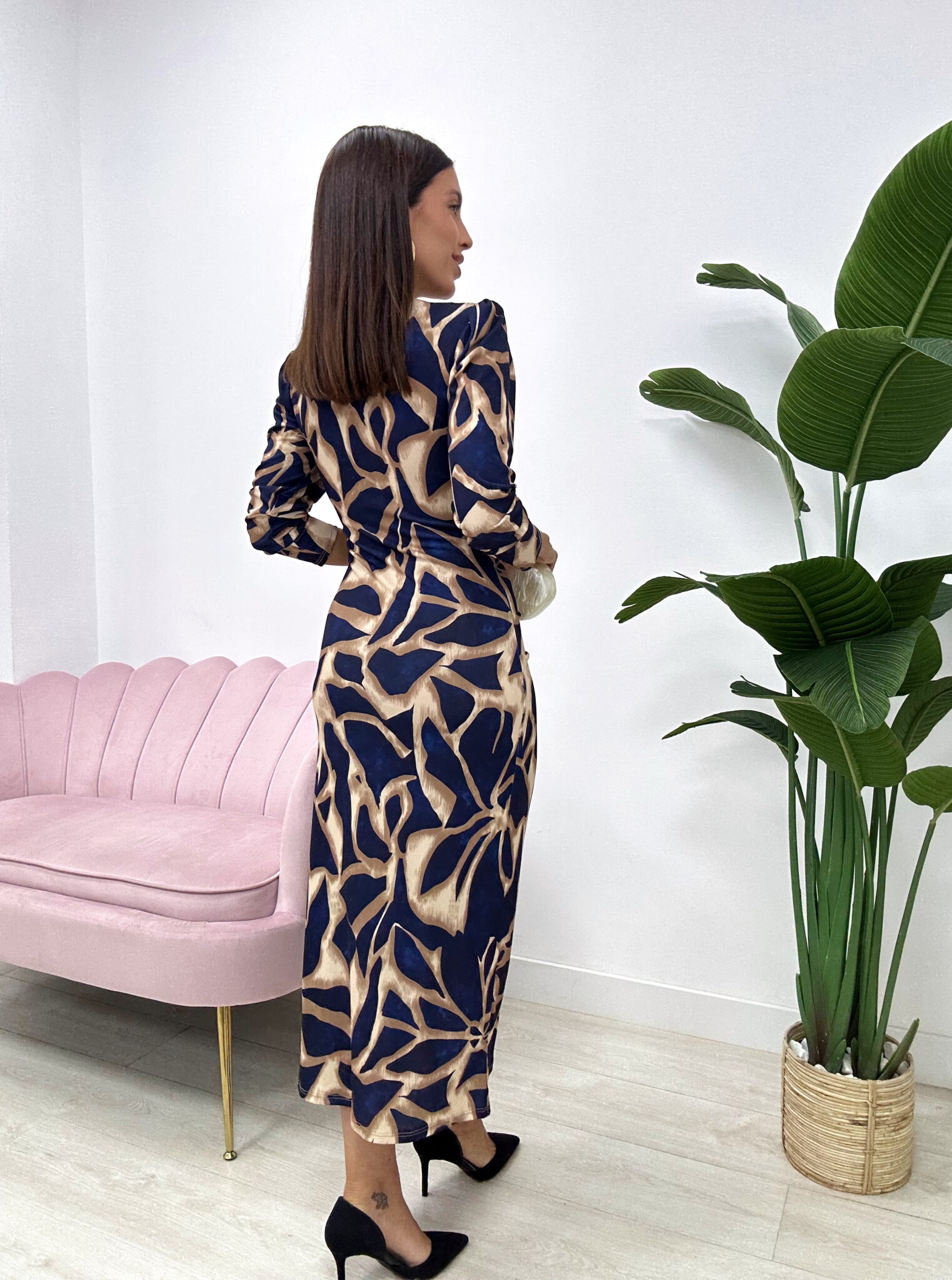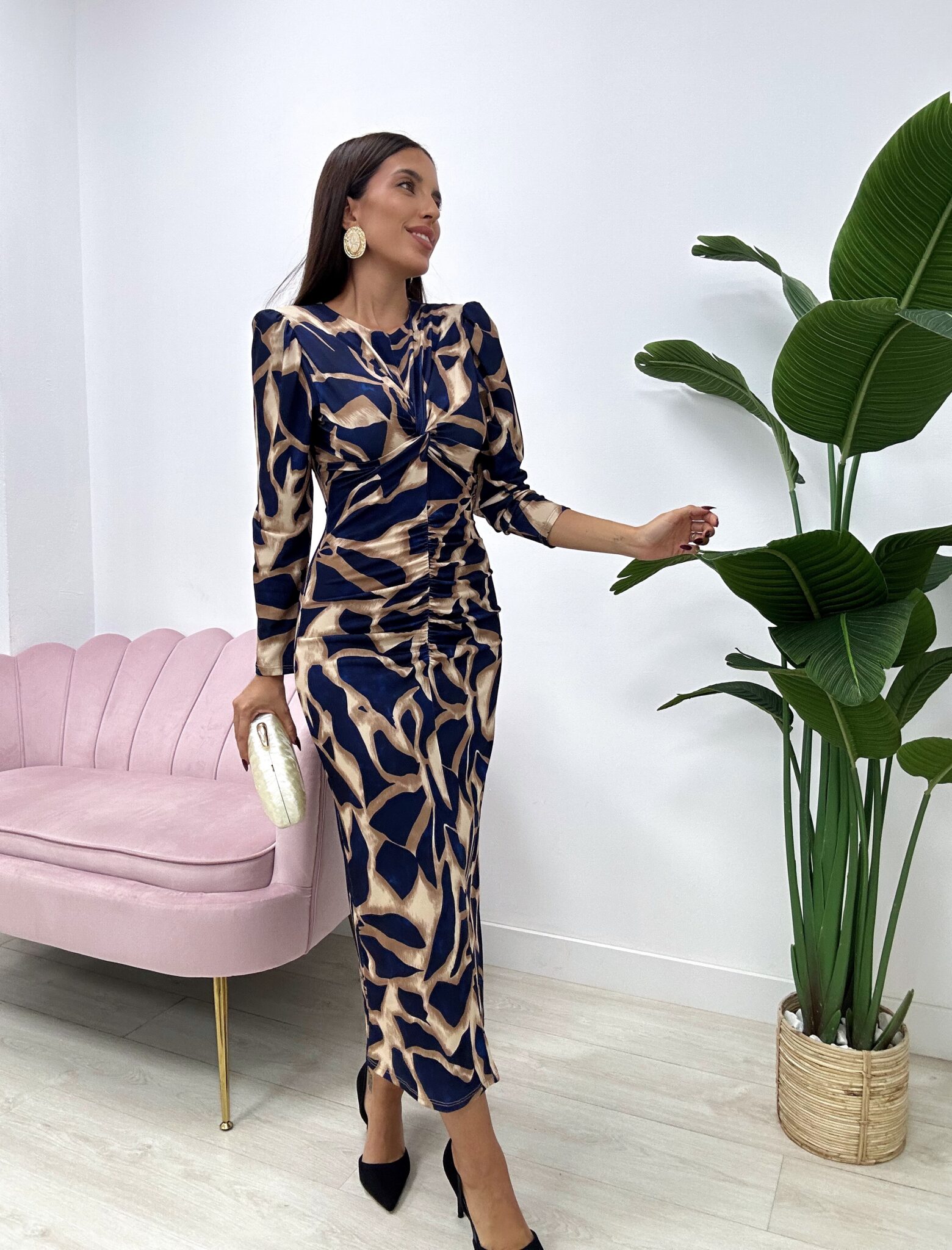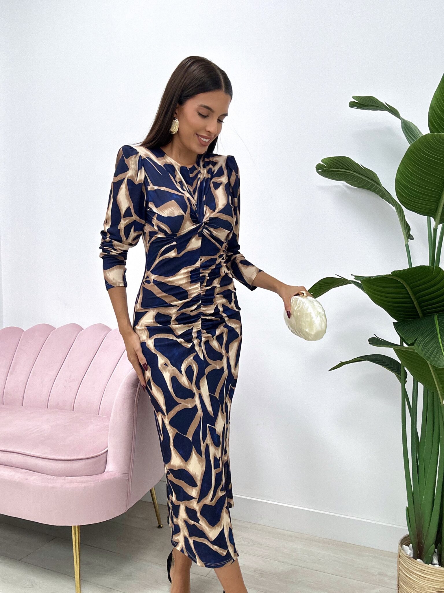 Las mangas largas con ligero volumen en los hombros le dan un aire sofisticado, mientras que el estampado en tonos azul marino y beige lo convierte en una prenda única y con mucha personalidad.