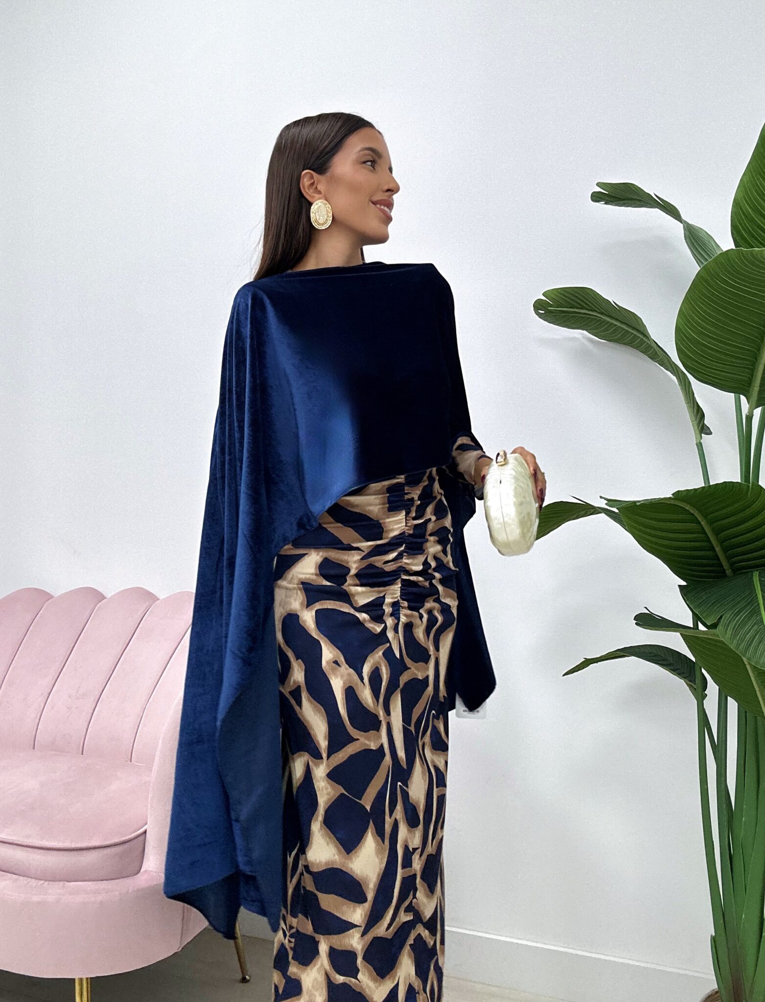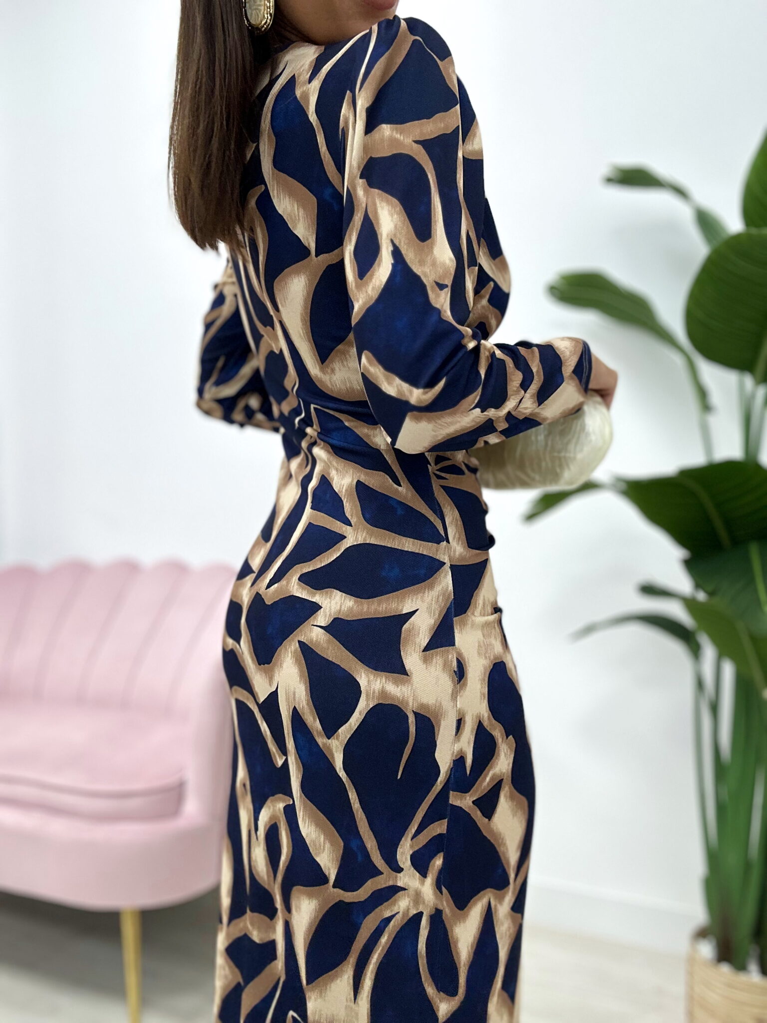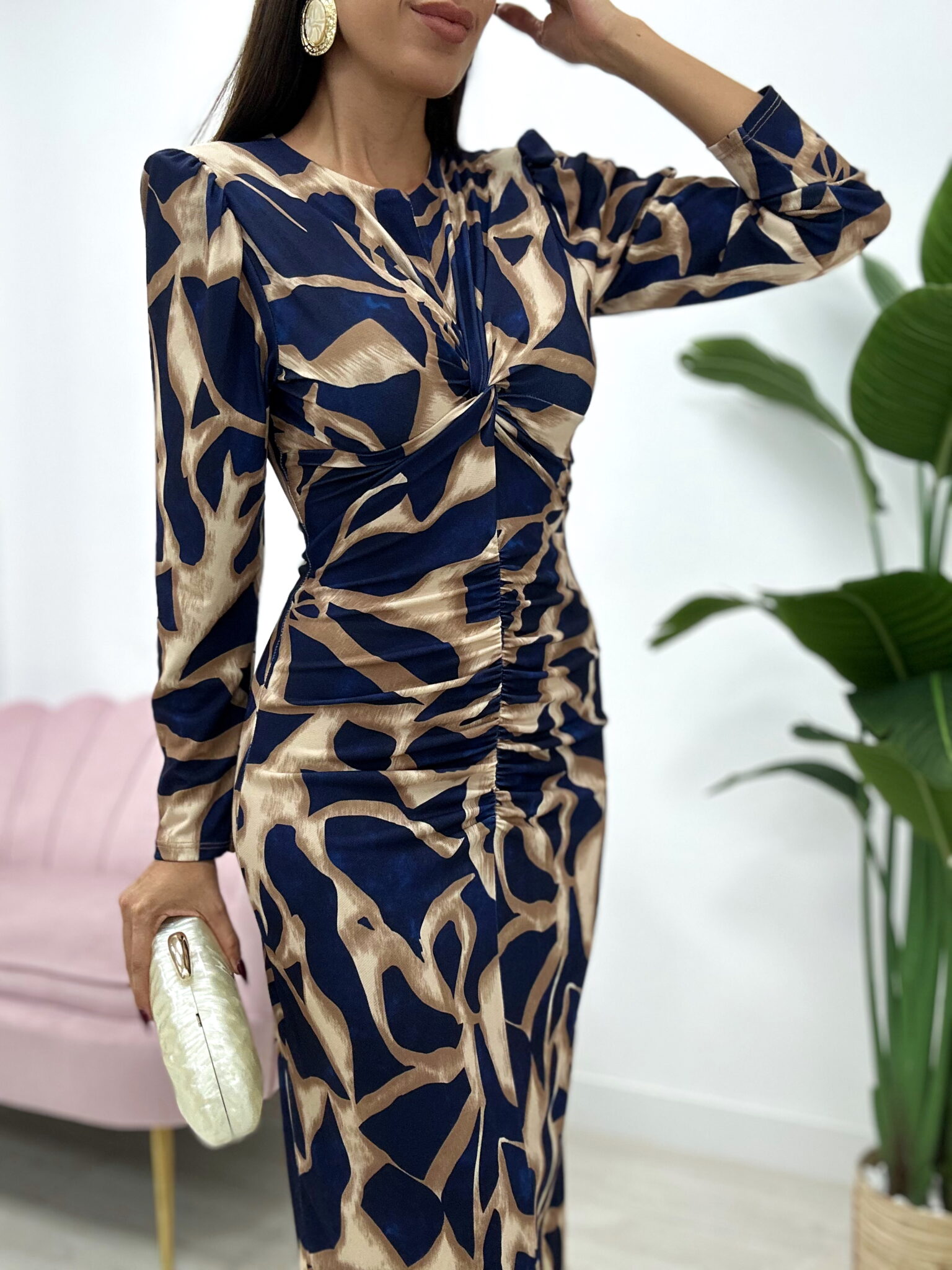 Las mangas largas con ligero volumen en los hombros le dan un aire sofisticado, mientras que el estampado en tonos azul marino y beige lo convierte en una prenda única y con mucha personalidad.