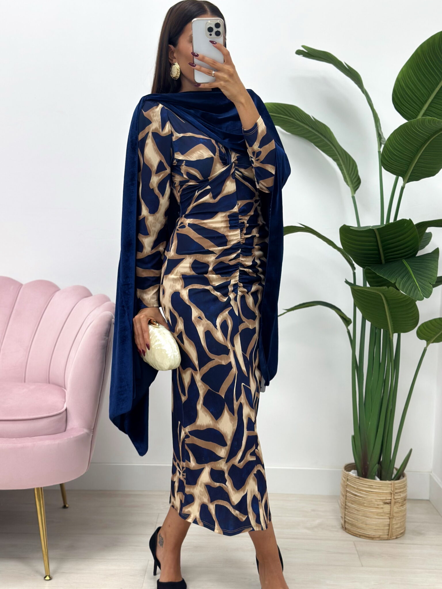 ¡El vestido que roba miradas! 💙✨ Este vestido midi con estampado, combina a la perfección elegancia y estilo moderno.