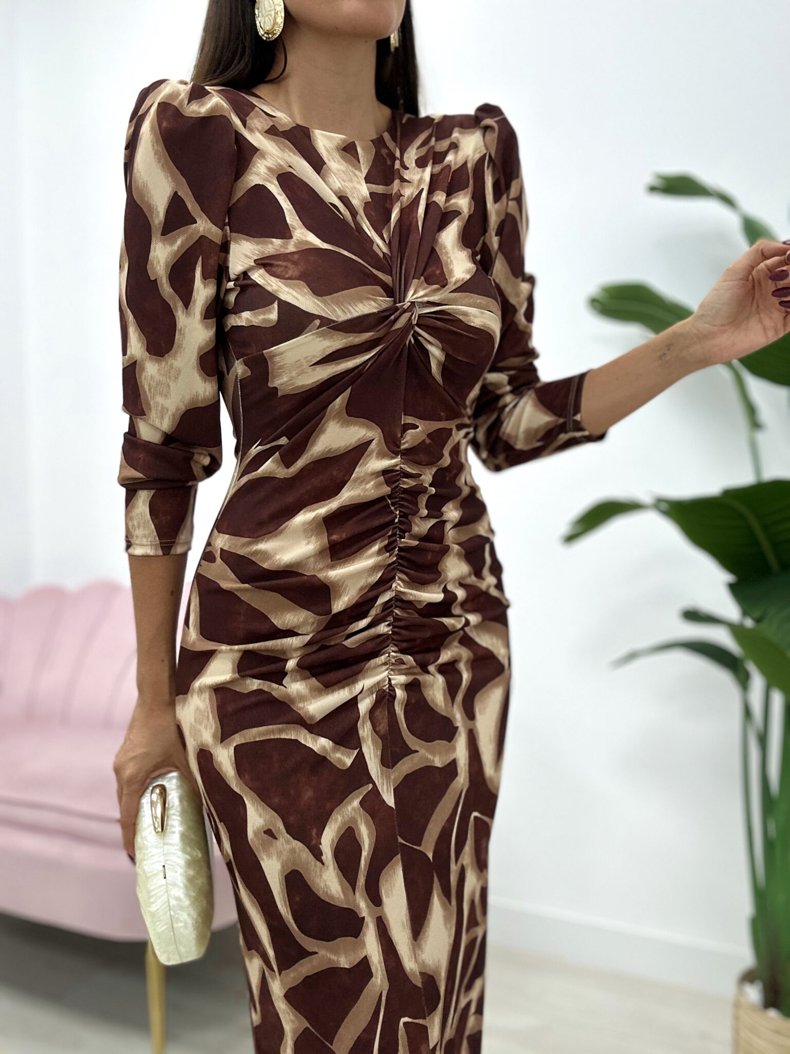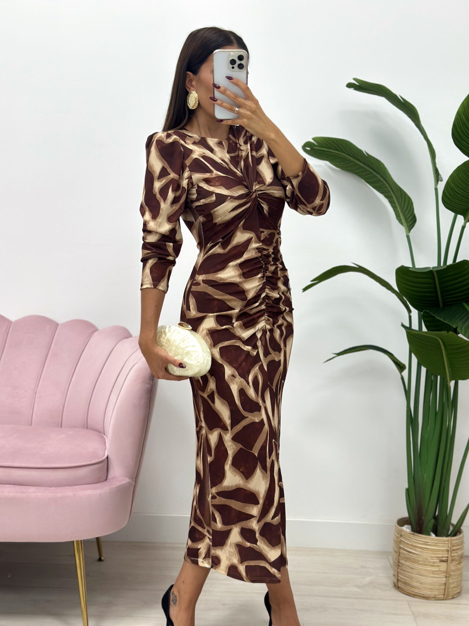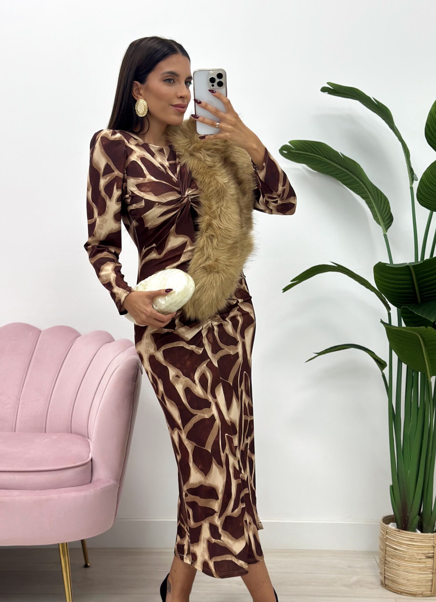 ¡El vestido que roba miradas! 🤎✨ Este vestido midi con estampado, combina a la perfección elegancia y estilo moderno.