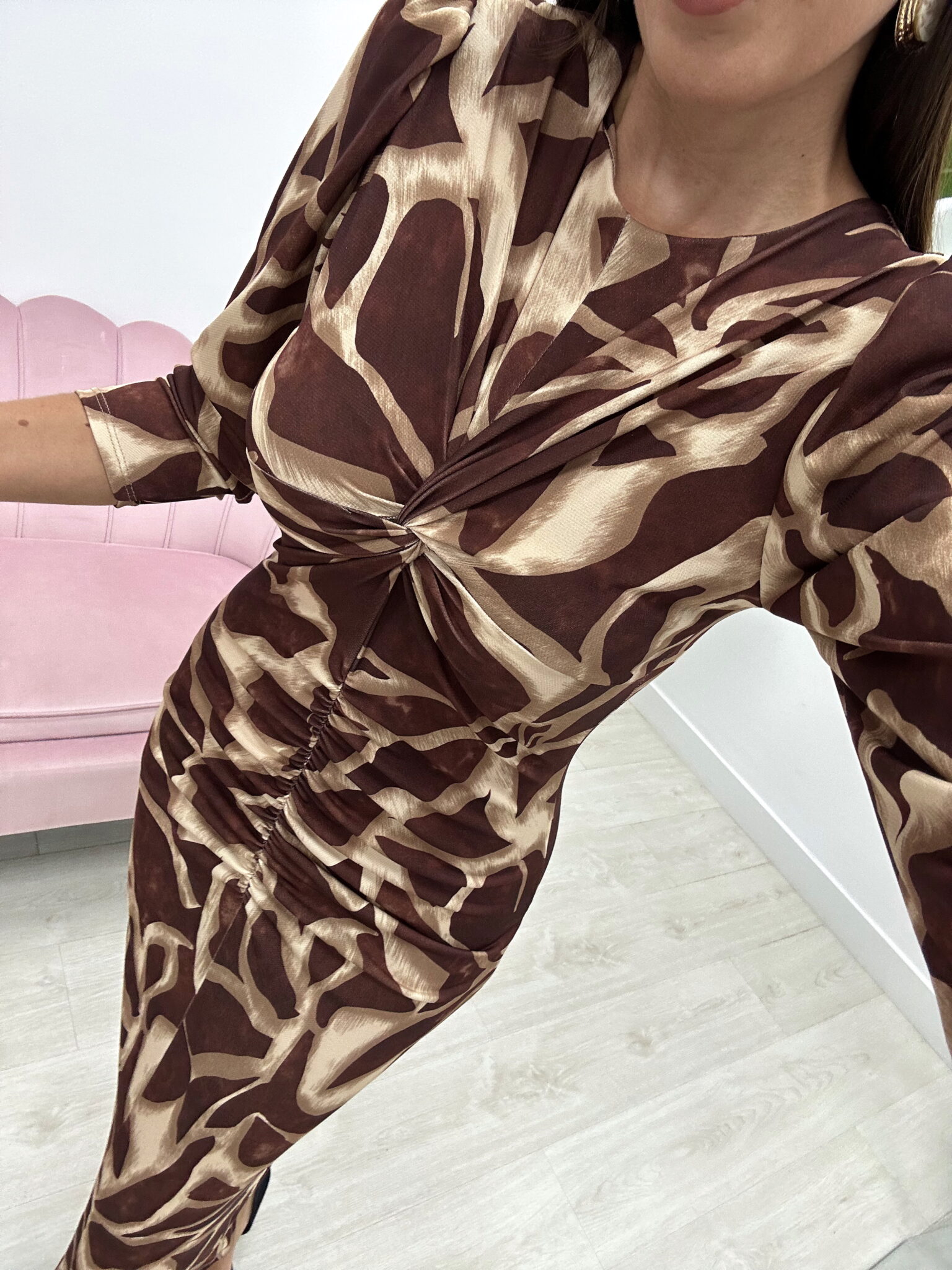 Las mangas largas con ligero volumen en los hombros le dan un aire sofisticado, mientras que el estampado en tonos marrones y beige lo convierte en una prenda única y con mucha personalidad.