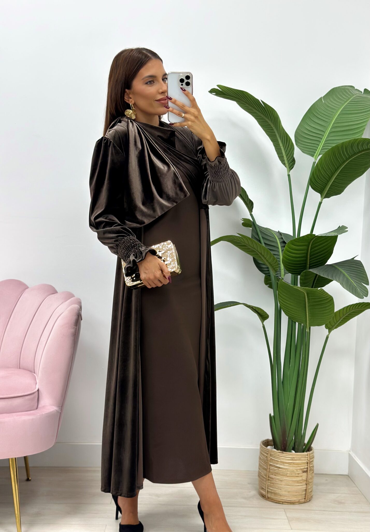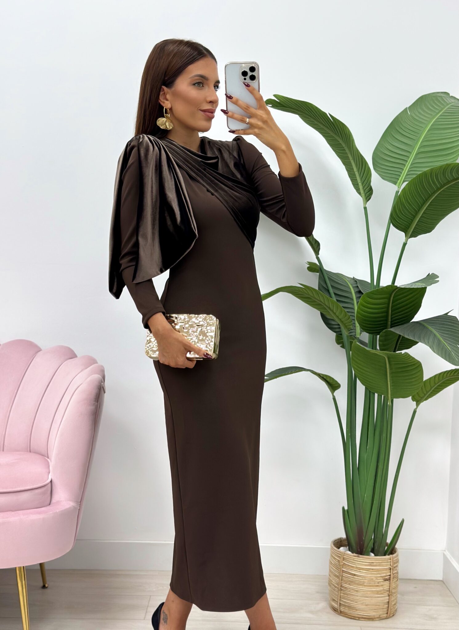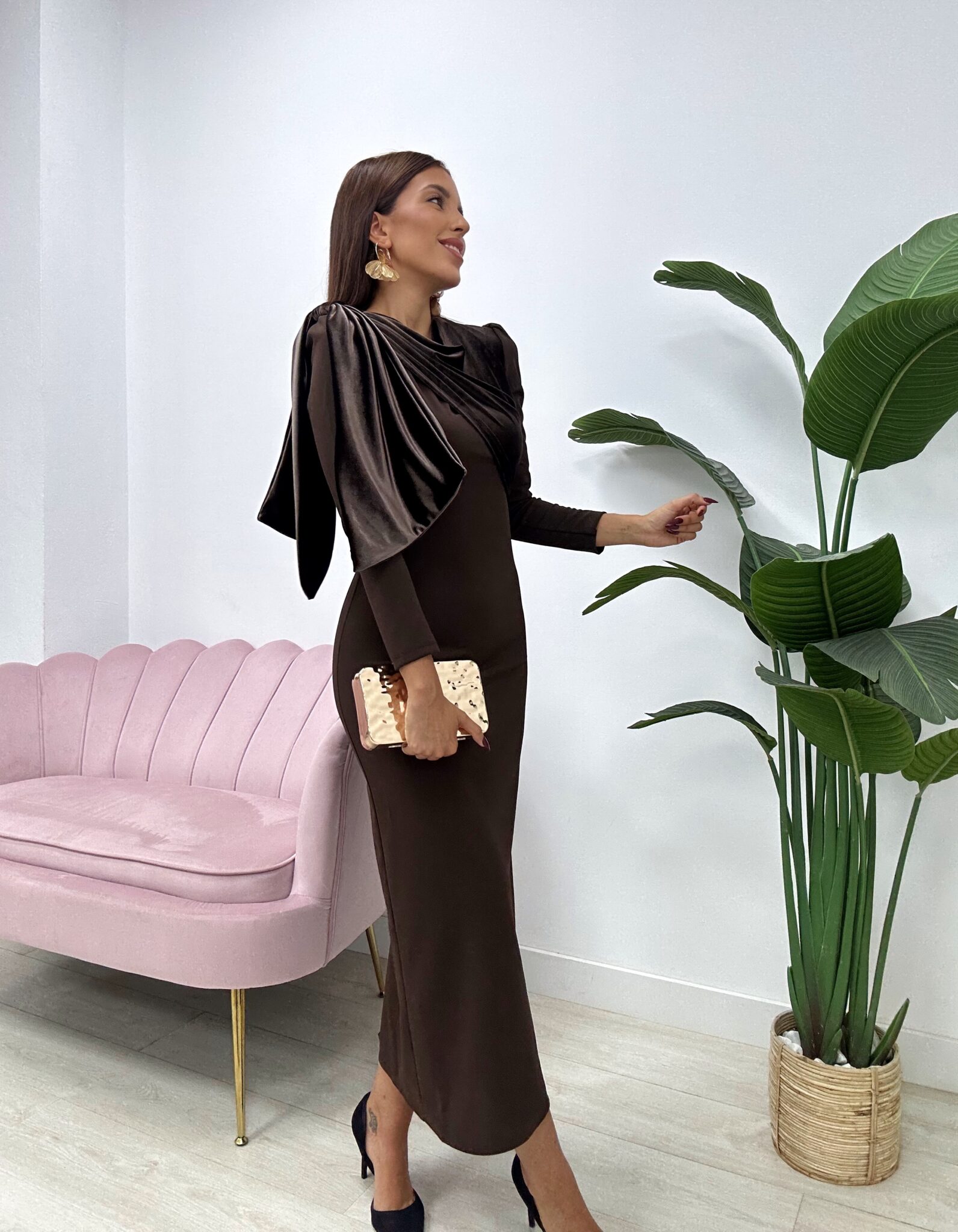 Eleva tu estilo con este elegante vestido de fiesta en marrón, un vestido sofisticado diseñado para destacar en cualquier evento especial.