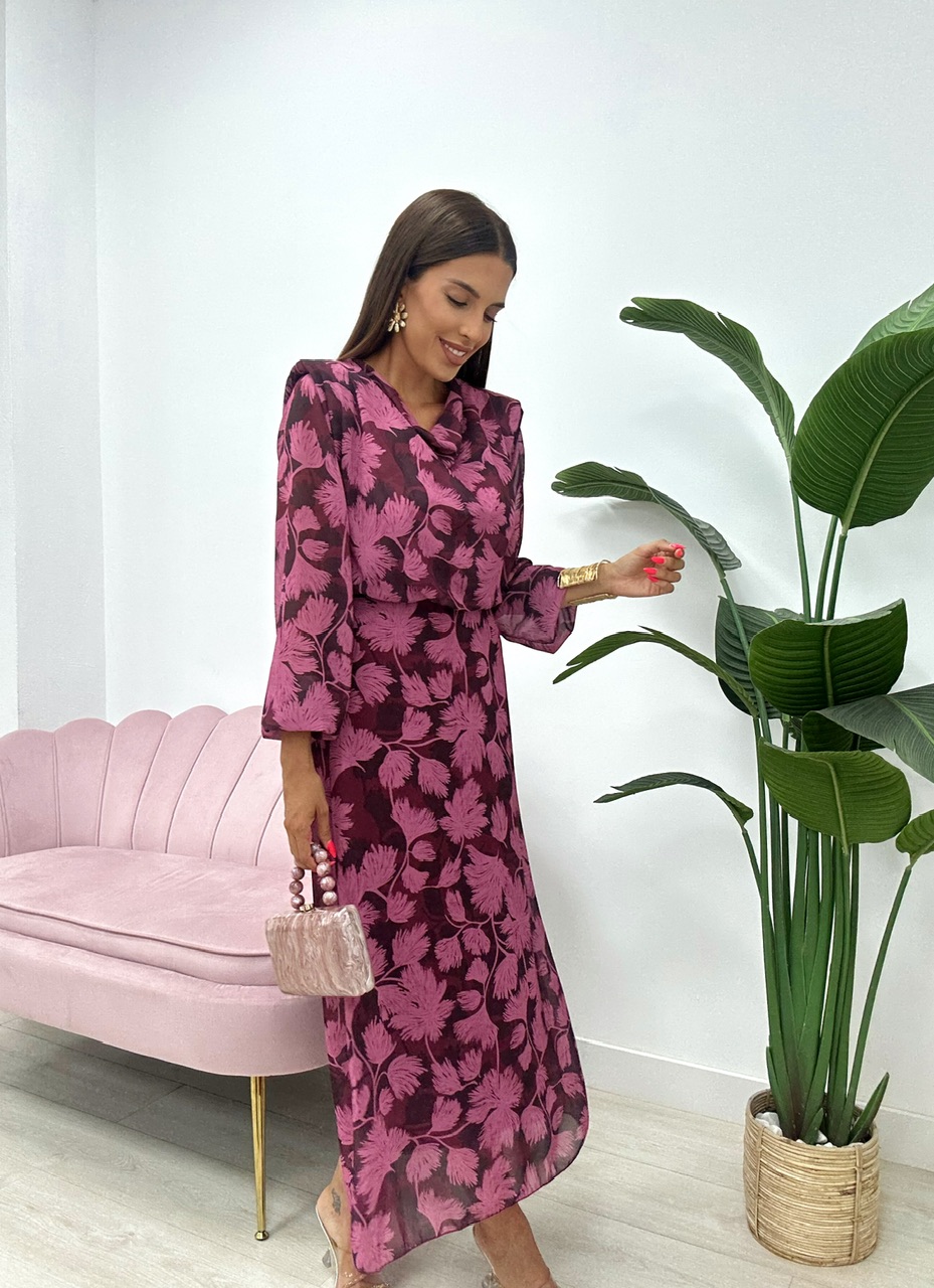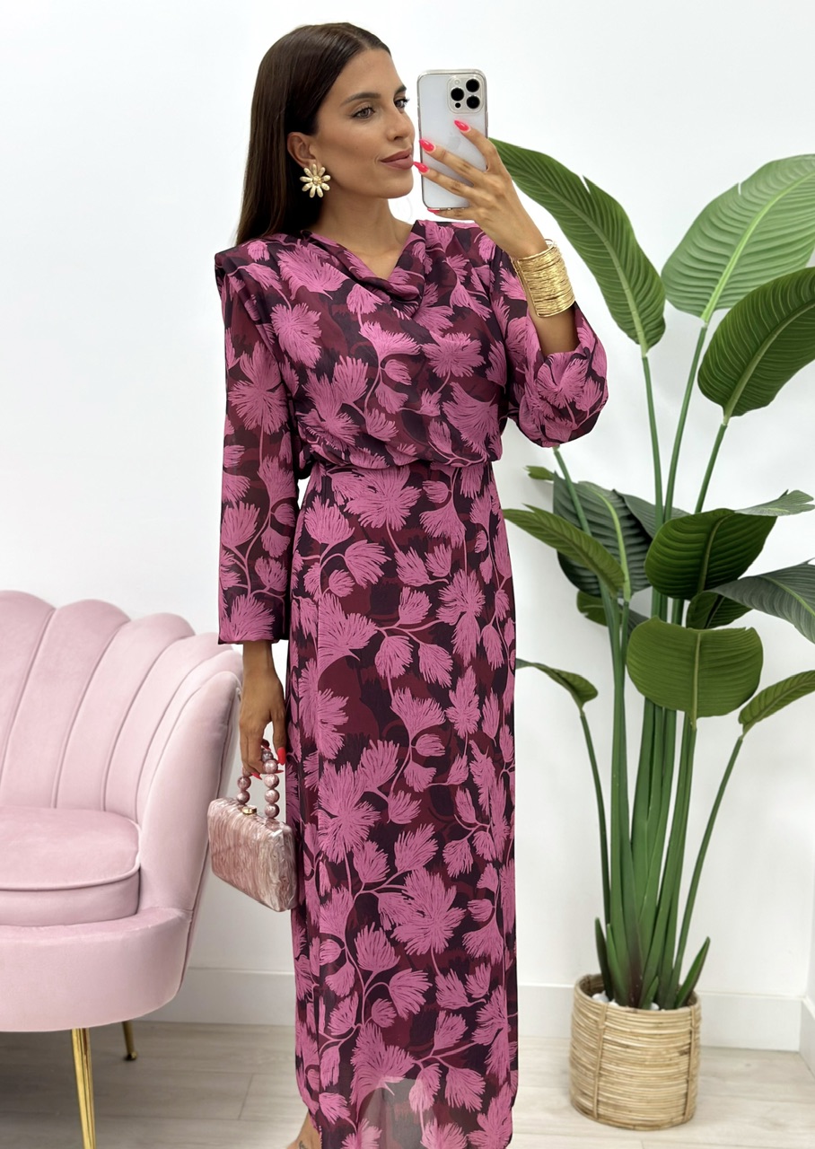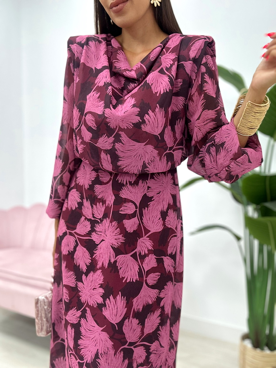Llama la atención por su vivo estampado y es perfecto para cualquier evento como bodas o bautizos. Las hombreras y el escote en cascada le proporcionan mucha elegancia.