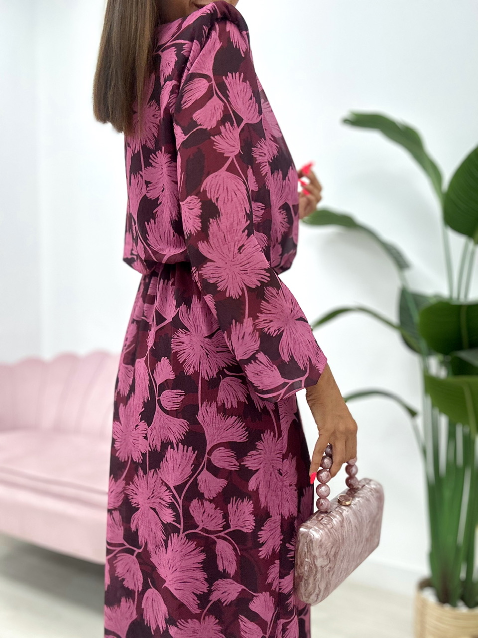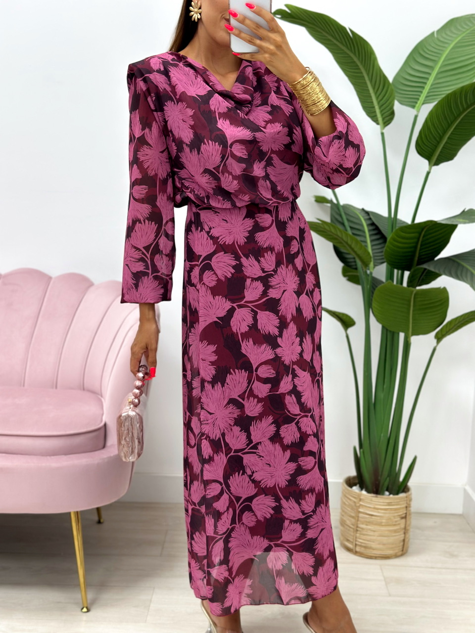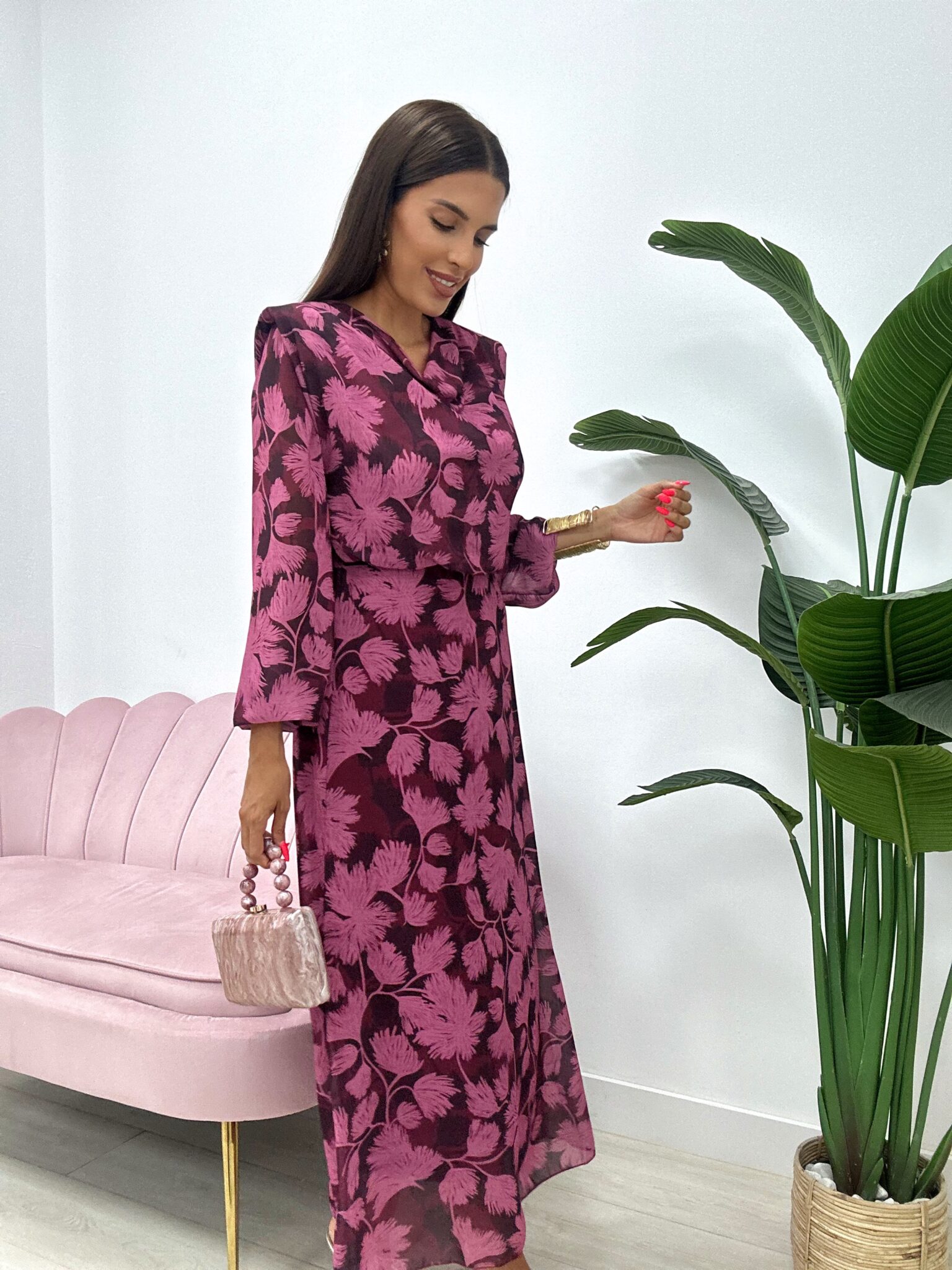 Llama la atención por su vivo estampado y es perfecto para cualquier evento como bodas o bautizos. Las hombreras y el escote en cascada le proporcionan mucha elegancia.