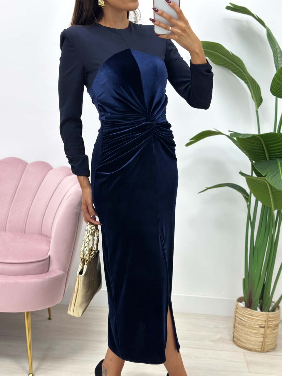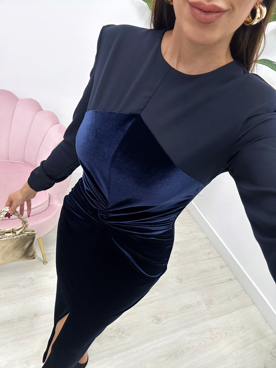 Este vestido midi en tono azul marino mezcla elegancia y estilo con un toque actual.
