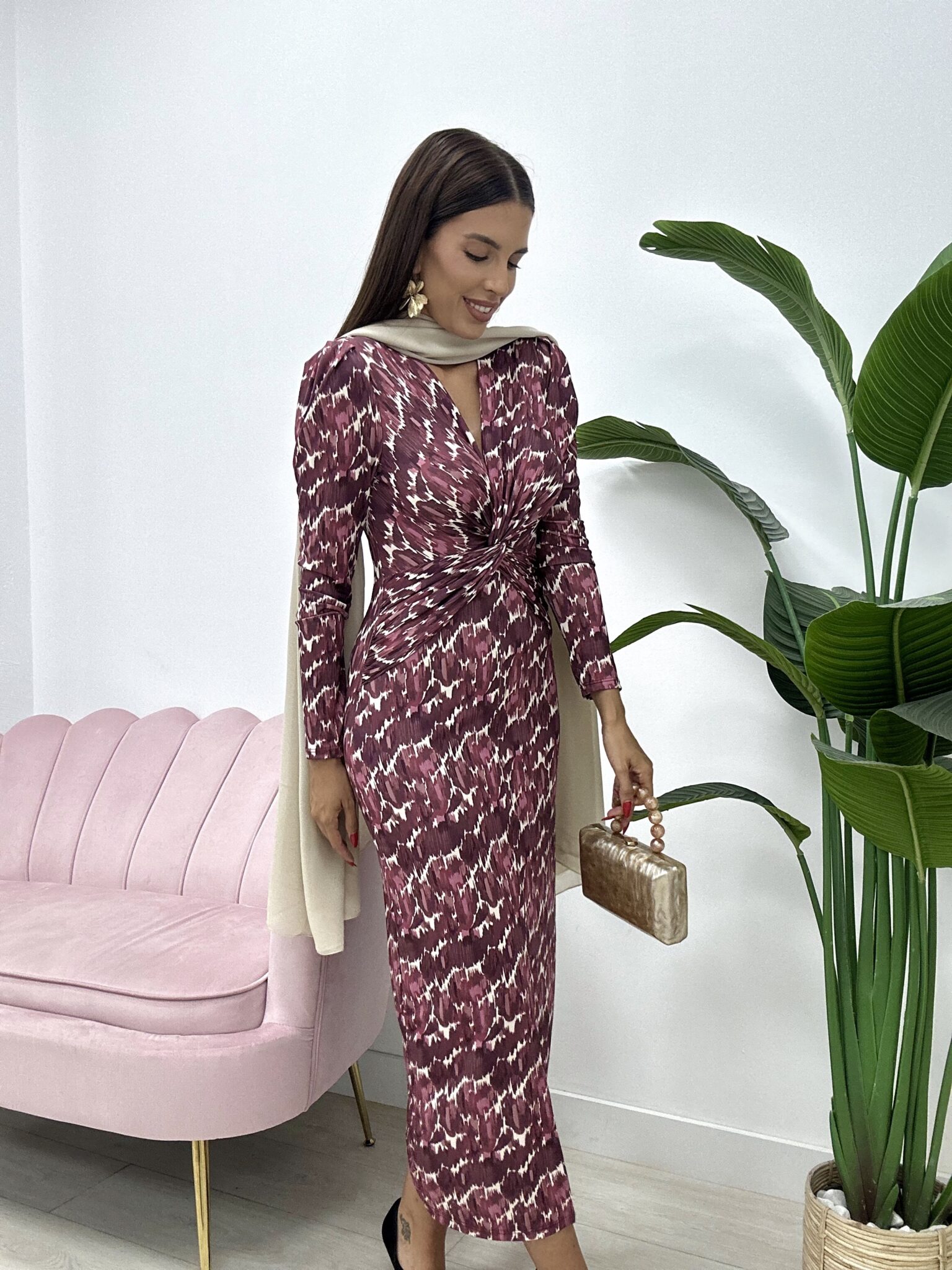 Está confeccionado en tejido elástico (sin cremallera) con un estampado muy actual en tonos azules. El escote en V y el drapeado cruzado justo debajo del pecho hacen que favorezca mucho la figura y quede totalmente estilizada. También lleva hombreras aportando así, un volumen más armonioso.