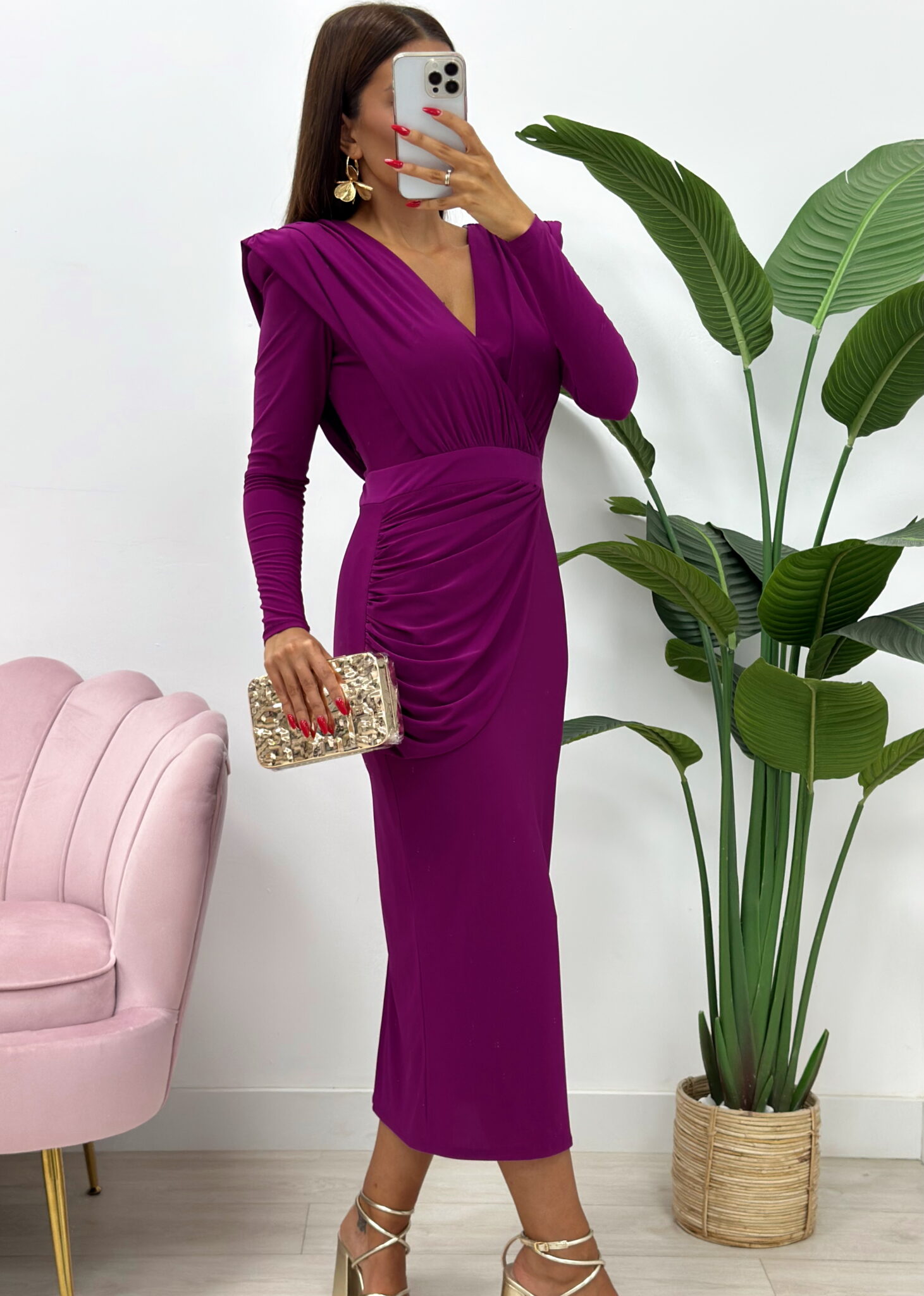 Luce sofisticada y radiante con este elegante vestido midi en un vibrante tono buganvilla, perfecto para invitadas a bodas, cócteles y eventos especiales.