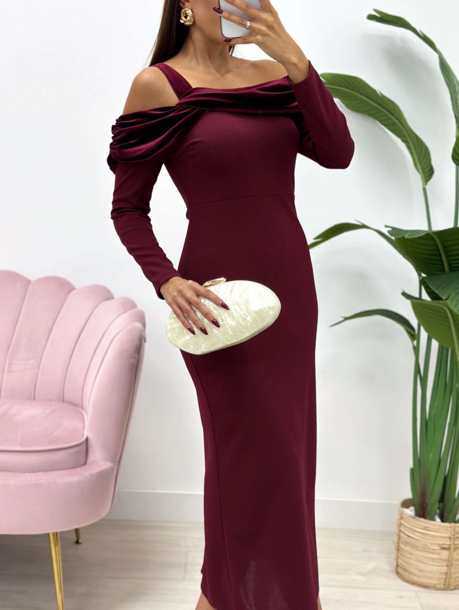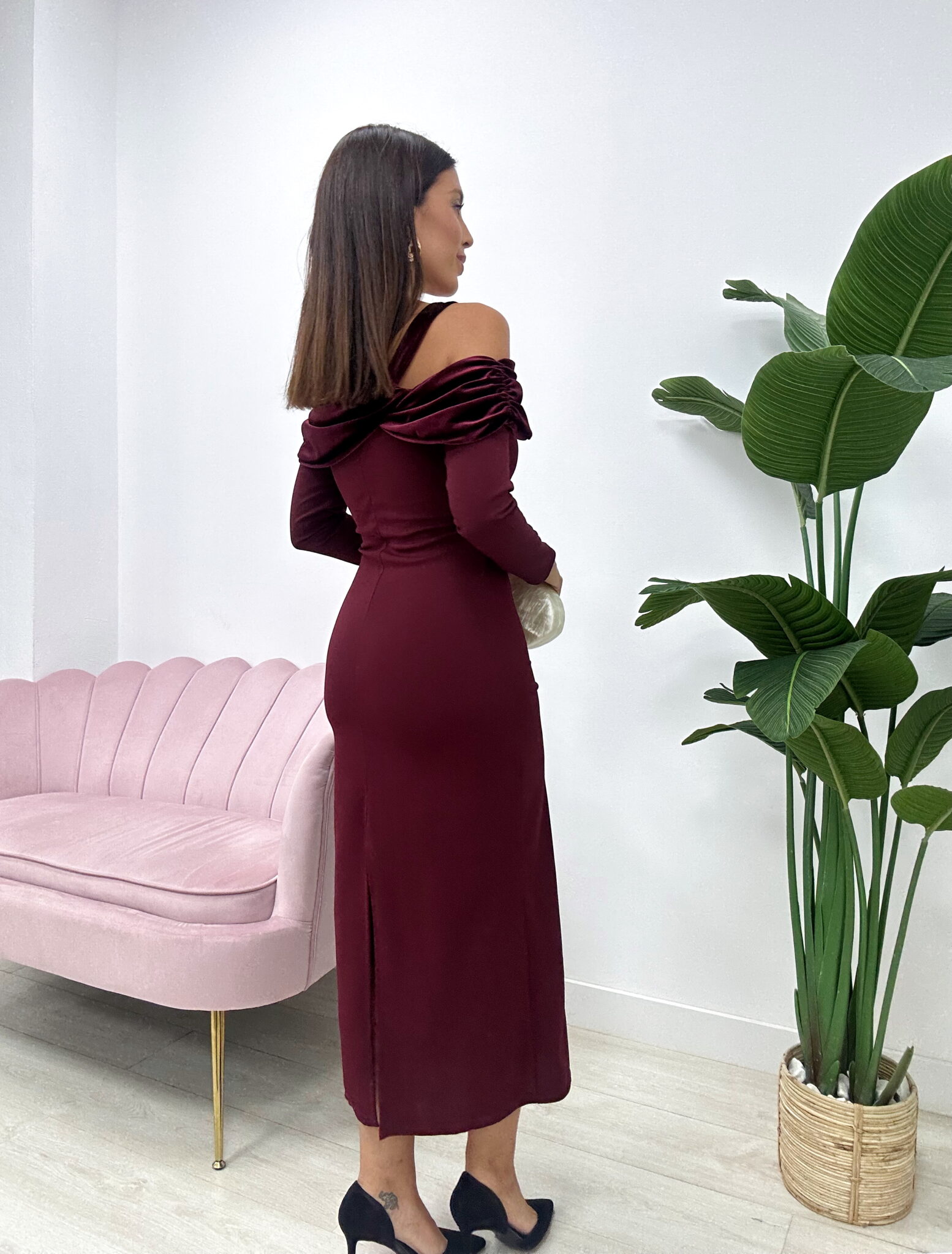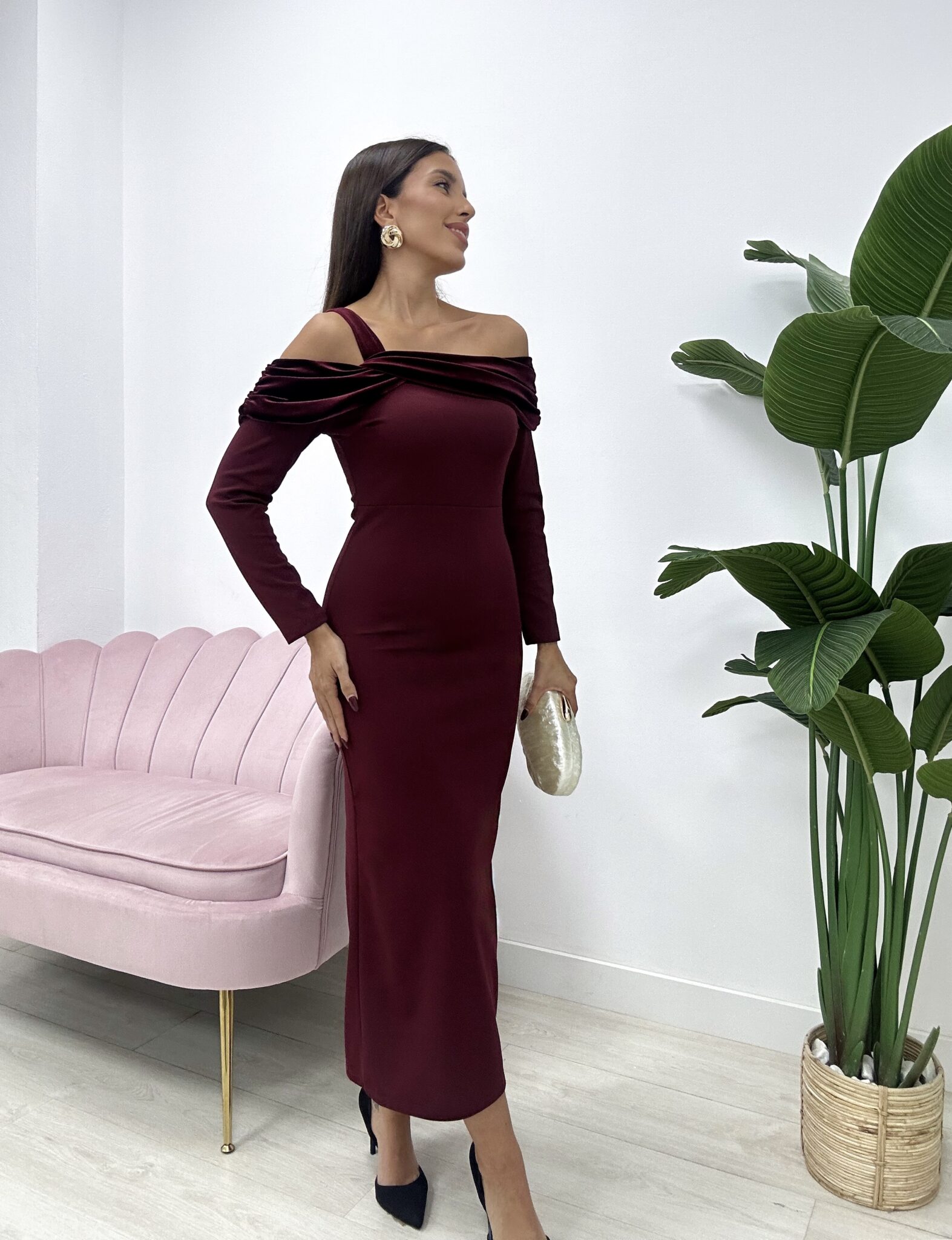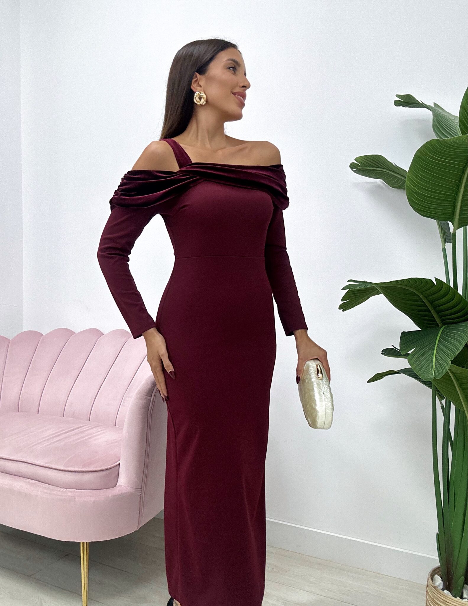 Impacta con este sofisticado vestido en tono burdeos, un color profundo y favorecedor ideal para eventos de día y de noche.