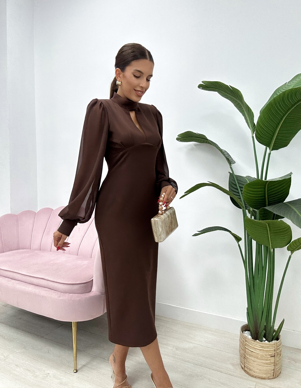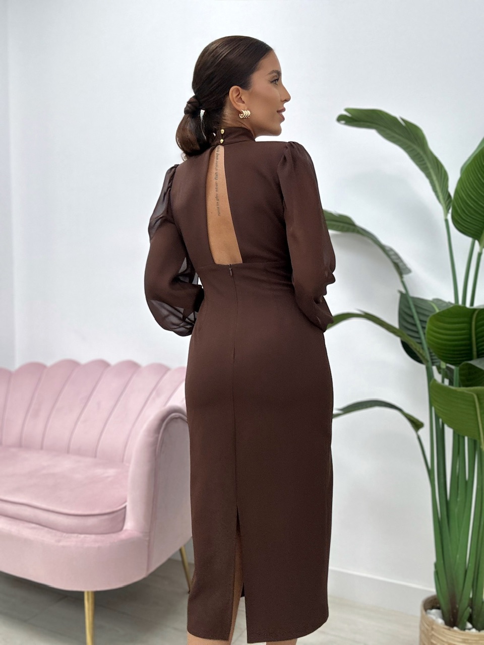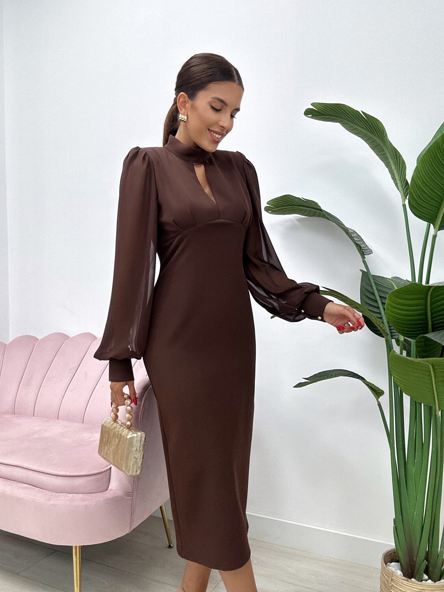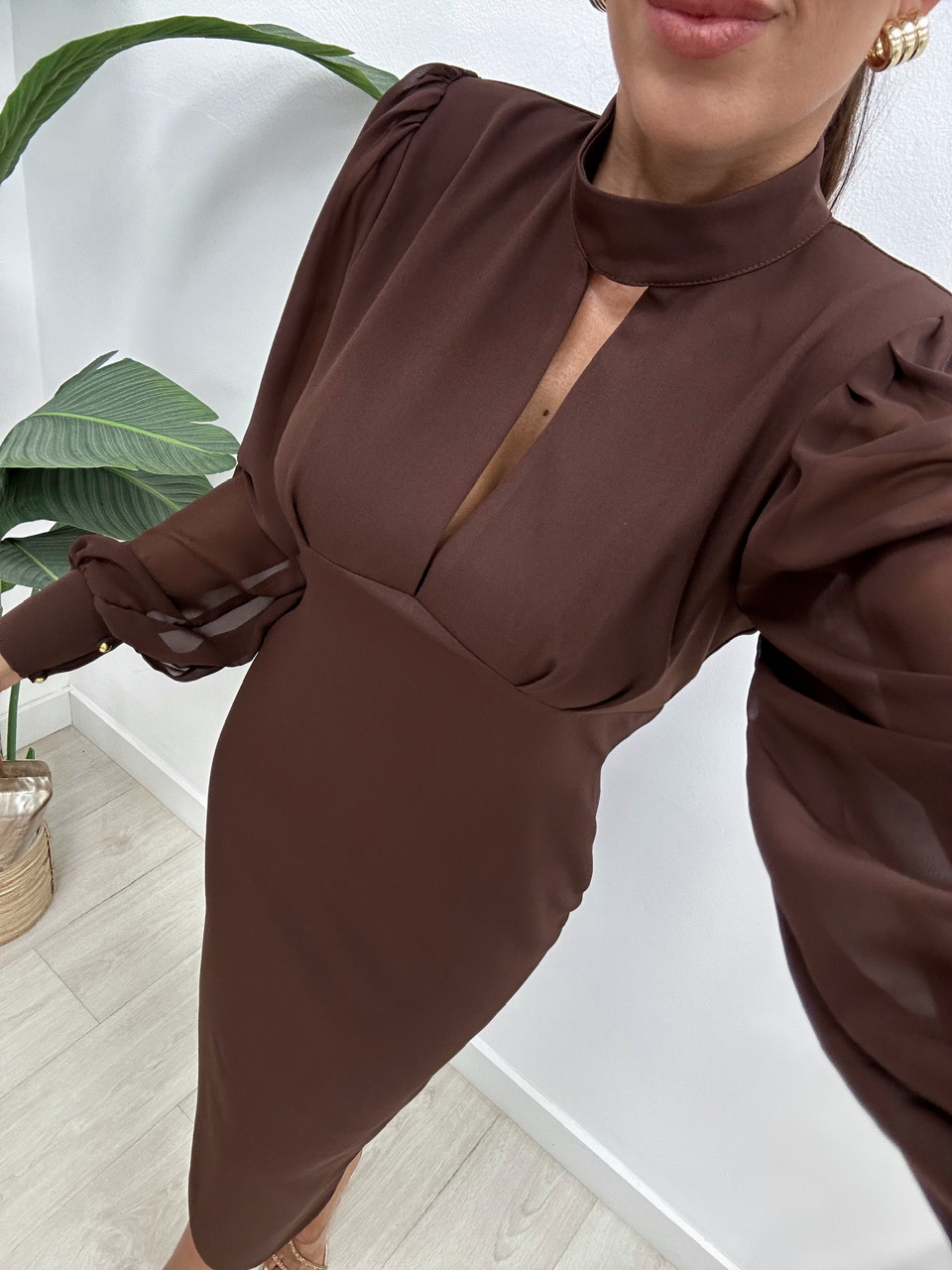 La elegancia de las mangas en tejido gasa fluida con acabado en puño y detalle de botones dorados hace que este vestido marque la diferencia.