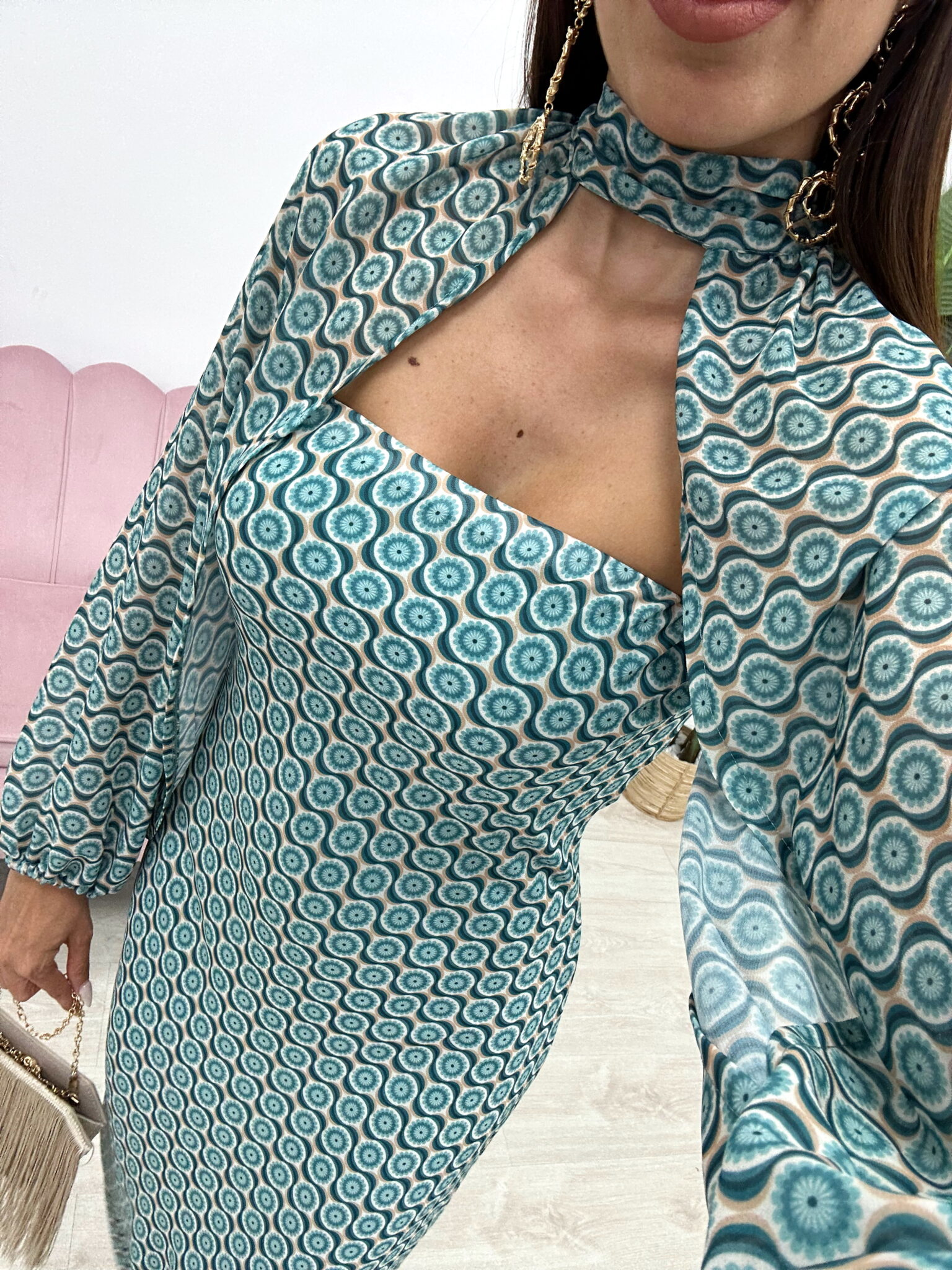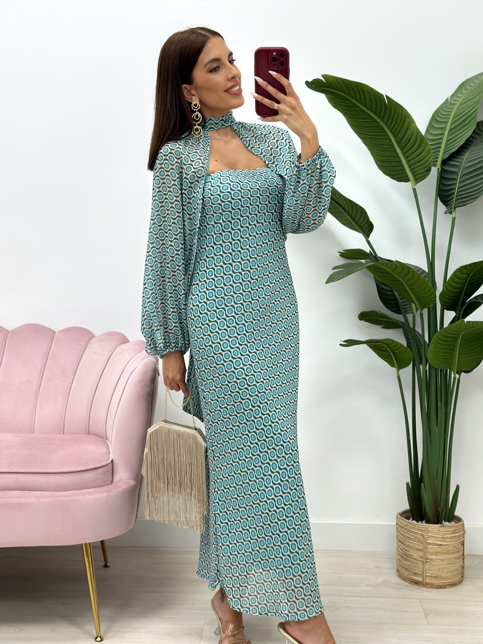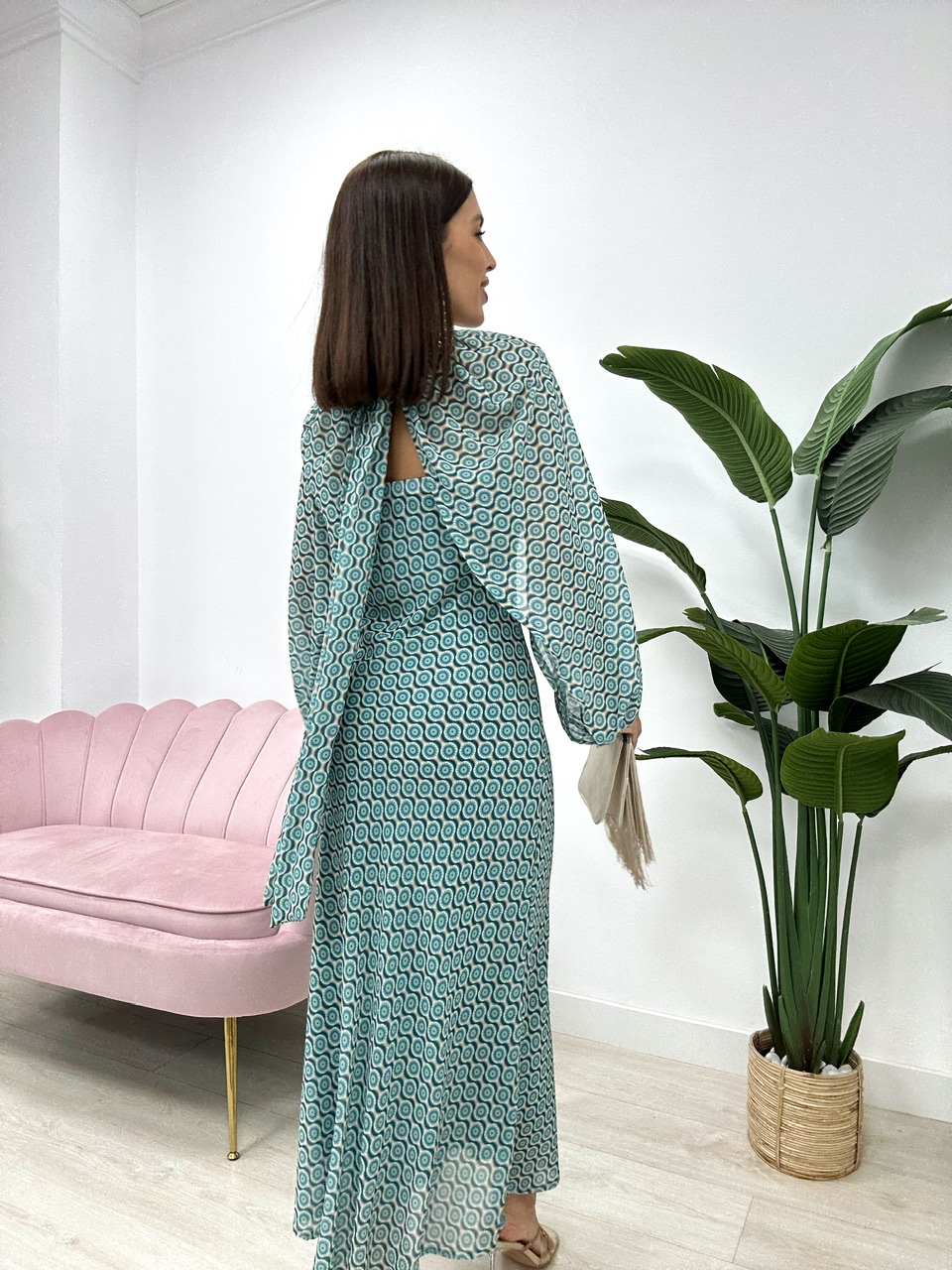 compuesto por vestido, lazada y capa con mangas. El vestido lleva goma elástica en la zona del pecho y forro completo.
