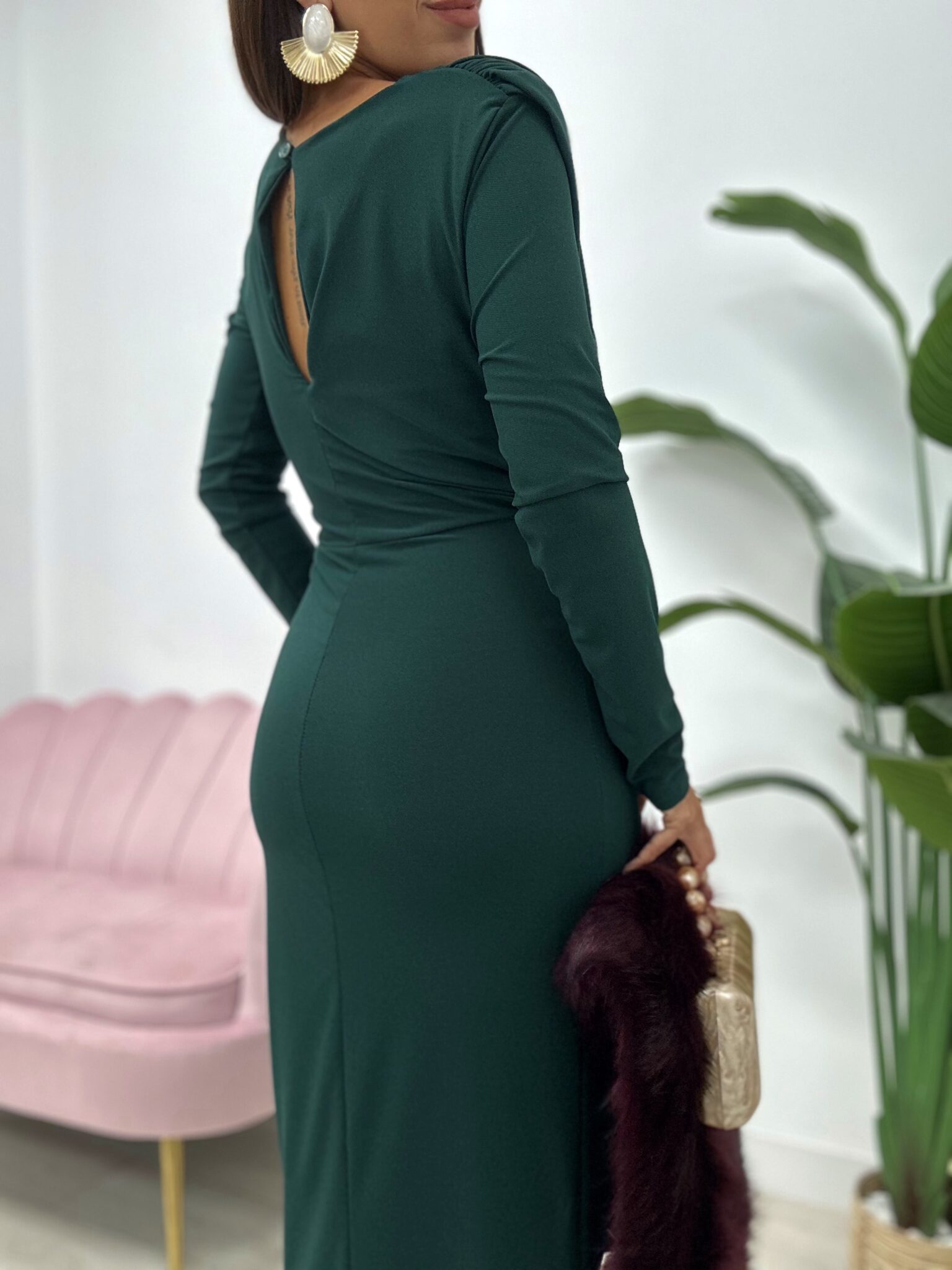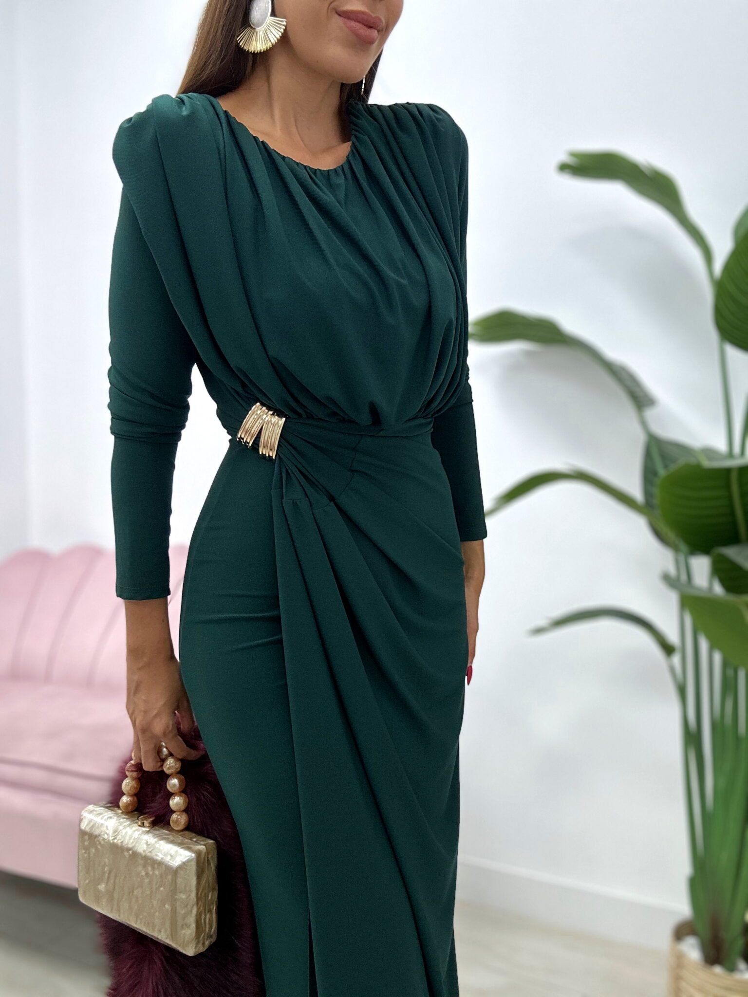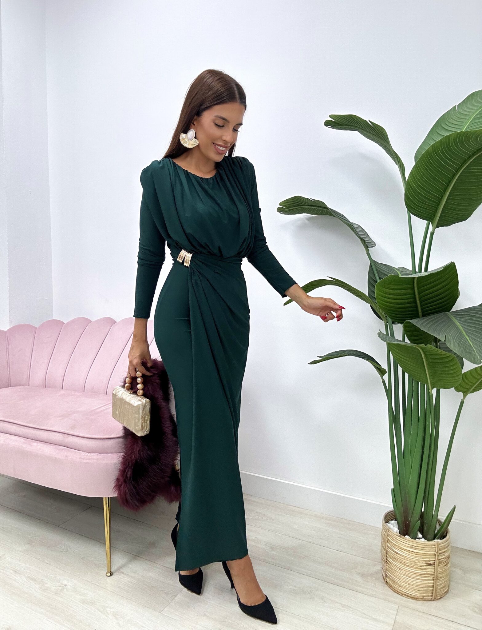 Deslumbra con elegancia y sofisticación con este espectacular vestido largo midi en tono verde botella, ideal para invitadas a bodas de otoño-invierno, eventos de noche o celebraciones especiales.