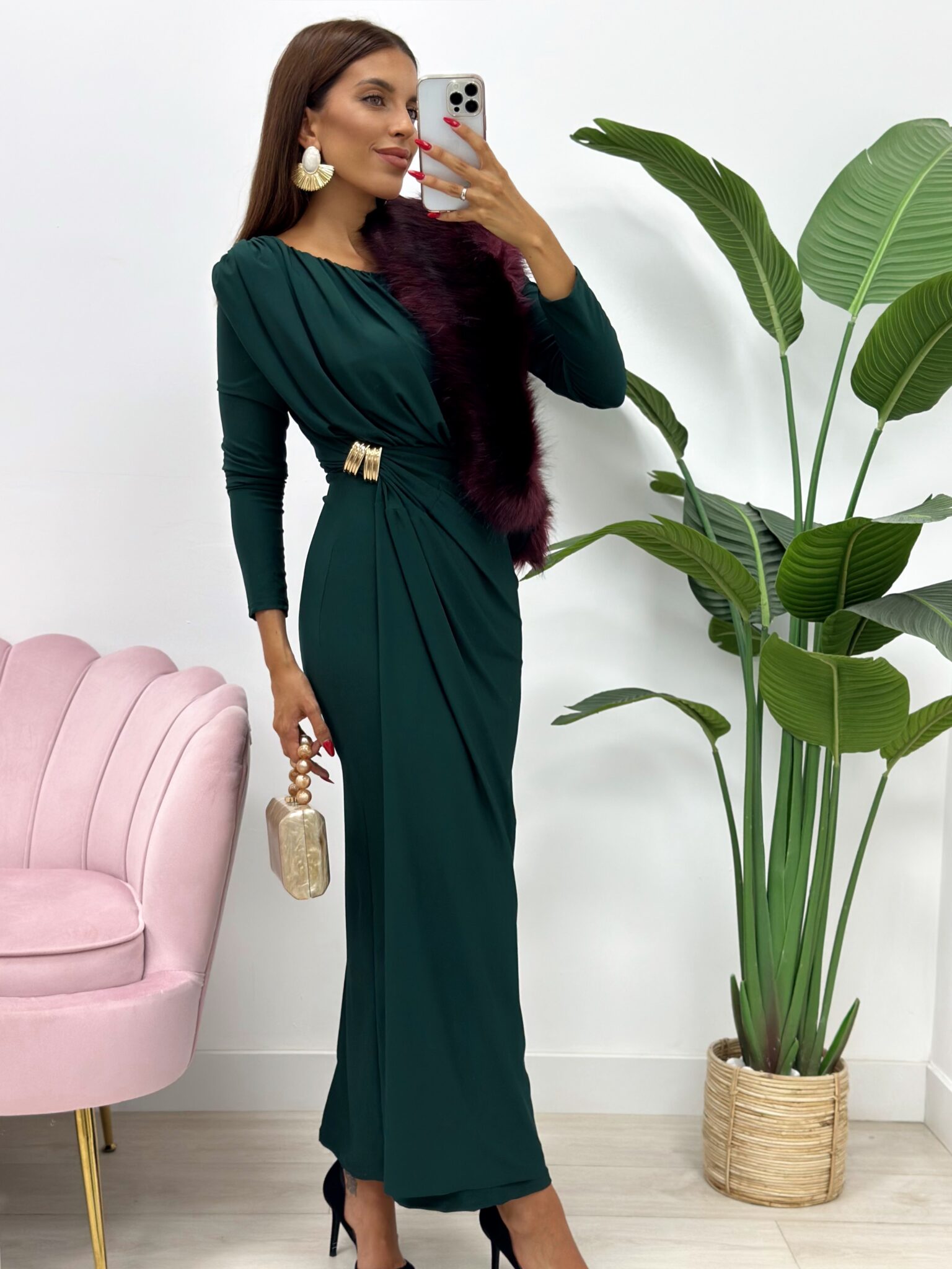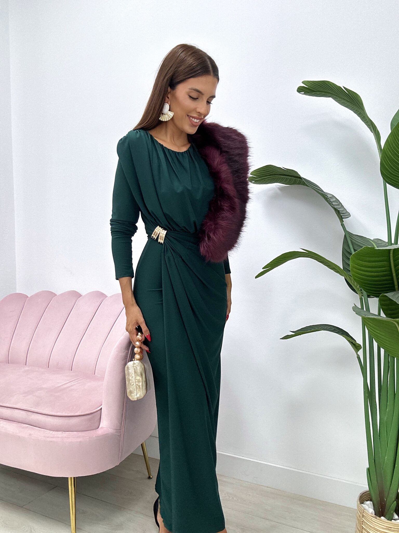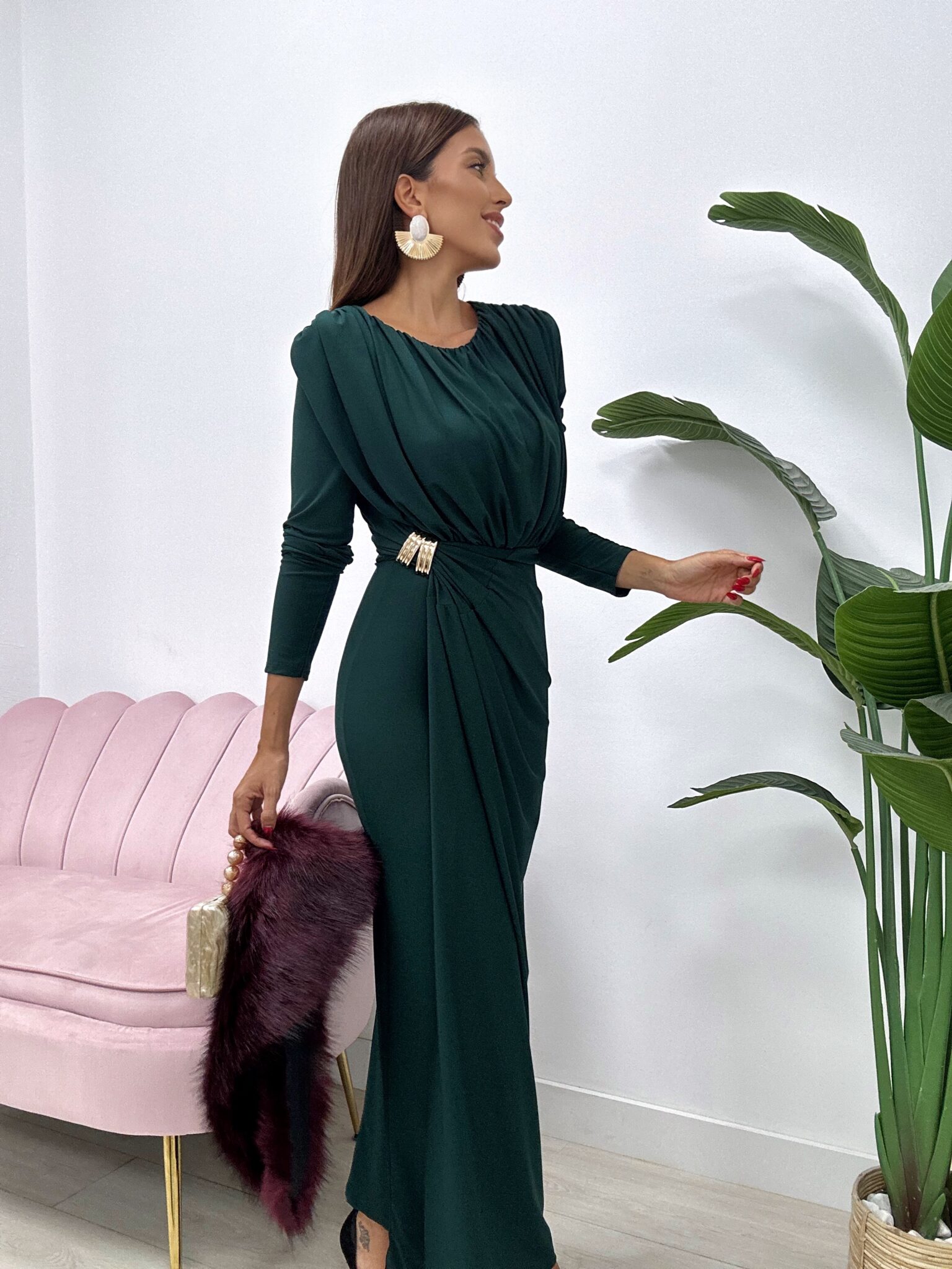 Deslumbra con elegancia y sofisticación con este espectacular vestido largo midi en tono verde botella, ideal para invitadas a bodas de otoño-invierno, eventos de noche o celebraciones especiales.