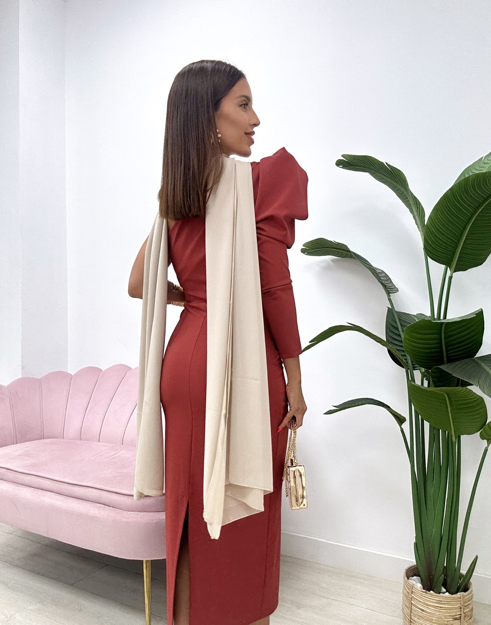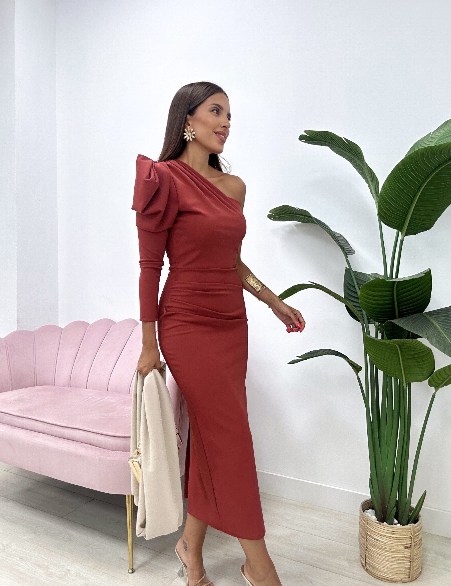 Vestido asimétrico con manga abullonada. Cierre con cremallera lateral invisible. Lleva drapeado en la cintura. Tiene raja trasera. Manga en brazo izquierdo.