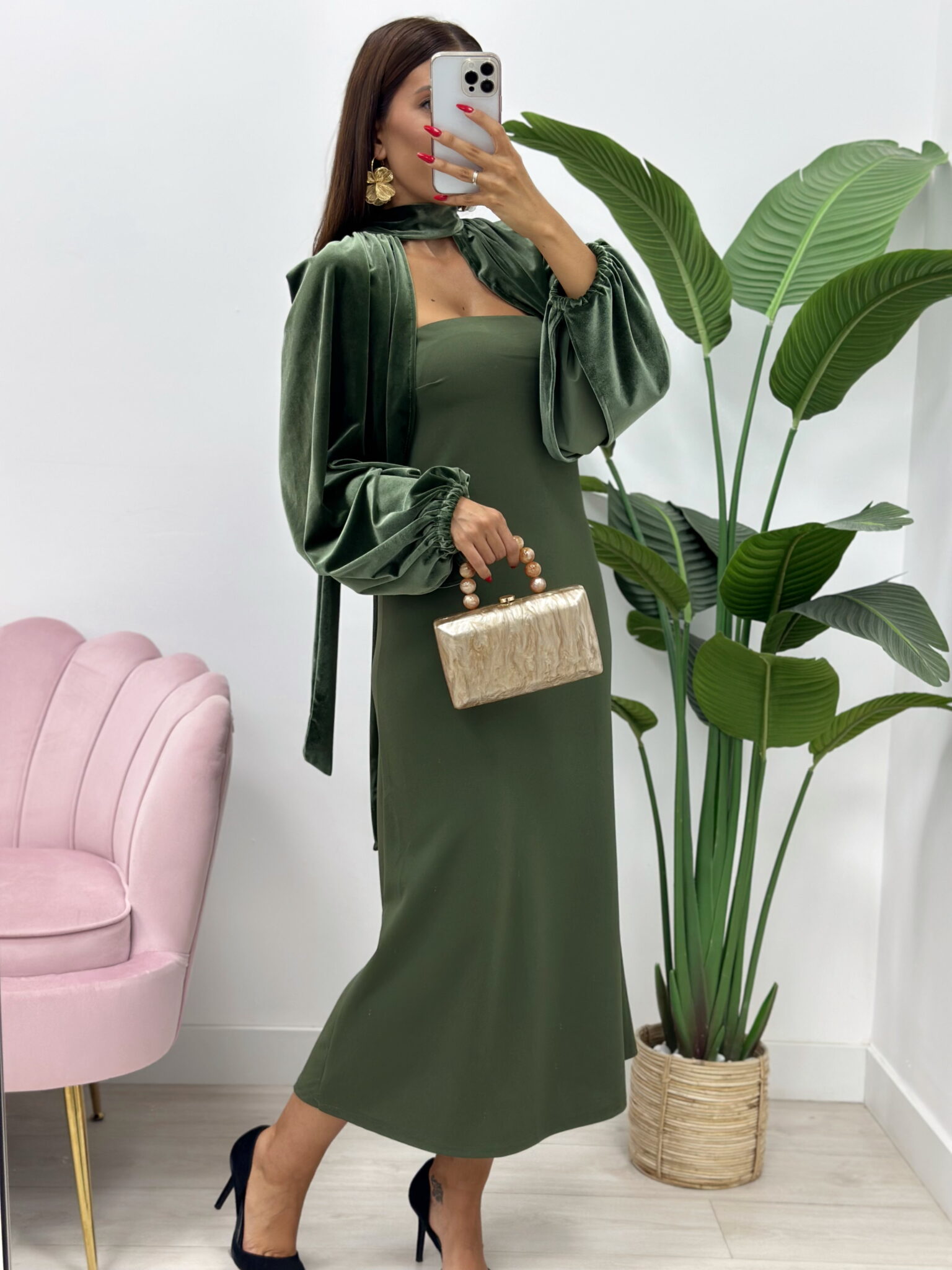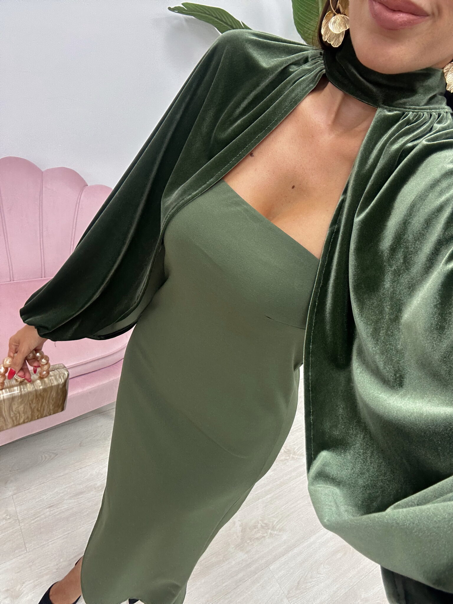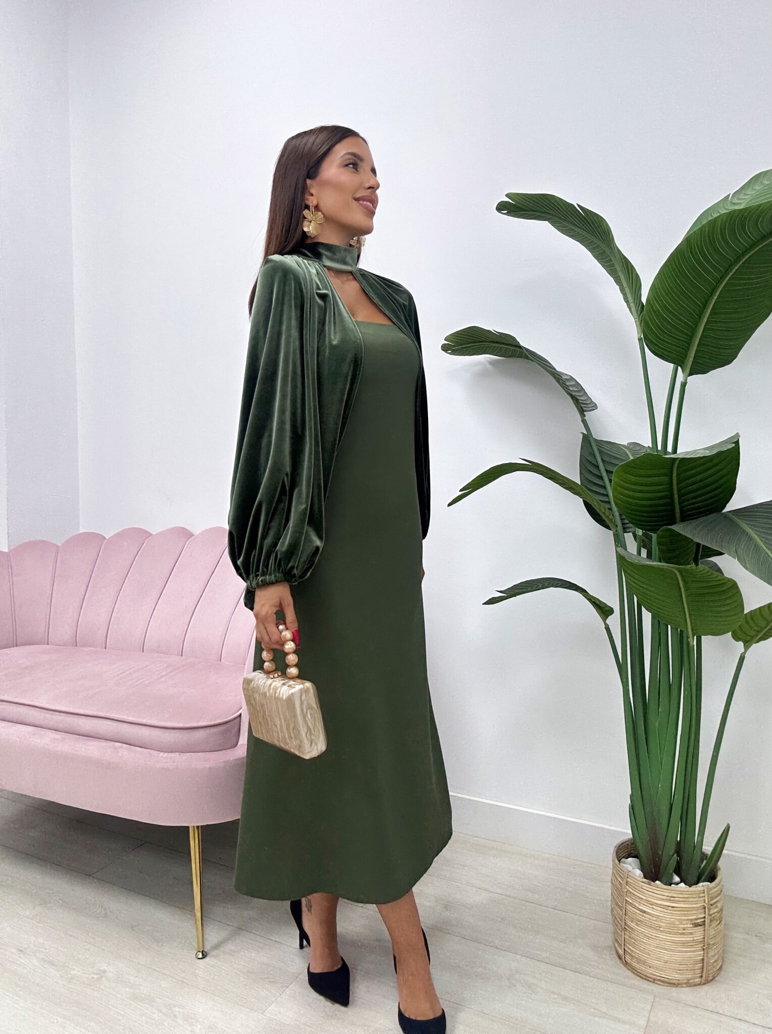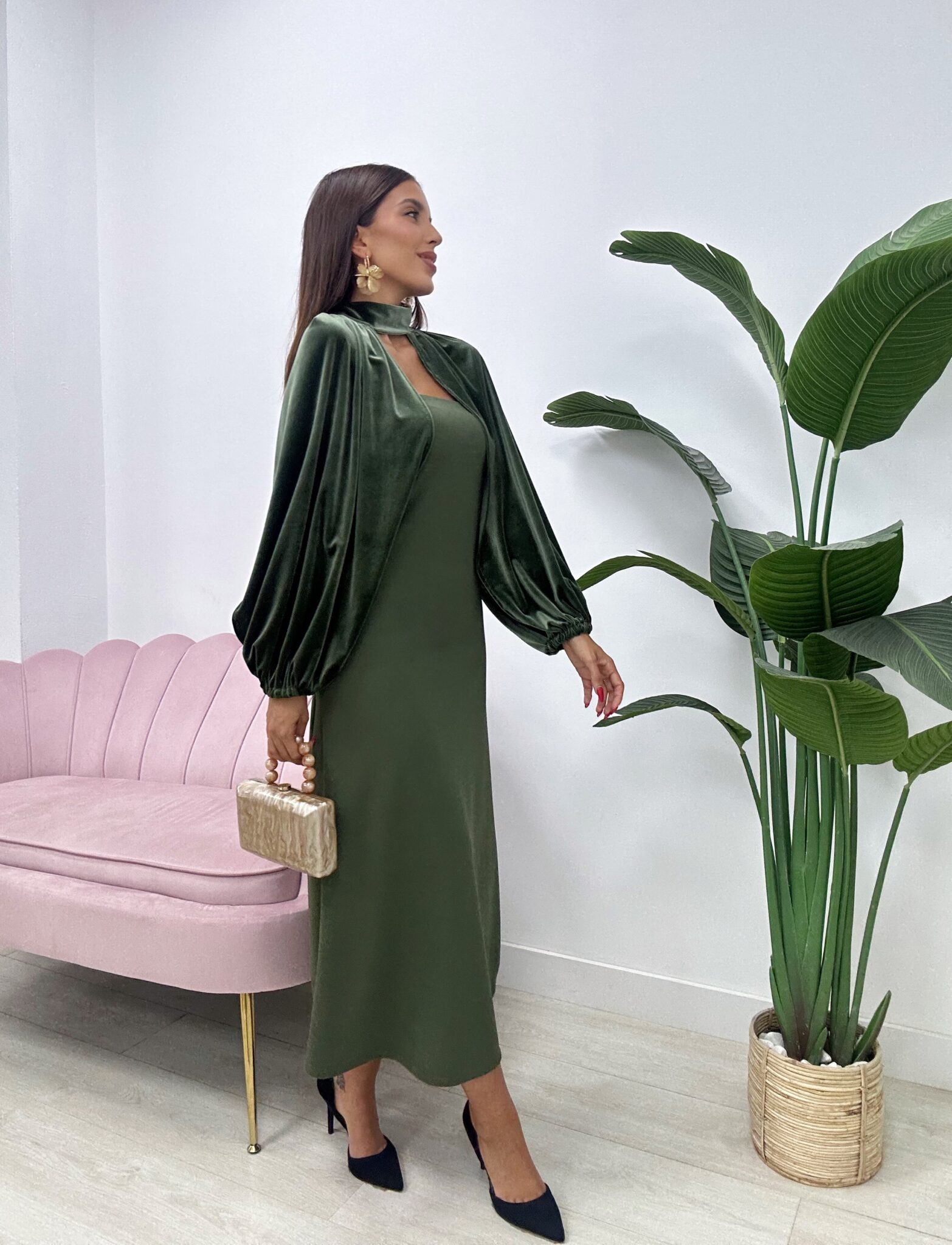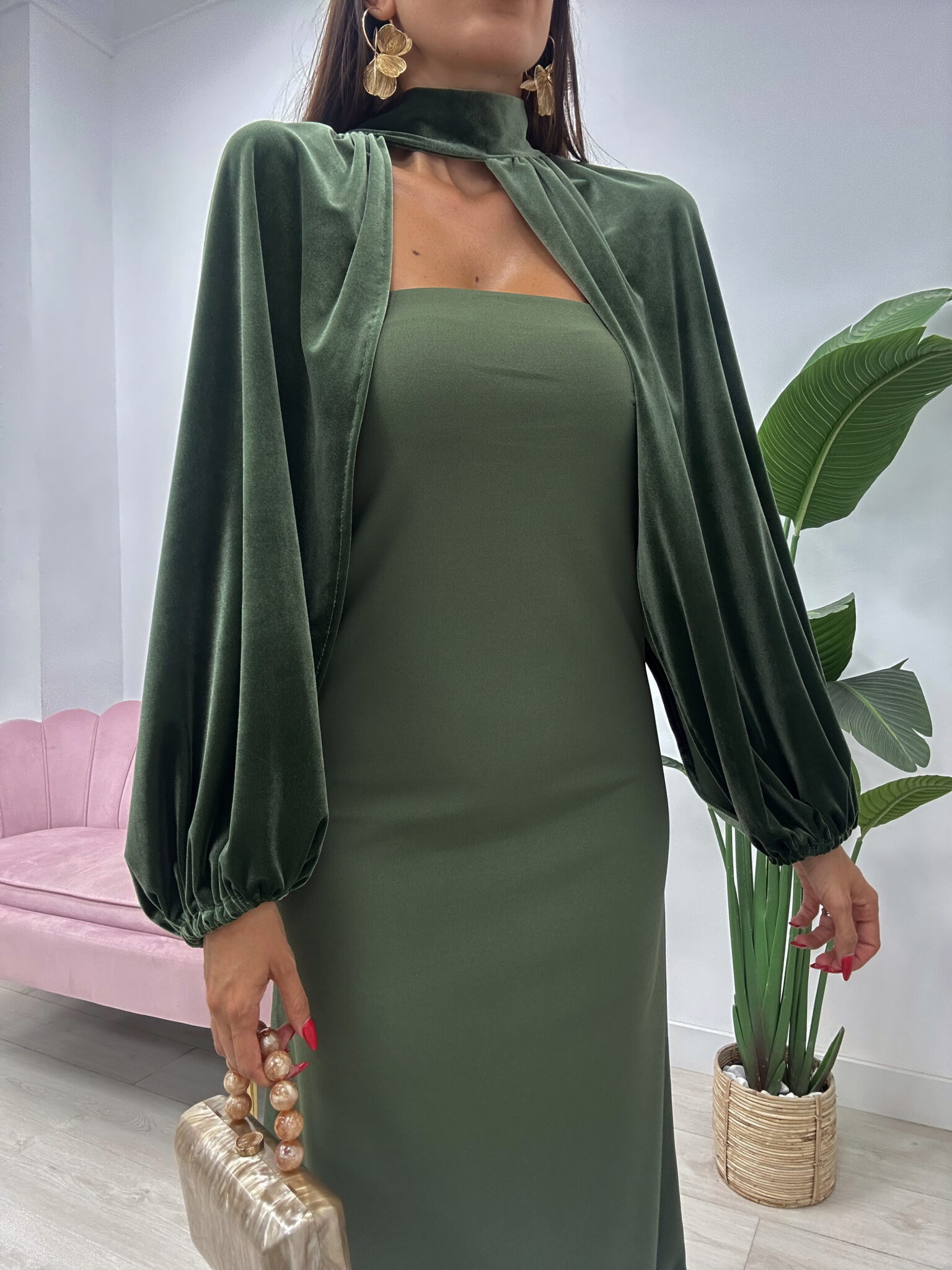 Vestido palabra de honor y capa con mangas de terciopelo incluida.