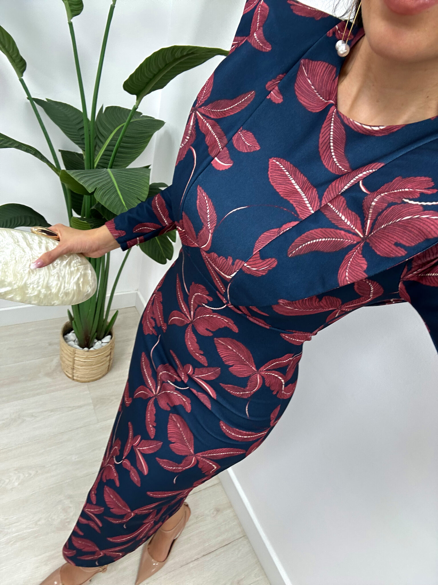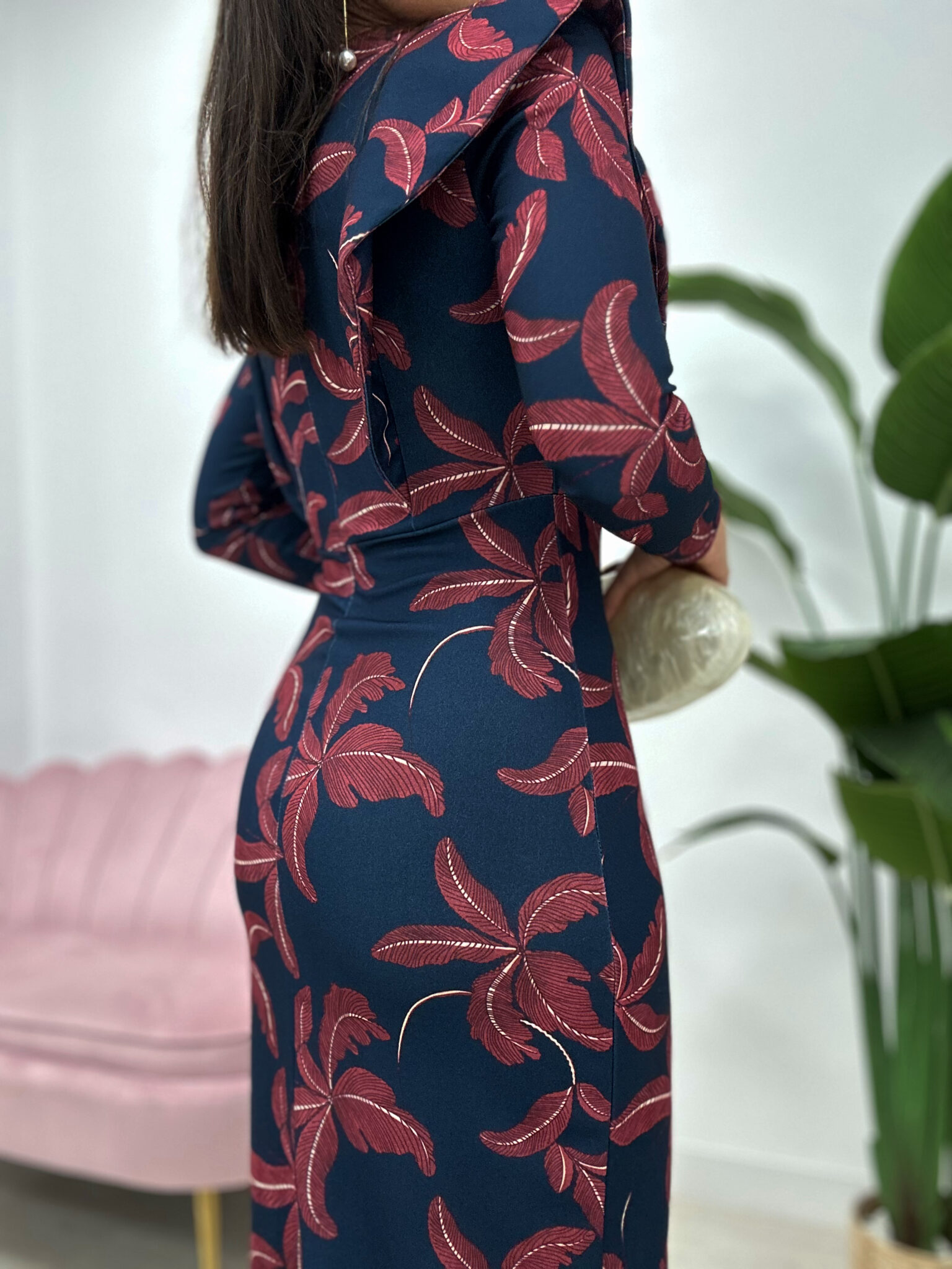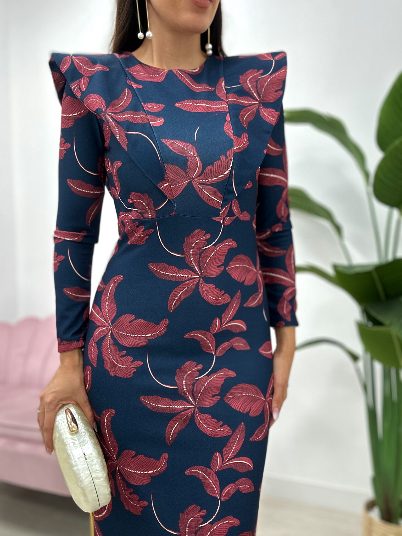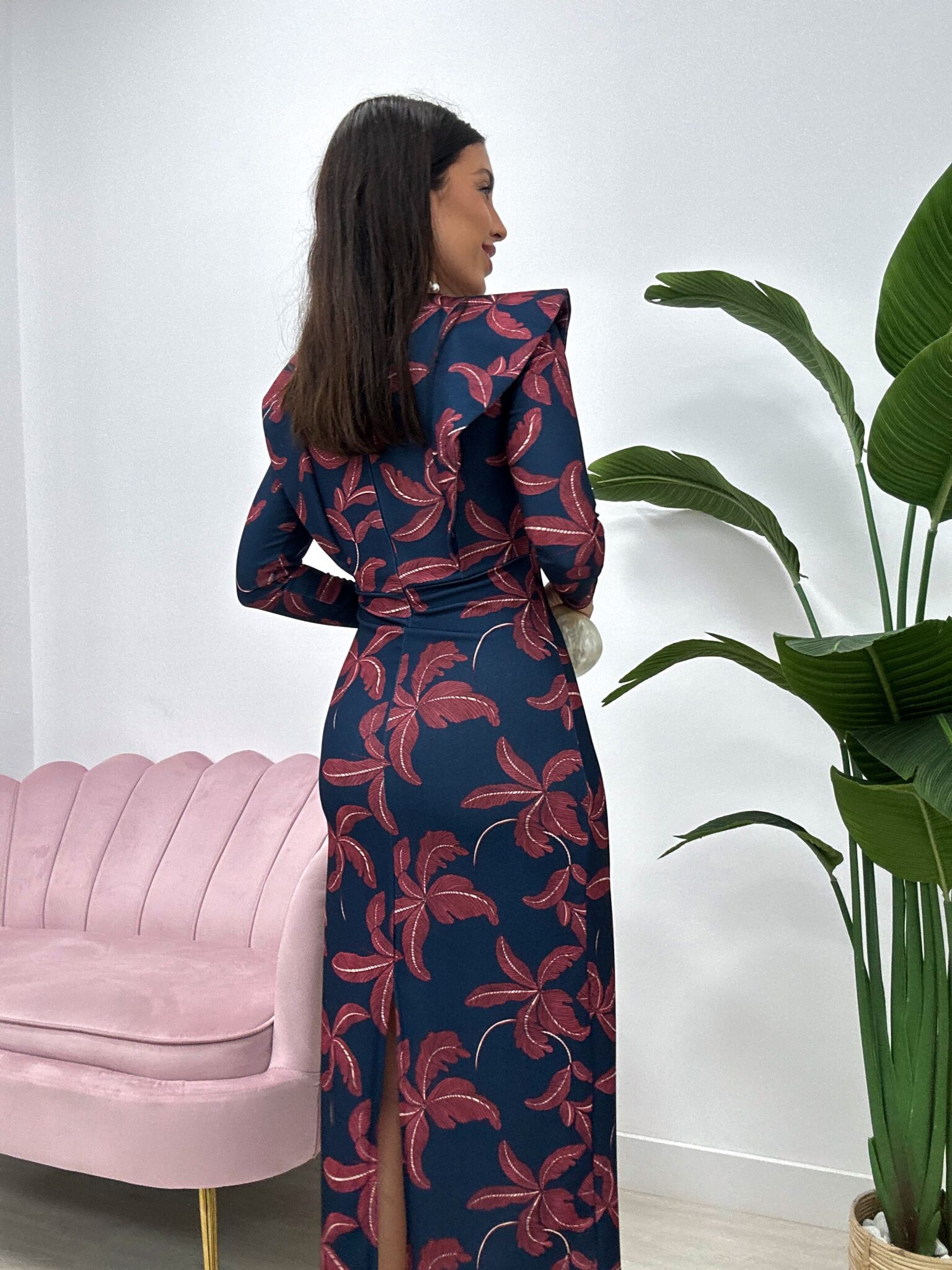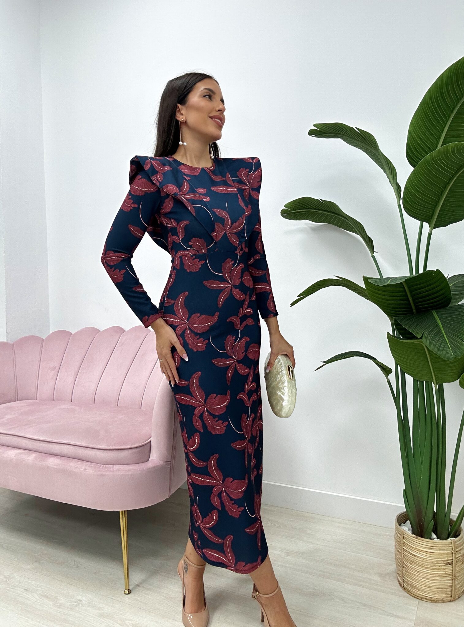 Vestido midi de corte recto y ajustado, confeccionado en tejido crepé elástico, que se adapta cómodamente a la silueta. Presenta manga larga, cuello redondo y detalle de hombreras marcadas que aportan estructura. El diseño destaca por su estampado de hojas en tono rojizo sobre fondo azul marino. Lleva cierre con cremallera invisible en la espalda y apertura en la parte trasera de la falda para facilitar la movilidad y darle un toque elegante y sofisticado.