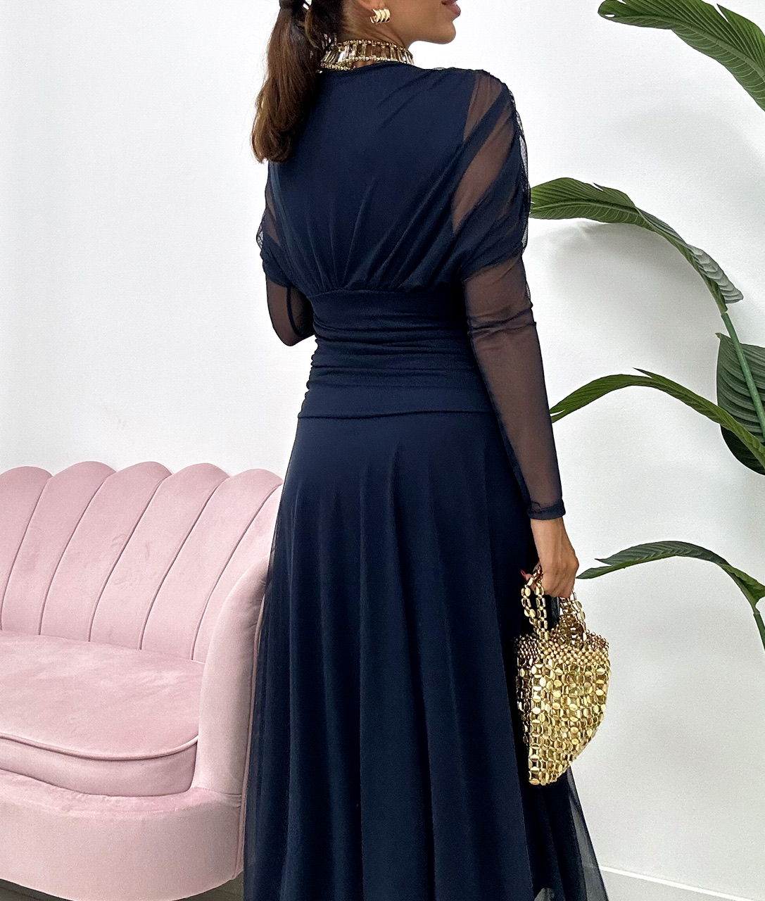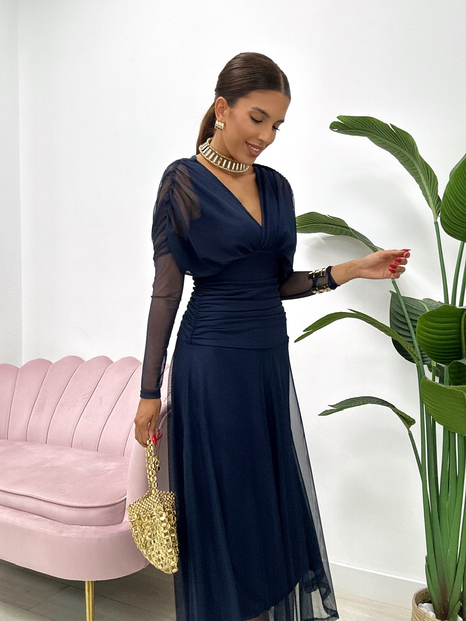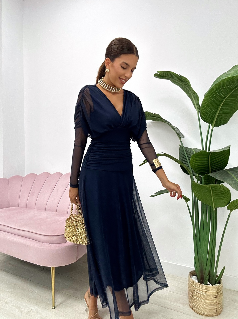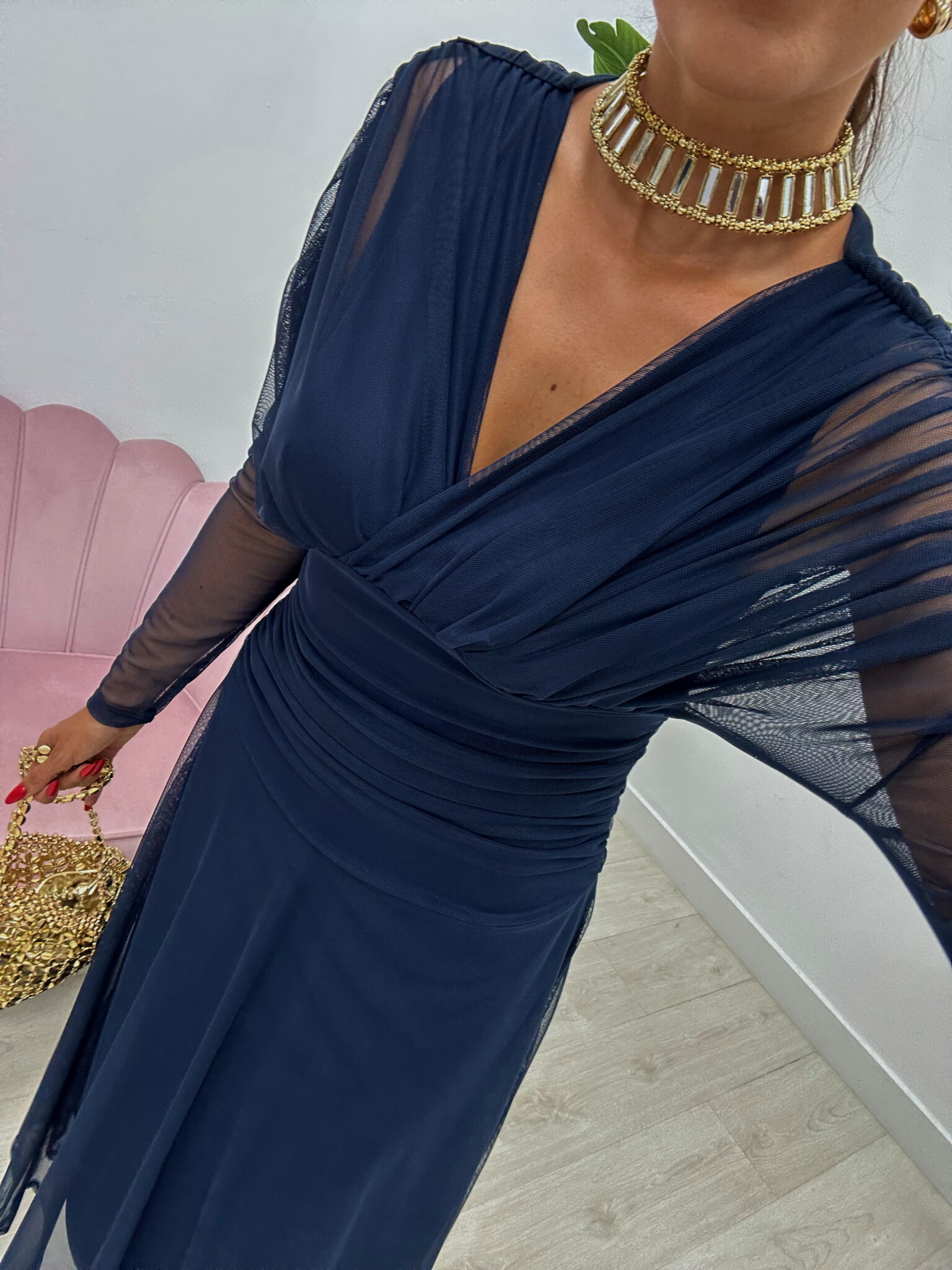 Tejido en tul con forro interior. Lleva detalle de drapeado muy favorecedor en el abdomen y transparencias en las mangas.