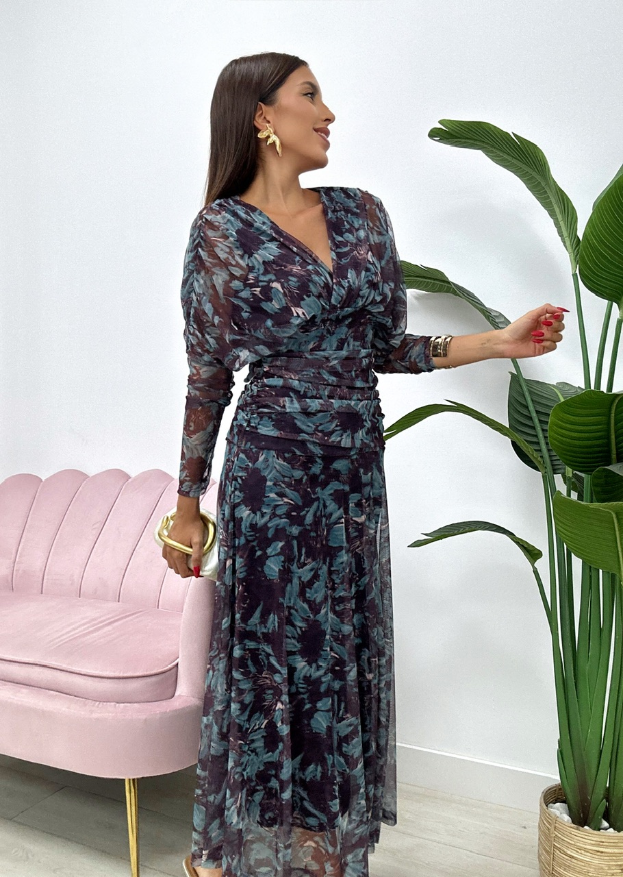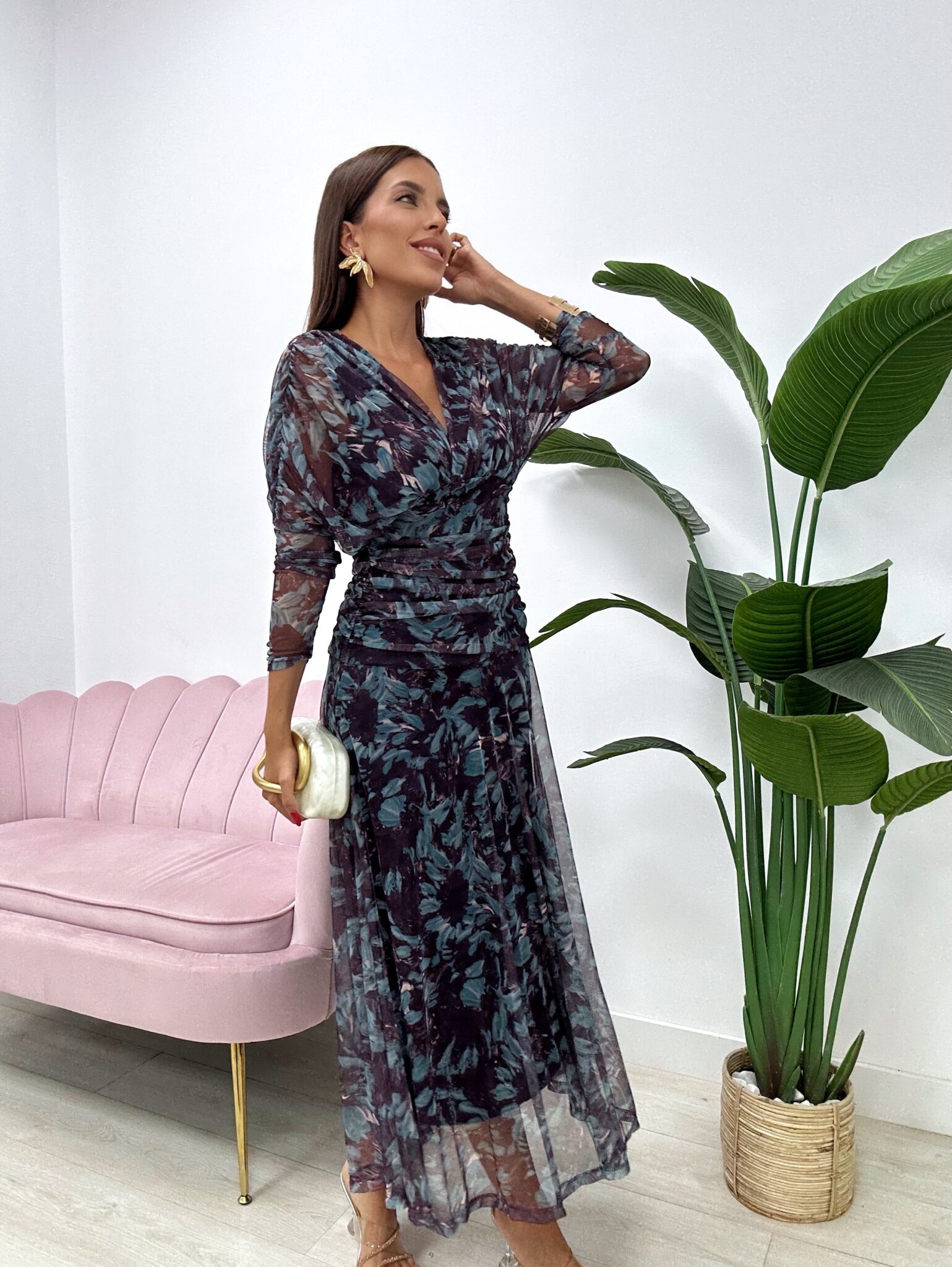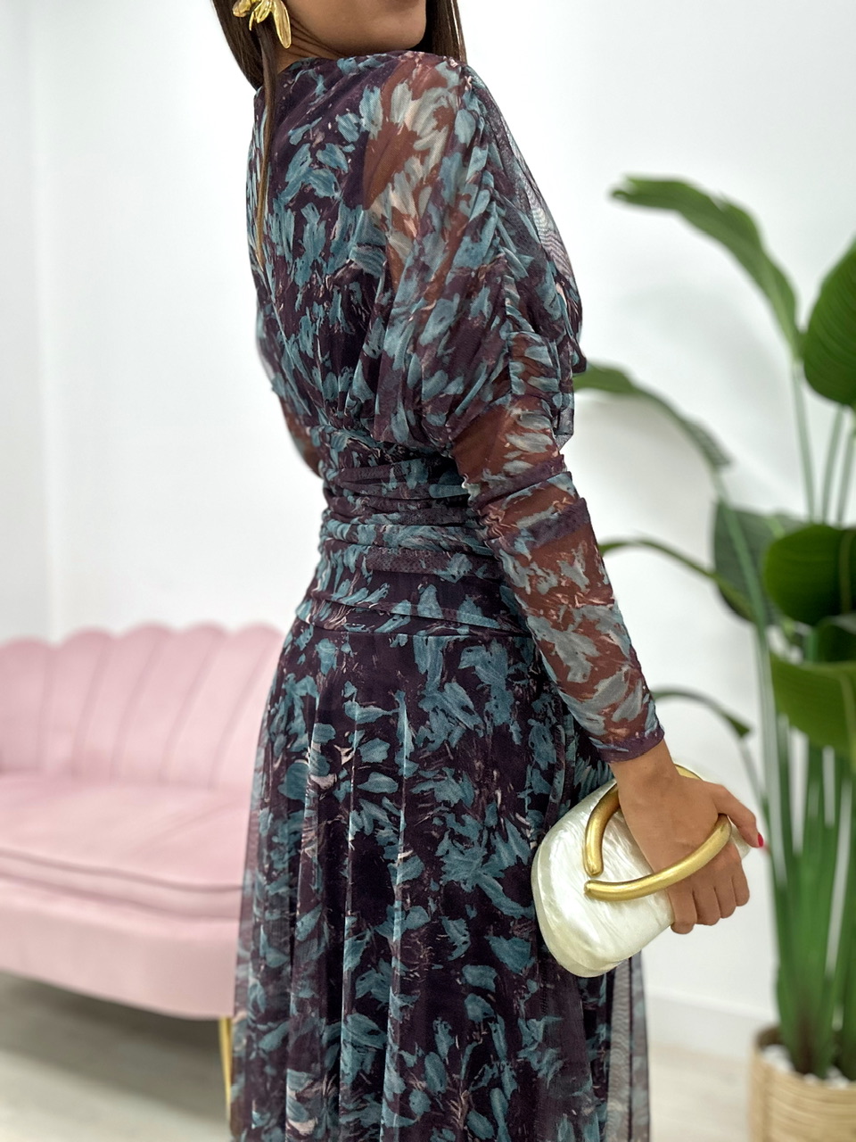Tejido en tul estampado con forro interior. Lleva detalle de drapeado muy favorecedor en el abdomen.