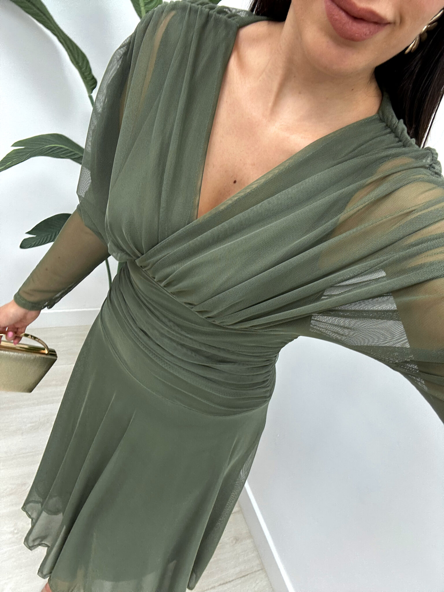 Confeccionado en un tejido vaporoso de tul con forro interior, presenta un favorecedor escote en V cruzado y mangas largas semitransparentes que añaden un toque etéreo y femenino.