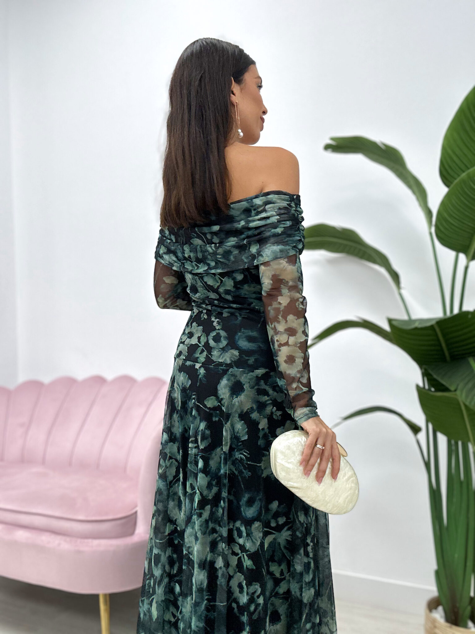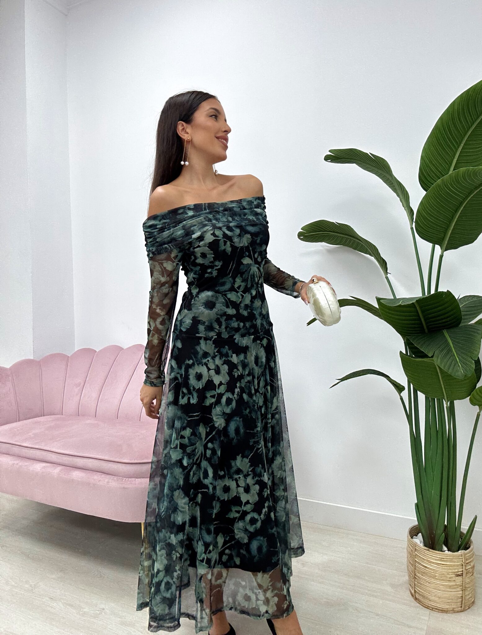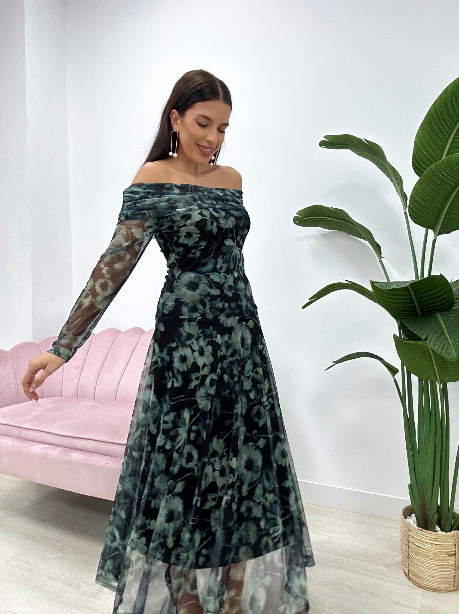 Vestido confeccionado en un delicado tejido de tul, que añade un toque etéreo y ligero al diseño. Presenta un escote bardot que permite mostrar los hombros. Las mangas son largas y están hechas del mismo material de tul, creando una continuidad visual. El forro elástico proporciona comodidad y un ajuste perfecto al cuerpo, garantizando que el vestido sea fácil de llevar. Con un estampado floral en tonos verdes sobre un fondo oscuro, el vestido irradia romanticismo y elegancia, ideal para ocasiones especiales o eventos formales. Su largo midi aporta sofisticación, mientras que la fluidez del tul añade movimiento a cada paso.