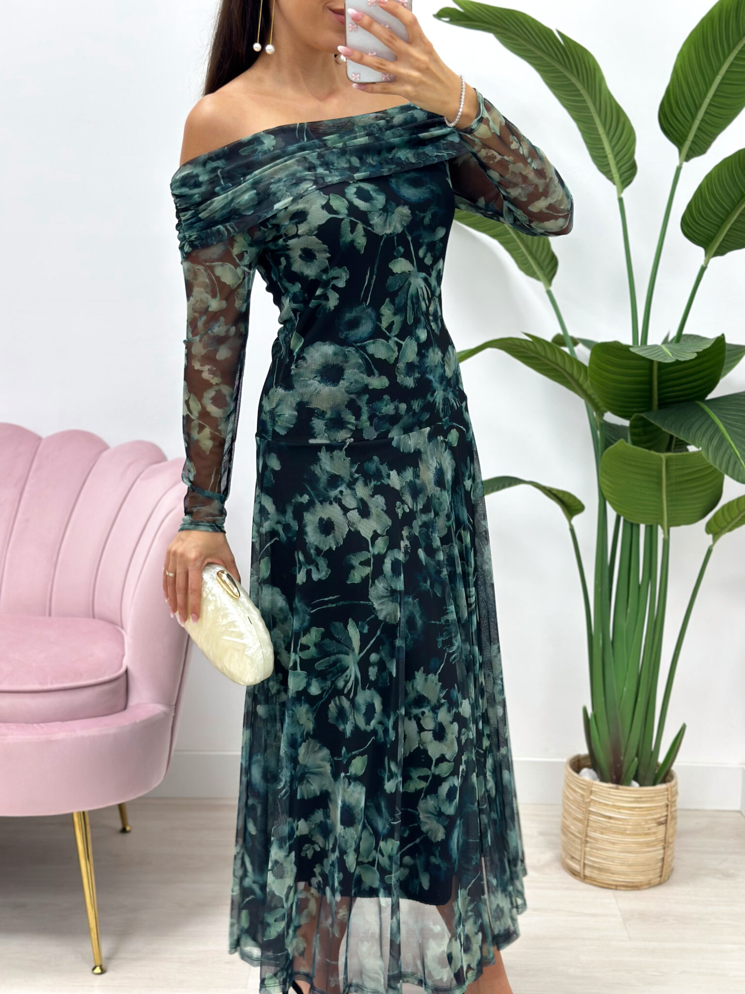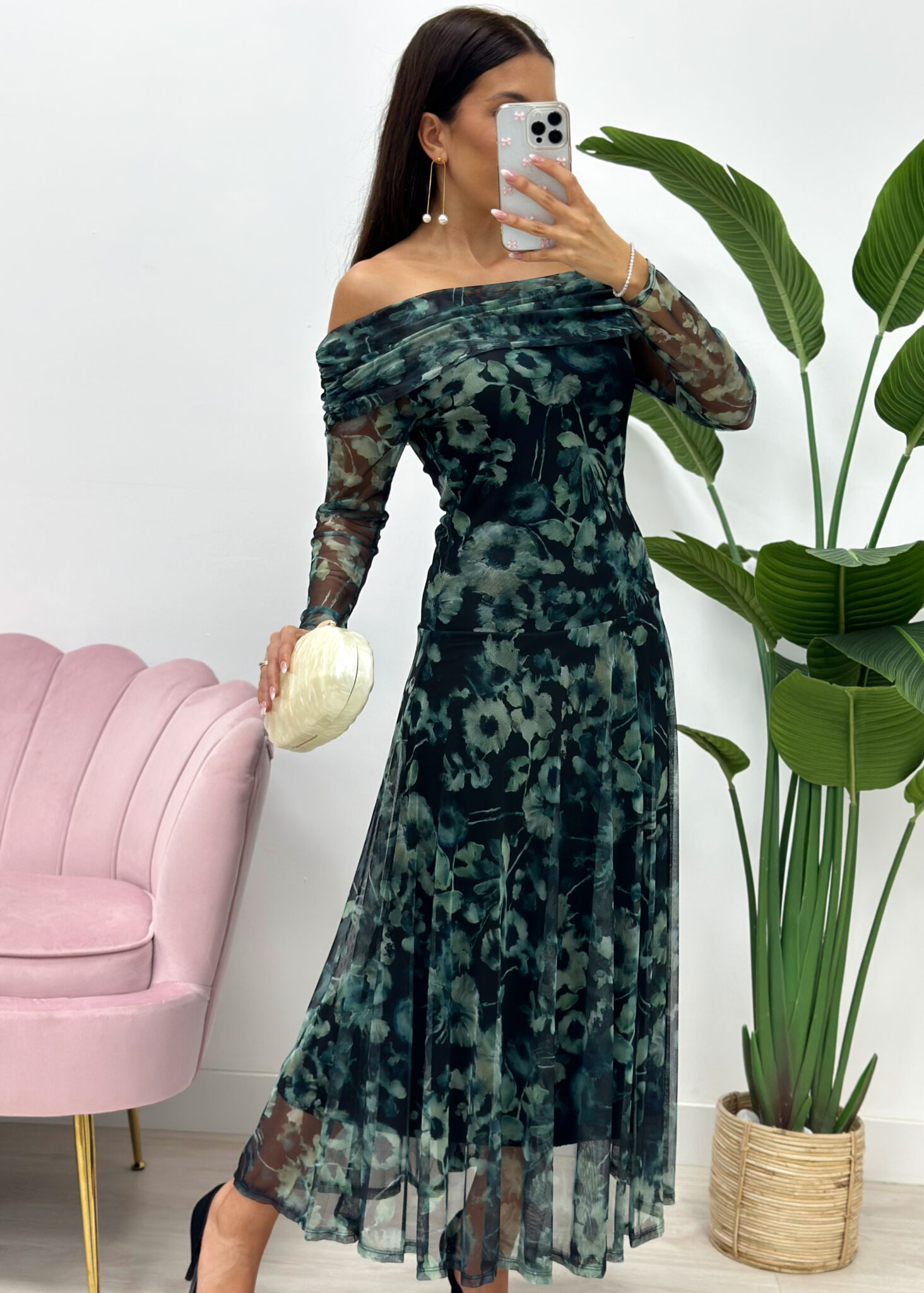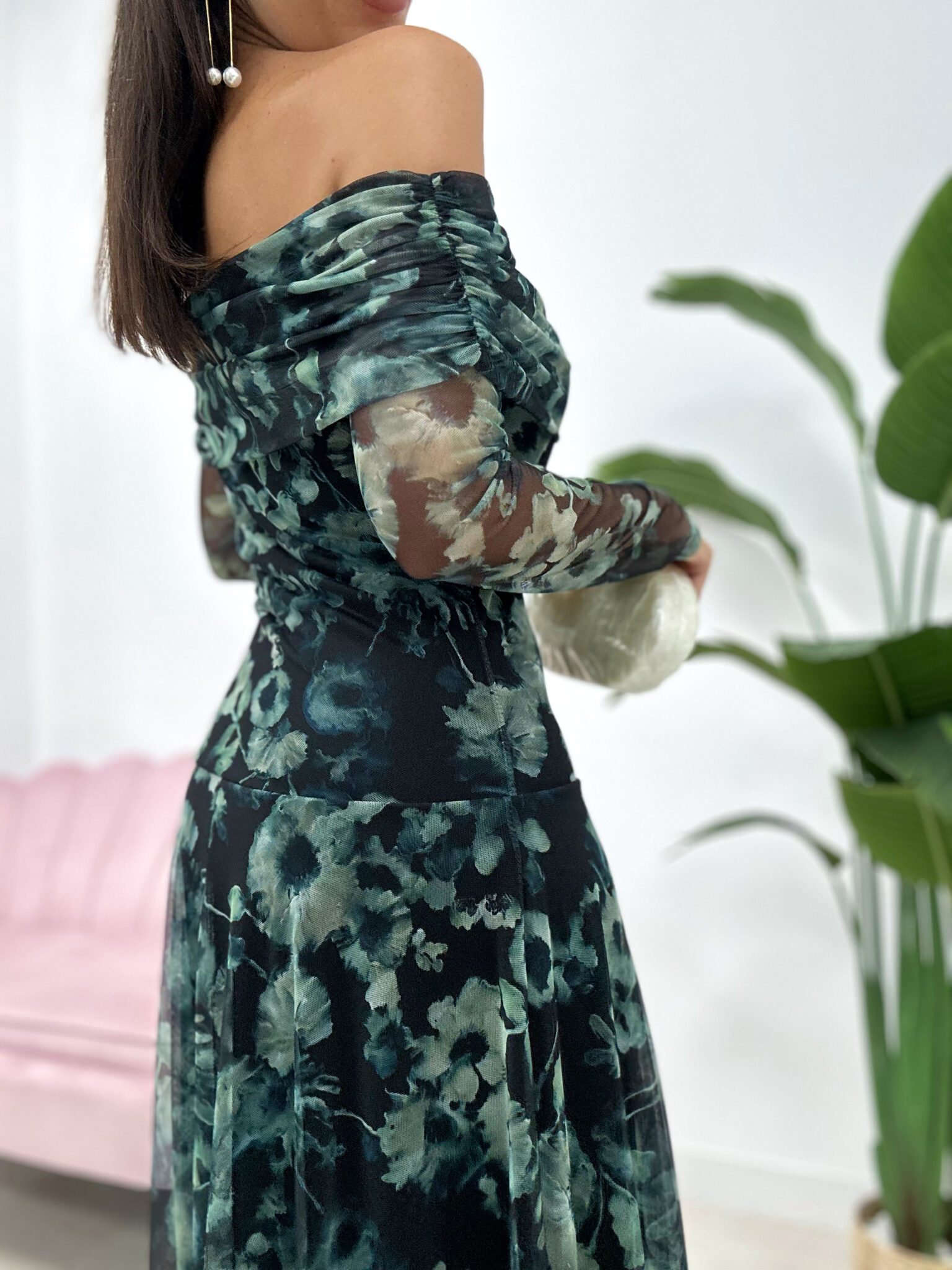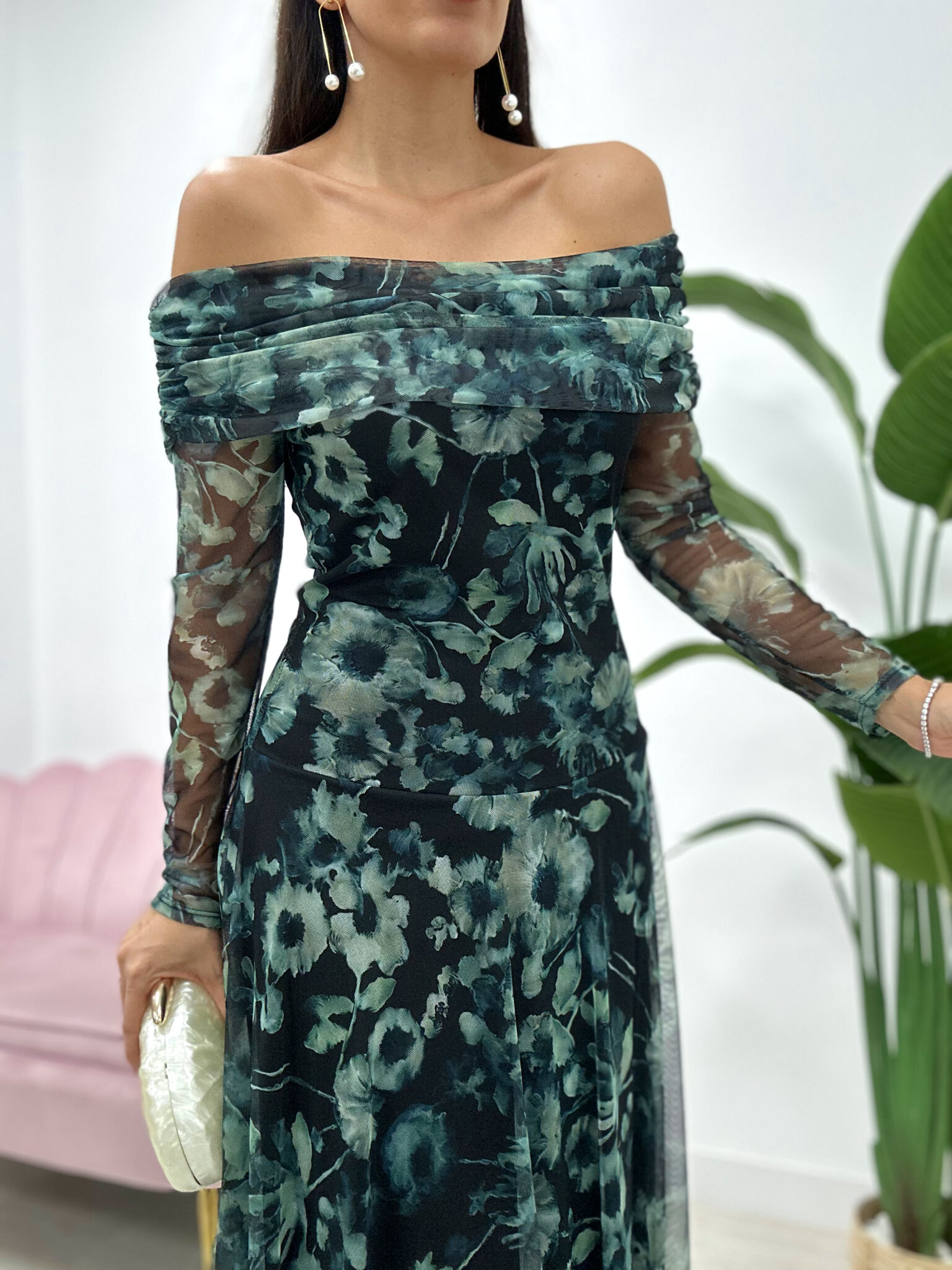 Vestido confeccionado en un delicado tejido de tul, que añade un toque etéreo y ligero al diseño. Presenta un escote bardot que permite mostrar los hombros. Las mangas son largas y están hechas del mismo material de tul, creando una continuidad visual. El forro elástico proporciona comodidad y un ajuste perfecto al cuerpo, garantizando que el vestido sea fácil de llevar. Con un estampado floral en tonos verdes sobre un fondo oscuro, el vestido irradia romanticismo y elegancia, ideal para ocasiones especiales o eventos formales. Su largo midi aporta sofisticación, mientras que la fluidez del tul añade movimiento a cada paso.